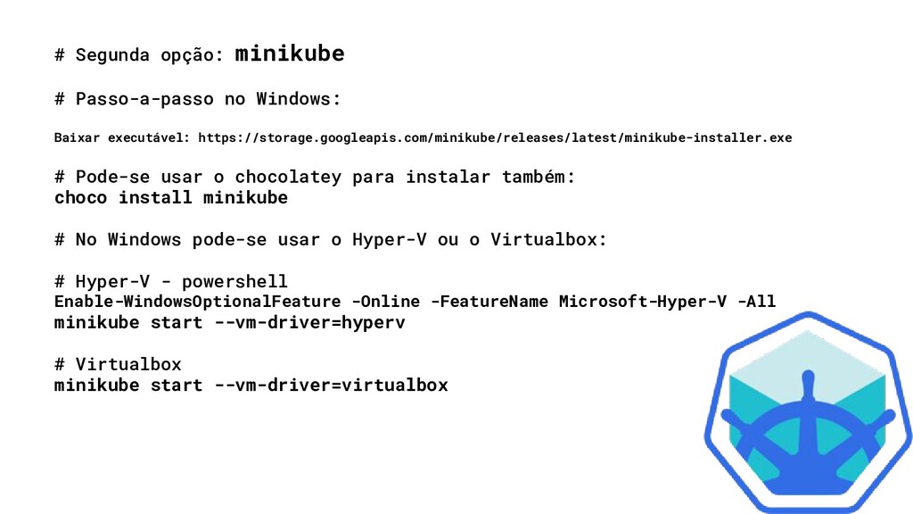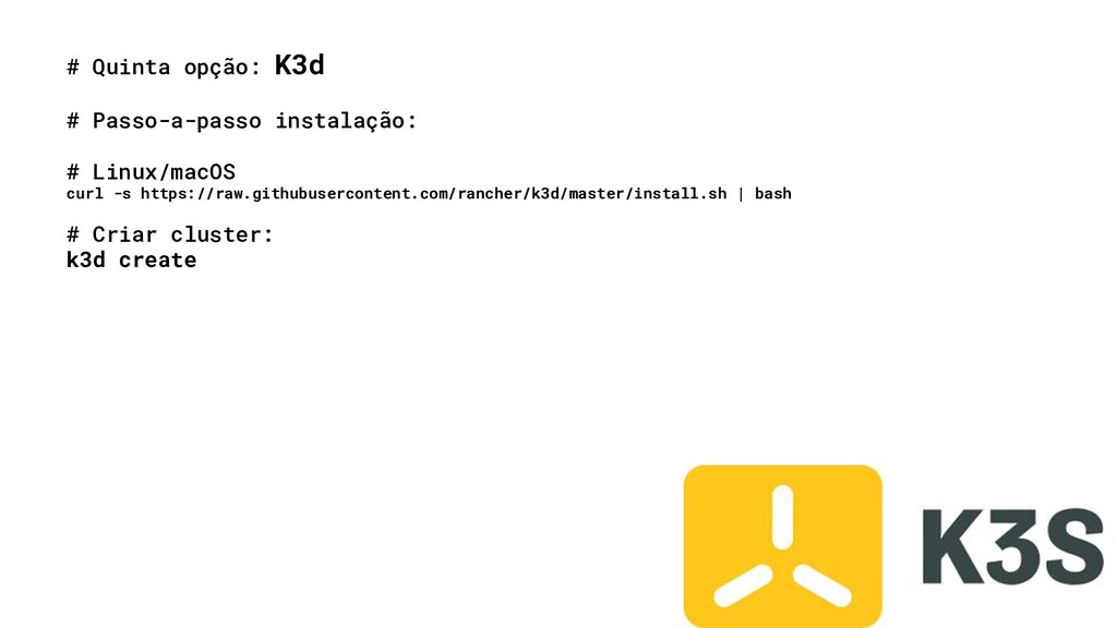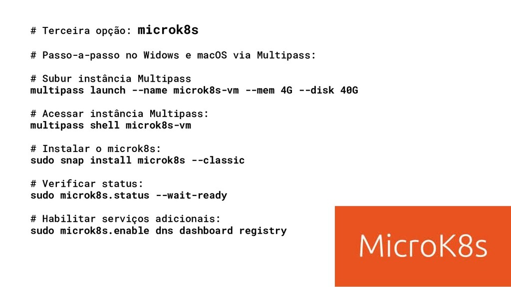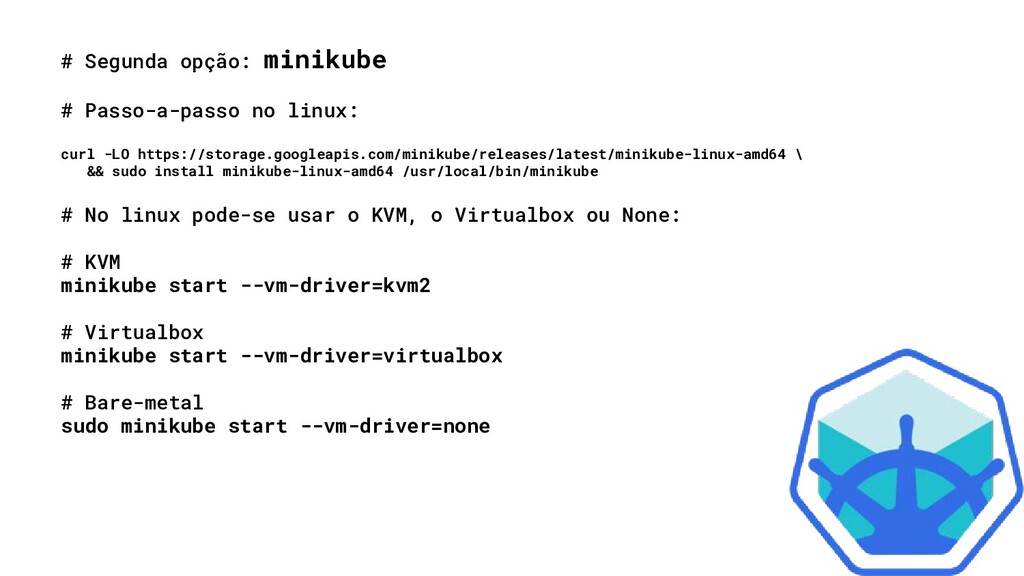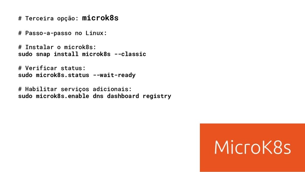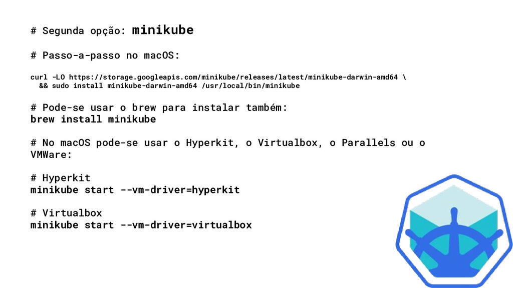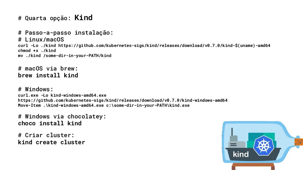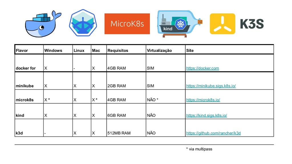 - X 4GB RAM SIM https://docker.com minikube X X X 2GB RAM SIM https://minikube.sigs.k8s.io/ microk8s X * X X * 4GB RAM NÃO * https://microk8s.io/ kind X X X 6GB RAM NÃO https://kind.sigs.k8s.io/ k3d - X X 512MB RAM NÃO https://github.com/rancher/k3d * via multipass