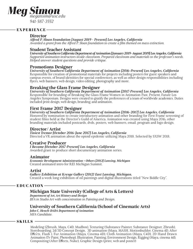 2019 - Present] Los Angeles, California Awarded a grant from the Alfred P. Sloan foundation to create a film themed on mass extinction. Student Teacher Assistant University of Southern California Department of Animation [January 2019 - August 2019] Los Angeles, California Supported animation instructors inside classroom. Prepared classroom and materials to the professor’s needs. Helped answer student questions and provide critique. Promotions Designer University of Southern California Department of Animation [2016-Present] Los Angeles, California Responsible for creation of promotional materials for projects including posters for guest speakers and campus events, of brand identities for special conferences, as well as other design responsibilities including flyers, web banners, web design, video editing, photography and more. Breaking the Glass Frame Designer University of Southern California Department of Animation [2017-Present] Los Angeles, California Responsible for branding of Breaking the Glass Frame Women in Animation Past, Present, Future Los Angeles Symposium. Designs were created to gratify the preferences of a team of worldwide academics. Duties included print design, web design, branding, and animation. First Frame 2017 Designer University of Southern California Department of Animation [2016-2017] Los Angeles, California Honored by nomination to create introductory animation and other branding for First Frame screening of student films held at the Director's Guild of America. Animation was created using Maya 2016, other branding materials included postcards, dvds, posters, web banners, email, program and logo design. Director/ Artist Tiniest Tremor [October 2016-]une 2017] Los Angeles, California Directed a VR animation about the opioid epidemic utilizing Maya 2018. Selected by SXSW 2018. Creative Producer I Became [October 2017-Present] Los Angeles, California Awarded grant to produce short documentary animation series. Animator Economic Development Administration + Others [2012] Lansing, Michigan Created animated intro for REI Michigan Summit. Artist Gallery Exhibition at Kresge Gallery {2012} East Lansing, Michigan. Created a week long exhibition of oil paintings and digital illustrations titled “New Biddle City”. Michigan State University (College of Arts & Letters) Department of Art, Art History and Design BFA in Studio Art with concentration in Painting and Design. University of Southern California (School of Cinematic Arts) John C. Hench-DADA Department of Animation MFA Candidate. Modeling (Zbrush, Maya, C4D, Mudbox), Texturing (Substance Painter, Substance Designer, Zbrush), Storyboarding, 2d/3D Concept Design, 3D animation (Maya, MASH, Motionbuilder, Cinema 4D, After Effects, Flash ), Fur Animation (Maya, Cinema 4D), Cloth Animation (Maya, C4D), 2D Hand Drawn Animation (Tv Paint, Photoshop), Illustration, Painting, Environment Design, Rigging (Maya, cinema 4d), Compositing (After Effects, Nuke), Graphic Design (print, web and poster) EXPERIENCE EDUCATION SKILLS
