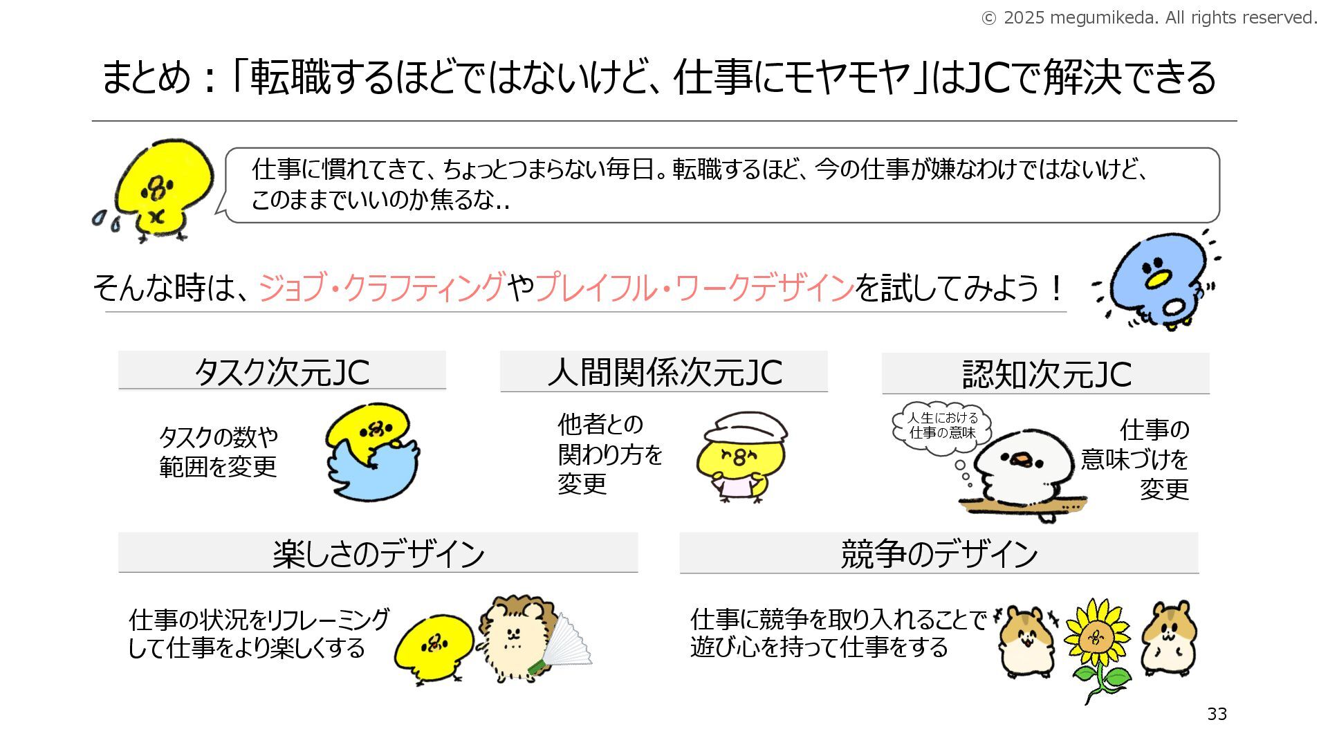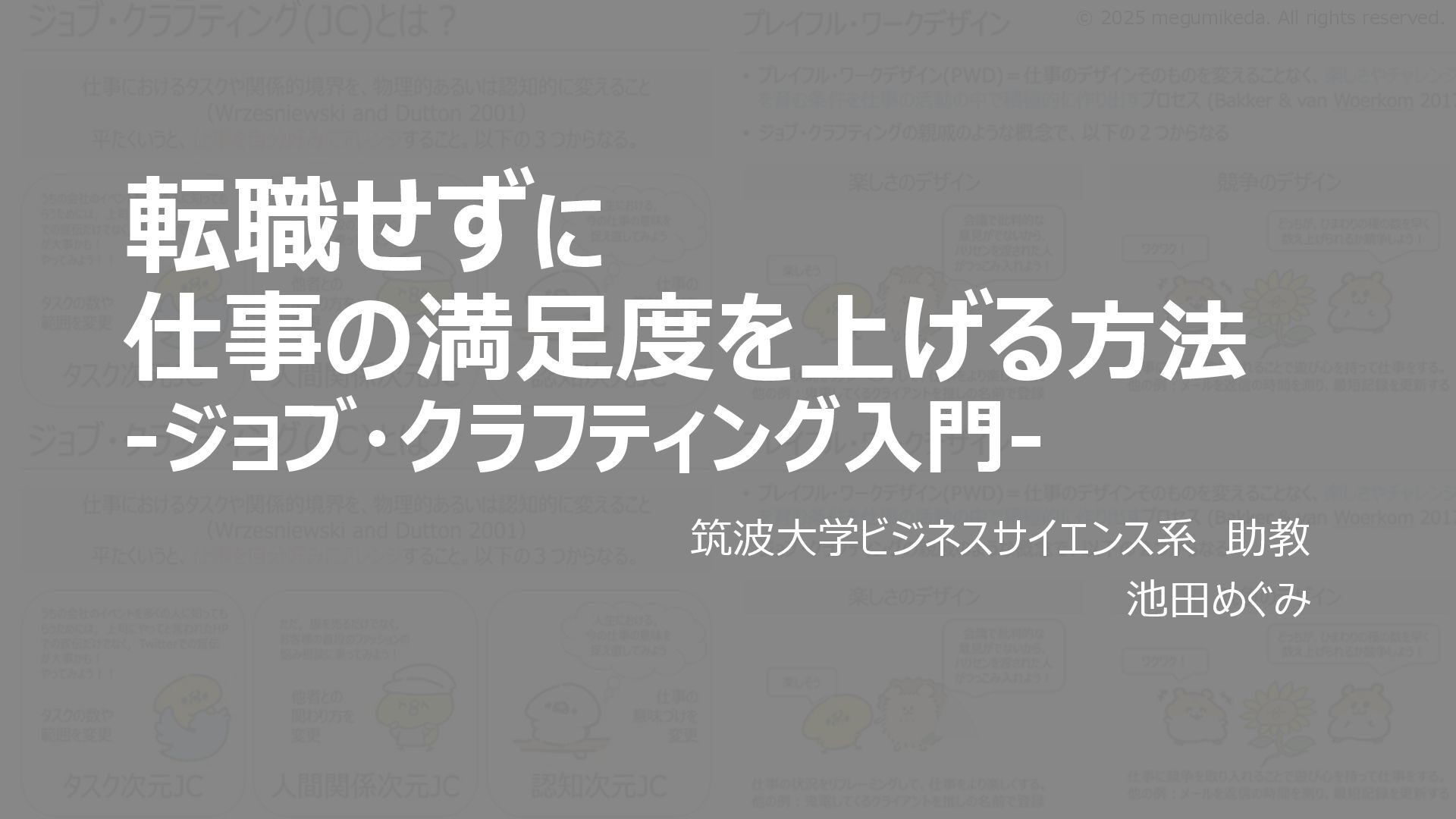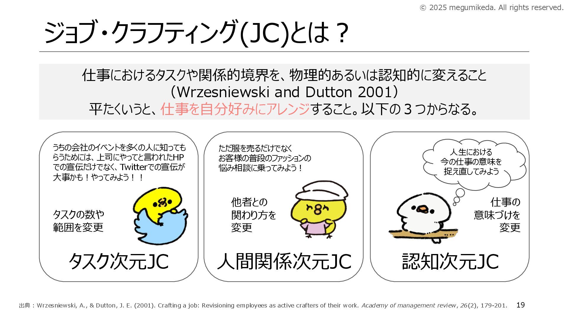 そんな人に向けて、ジョブ・クラフティング研究にもとづき、「転職しなくても、今の仕事をもっと満足できるようにする方法」をまとめました🐣