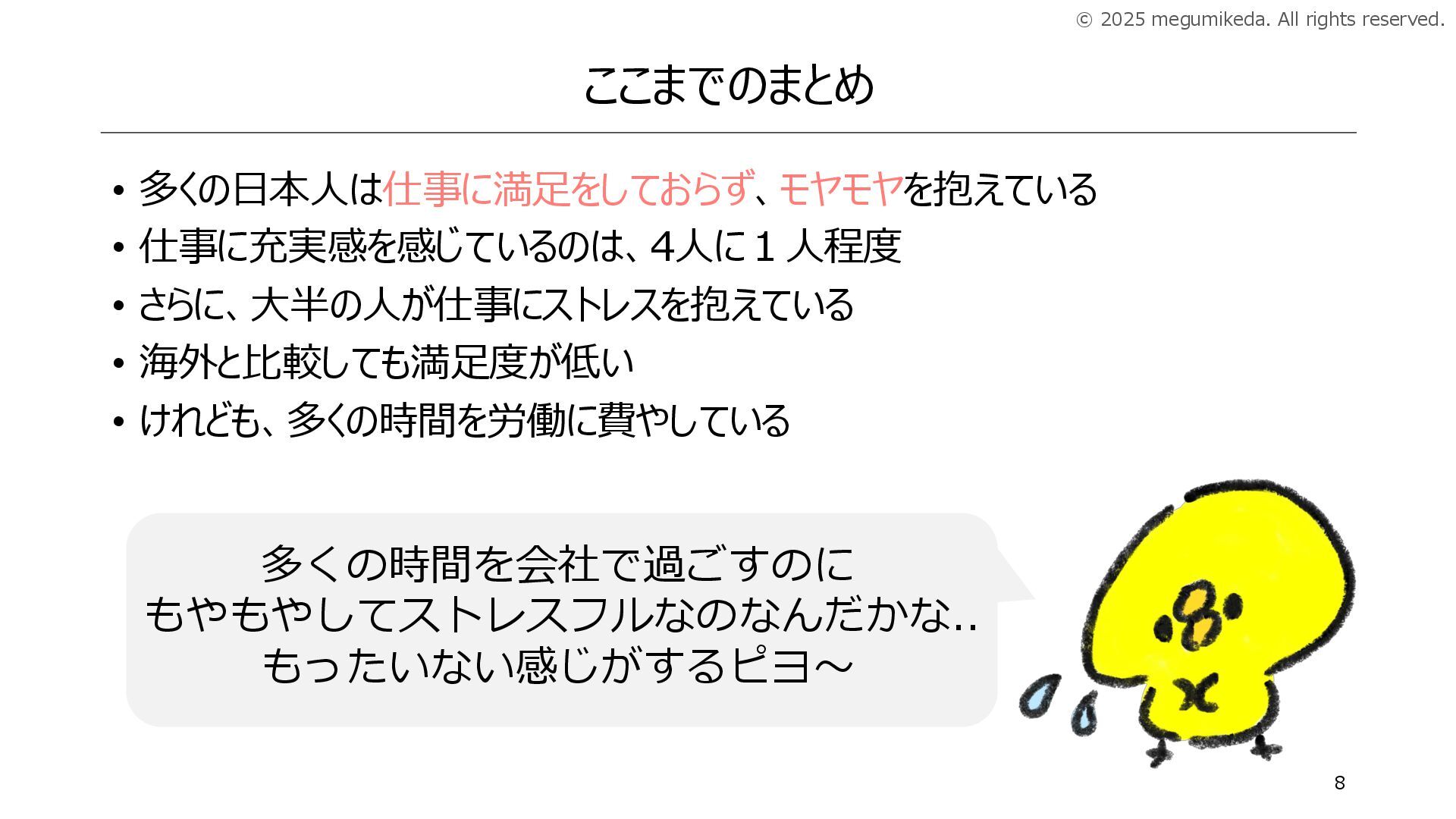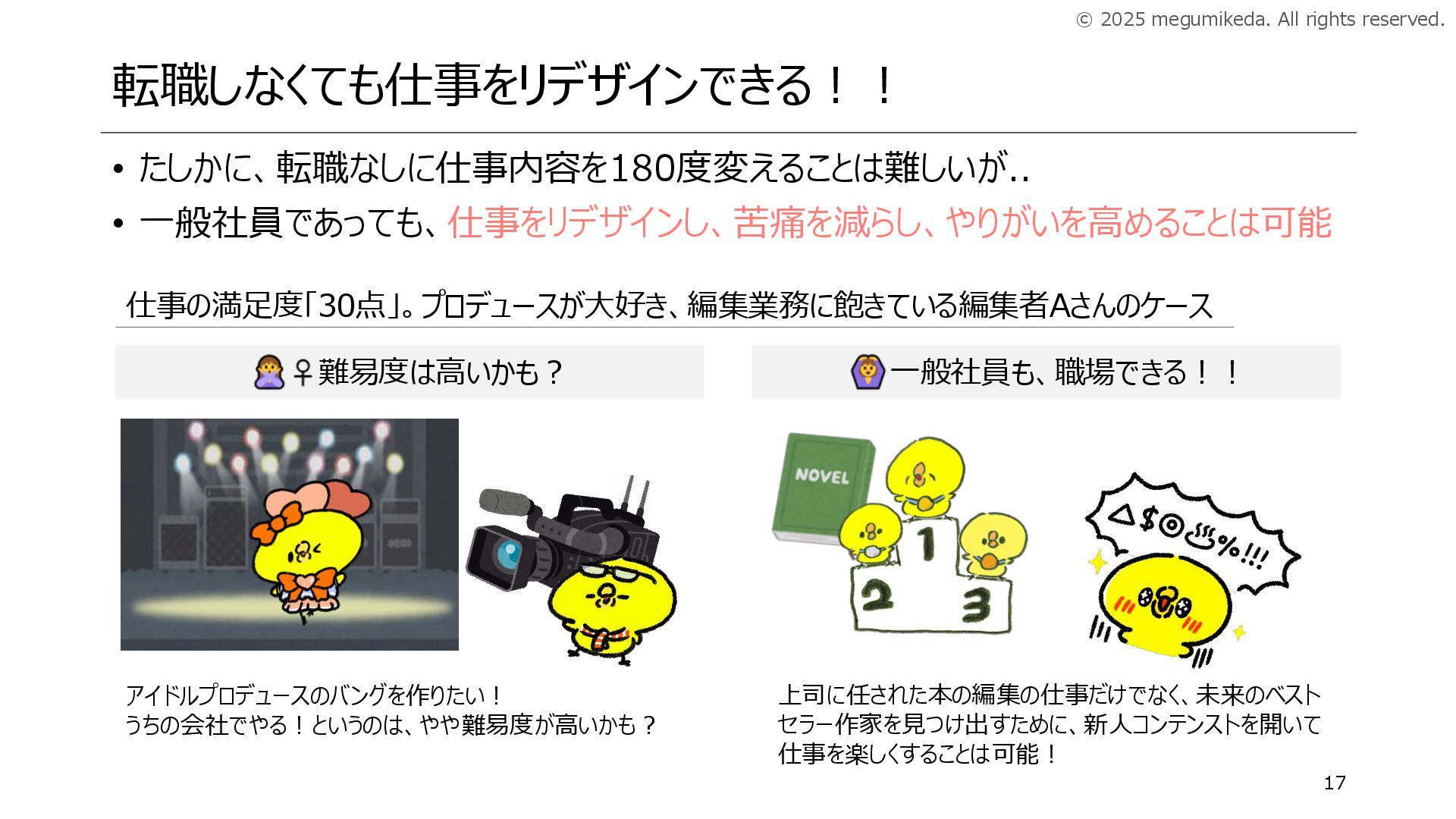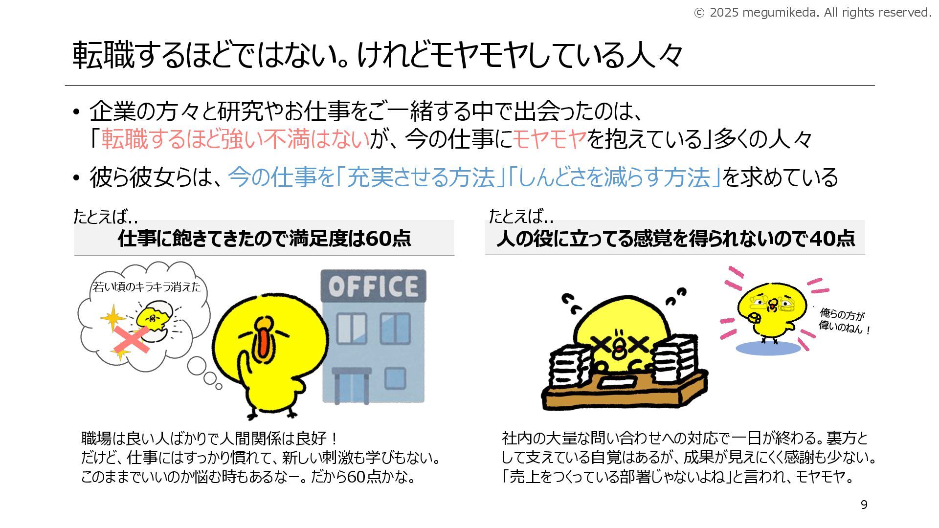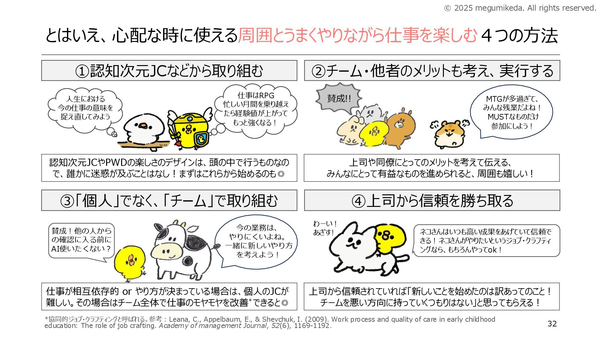 そんな人に向けて、ジョブ・クラフティング研究にもとづき、「転職しなくても、今の仕事をもっと満足できるようにする方法」をまとめました🐣