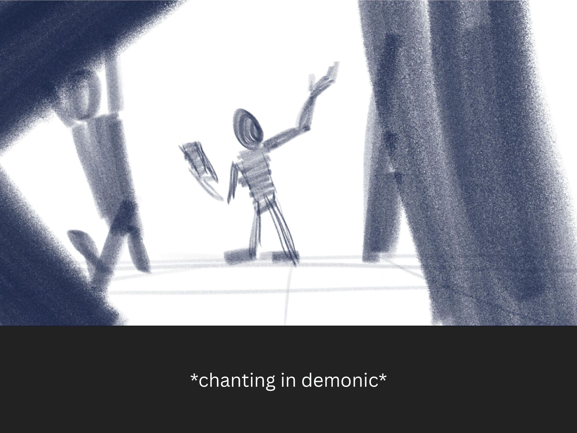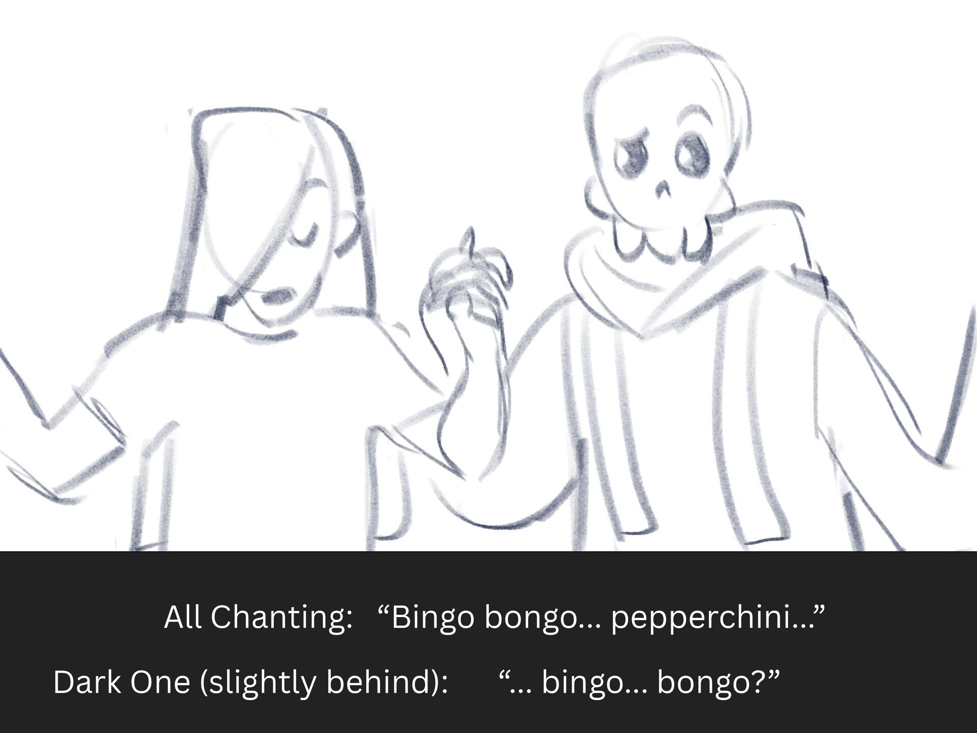 All Chanting: “Bingo bongo... pepperchini...” Dark One (slightly behind): “...
