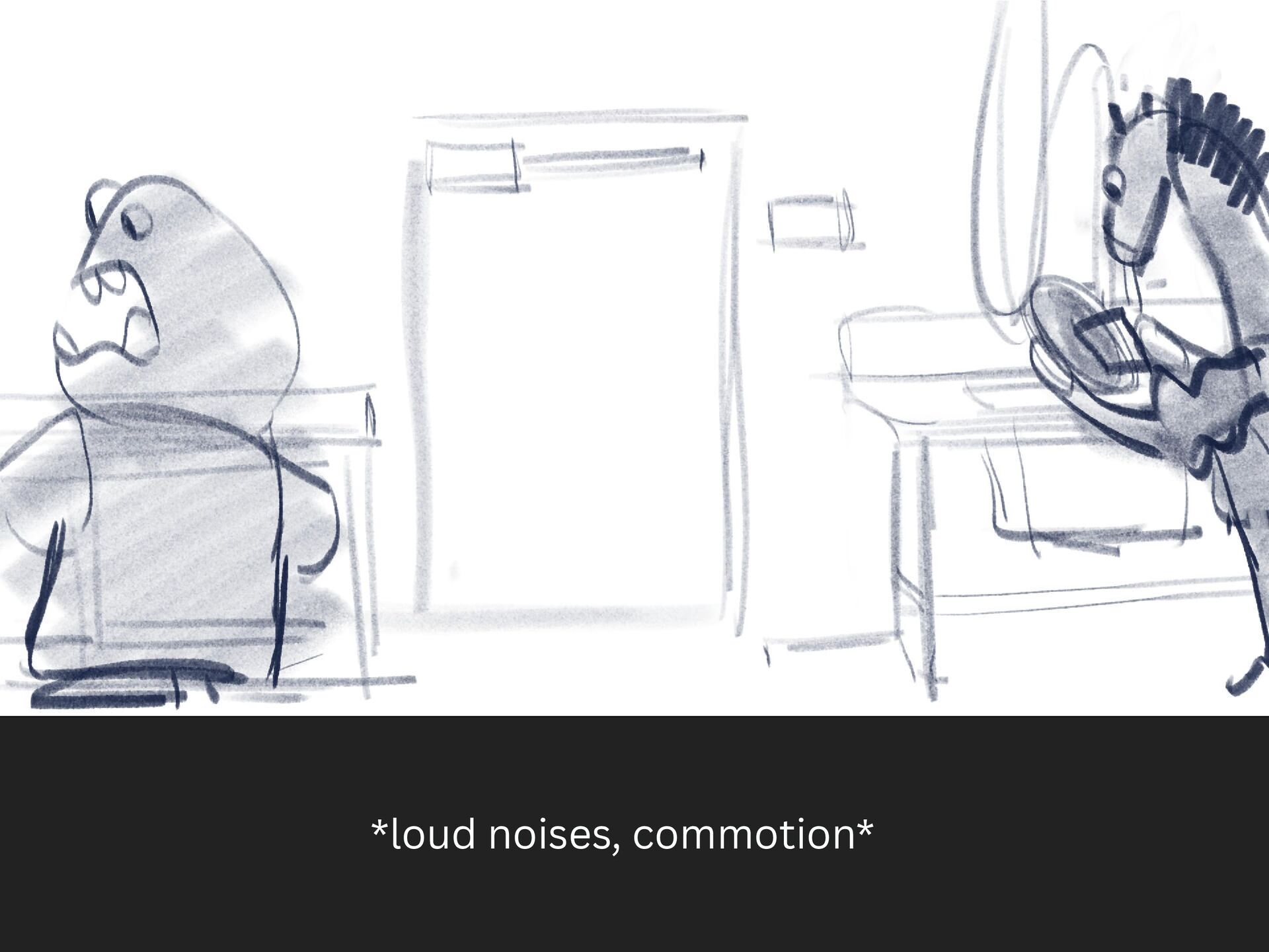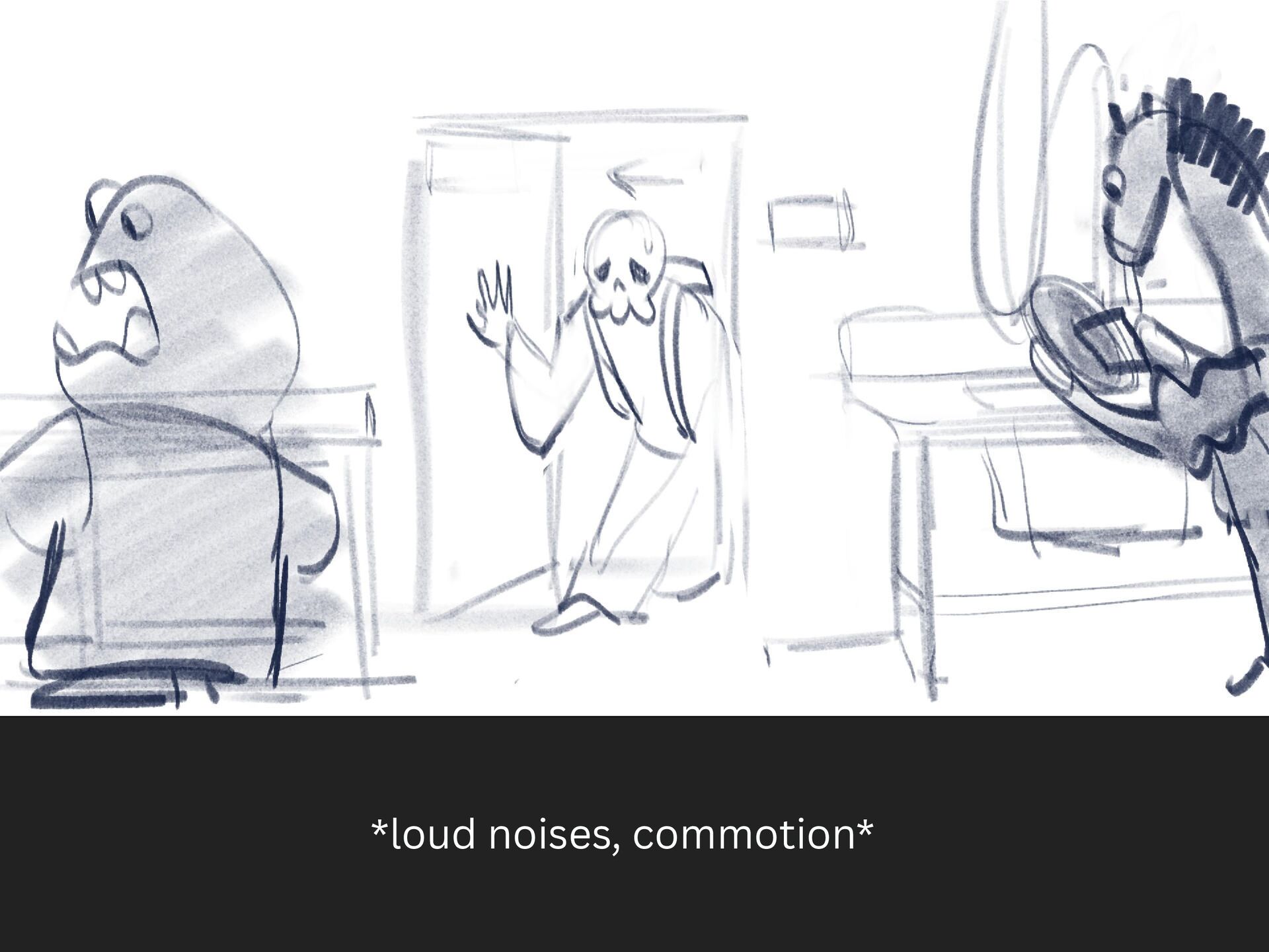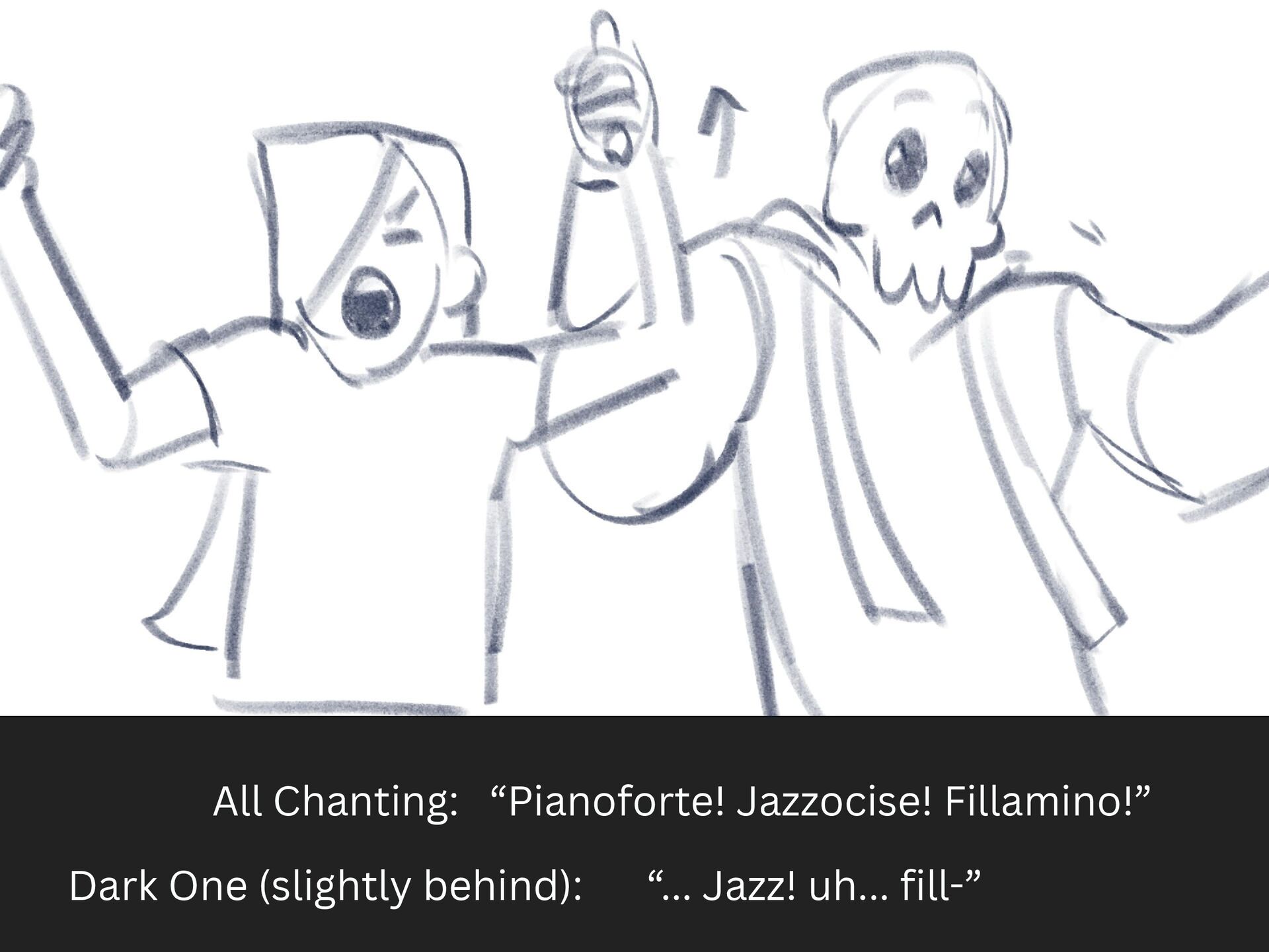 All Chanting: “Pianoforte! Jazzocise! Fillamino!” Dark One (slightly behind): “...