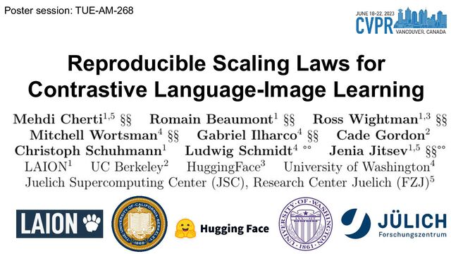 - Based openly available data (LAION-400M,2B) - Using open source software (OpenCLIP) Evaluation: - Zero-shot classification & retrieval, linear probing, full fine-tuning. Our Findings: - Improvement on downstream tasks with scale, following a power-law - Bottlenecks with small data scale/samples seen - Task specific scaling laws: advantage of OpenCLIP LAION over OpenAI’s CLIP on retrieval, advantage of OpenAI’s CLIP on classification We open source code, full checkpoints and training/eval workflow ImageNet