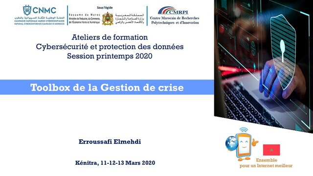 données personnelles, bancaires, stratégiques… ➢ Leur sensibilité : confidentialité, intégrité, disponibilité ➢ Leur attractivité : quelles sont les informations qui peuvent avoir un intérêt et une valeur pour un cybercriminel et à quelles fins ➢ Leur localisation : sur quels supports (CMDB), dans quelles applications, et comment sont-elles sauvegardées ➢ Leur circulation et « cycle de vie » : qui en est propriétaire et qui les administre , qui a accès à ces données et quels sont les processus métiers concernés ,… Se préparer à gérer une crise Cyber Ensemble pour un Internet meilleur CMRP: Ateliers de formation Cybersécurité et protection des données Session printemps 2020 Erroussafi Elmehdi 11 -12-13 Mars 2020, Kénitra