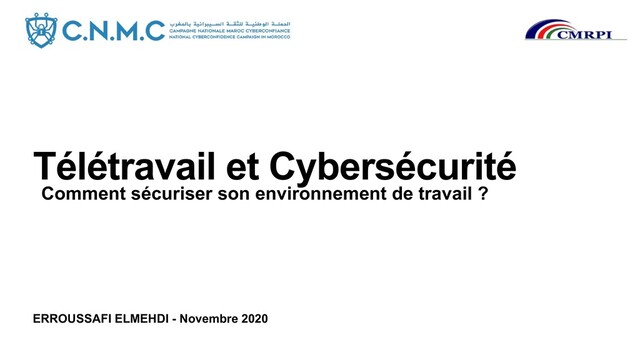 code du travail • Dans ce contexte inédit causé par la pandémie Covid-19, le code du travail (Loi N° 65.99. B.O 5167 du 28 Déc. 2003) démontre son imperfection et son incapacité face à des questions juridiques pertinentes. • Si le Code du Travail fait allusion dans son article 8 à la possibilité de recourir au travail à domicile, il semblerait que l’esprit du législateur ne visait pas le télétravail tel que pratiqué durant cette période exceptionnelle mais plutôt les salariés travaillant sous forme coopérative ou artisanale. • Une véritable réflexion est en cours pour un amendement du Code du Travail. Et comme pour plusieurs secteurs il y aura un avant et un après covid-19. • Il est donc nécessaire de bien accompagner le collaborateur dans la pratique du télétravail, et notamment en terme de cybersécurité et risque sur les actifs informationnels de l’entreprise en télétravail.