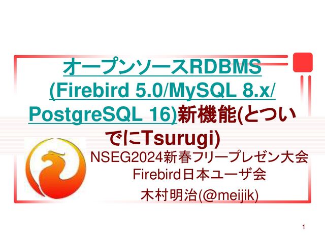 1 オープンソースRDBMS (Firebird 5.0/MySQL 8.x/ PostgreSQL 16)新機能(とつい でにTsurugi) NSEG2024新春フリープレゼン大会 Firebird日本ユーザ会