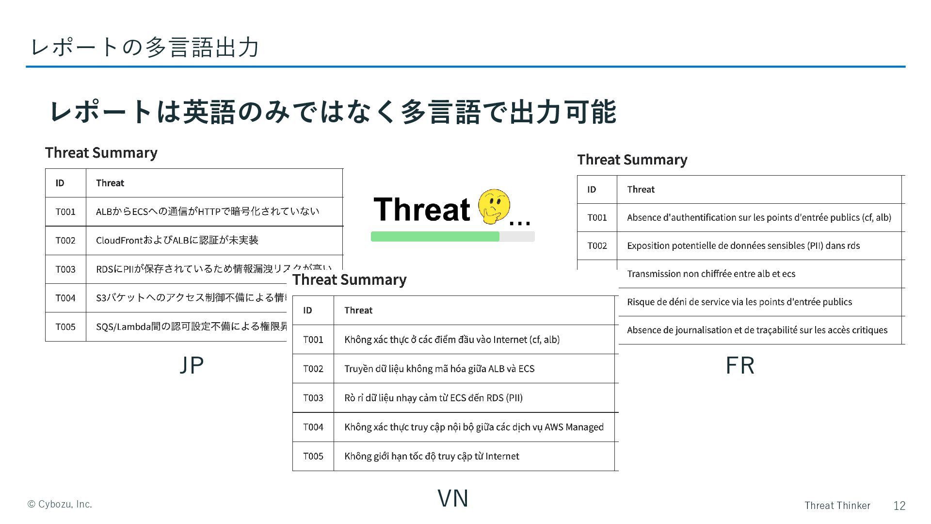 Threat Thinker ©️ Cybozu, Inc. レポートは英語のみではなく多言語で出力可能 12 レポートの多言語出力 JP VN