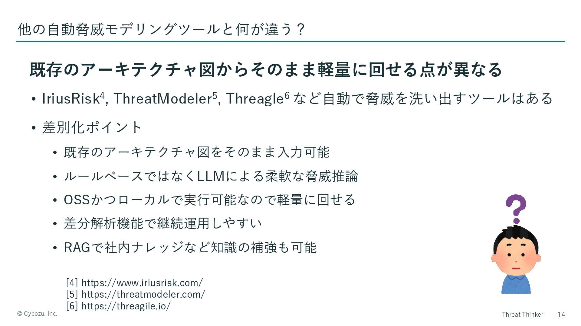 Threat Thinker ©️ Cybozu, Inc. • IriusRisk4, ThreatModeler5, Threagle6 など自動で脅威を洗い出すツールはある