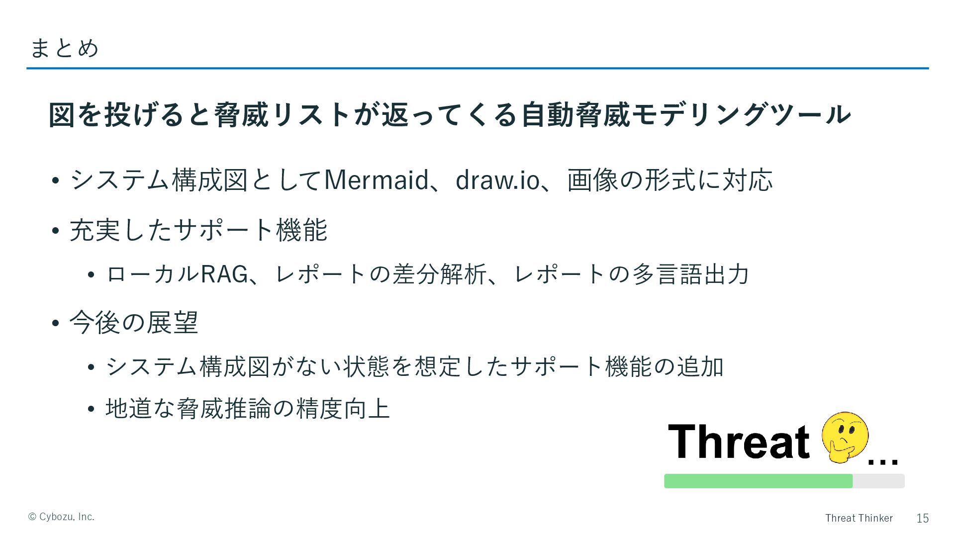 Threat Thinker ©️ Cybozu, Inc. • システム構成図としてMermaid、draw.io、画像の形式に対応 • 充実したサポート機能 •