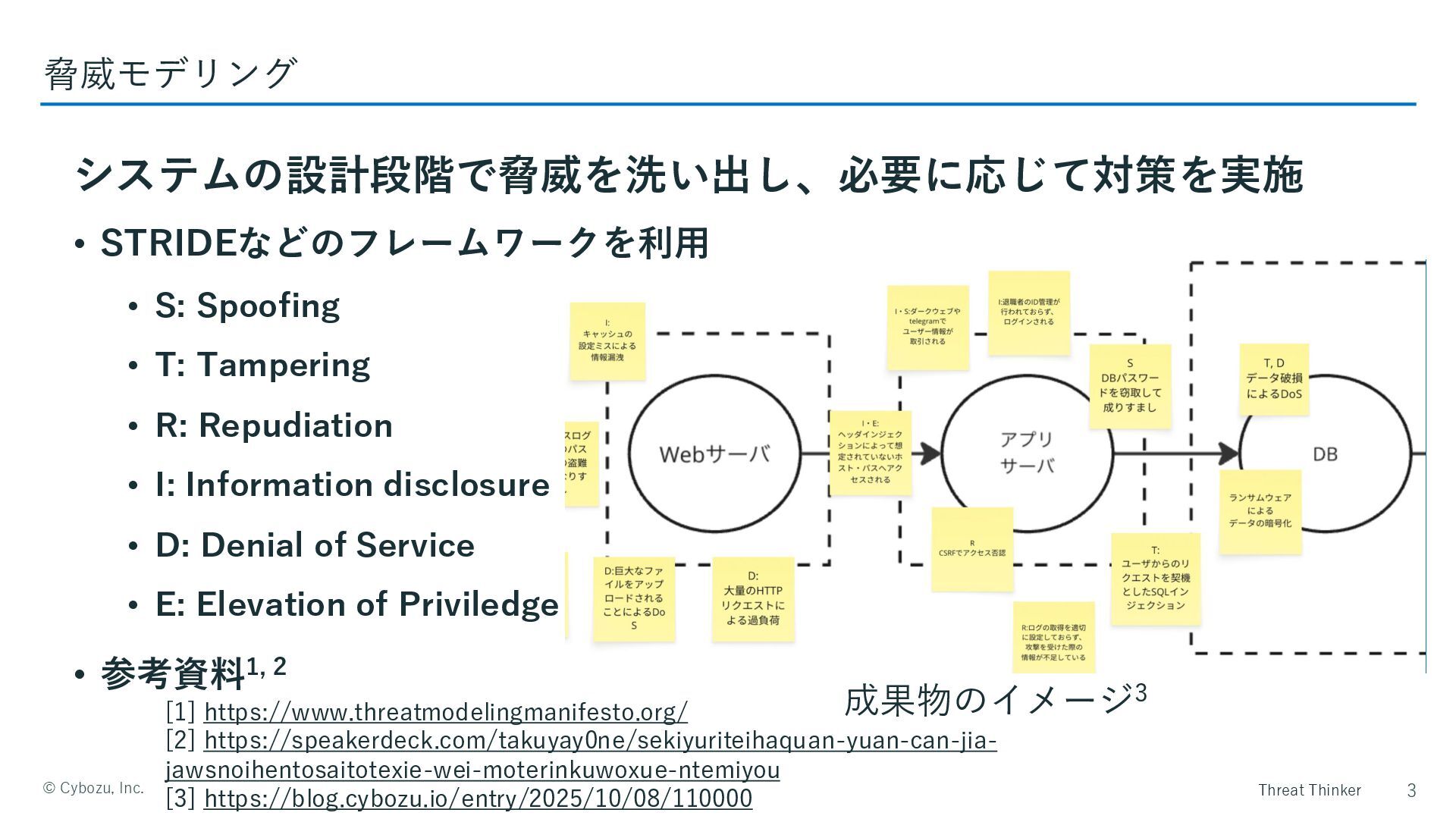 • T: Tampering • R: Repudiation • I: Information disclosure • D: Denial of Service • E: Elevation of Priviledge • 参考資料1, 2 システムの設計段階で脅威を洗い出し、必要に応じて対策を実施 [1] https://www.threatmodelingmanifesto.org/ [2] https://speakerdeck.com/takuyay0ne/sekiyuriteihaquan-yuan-can-jia- jawsnoihentosaitotexie-wei-moterinkuwoxue-ntemiyou [3] https://blog.cybozu.io/entry/2025/10/08/110000 成果物のイメージ3 3 脅威モデリング