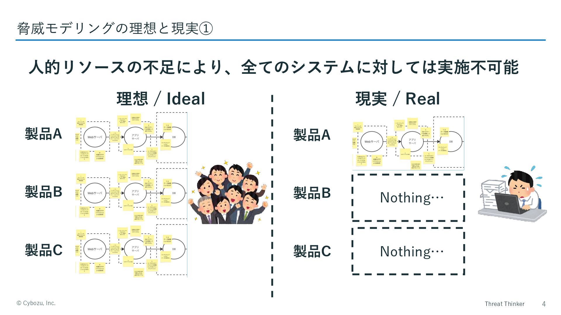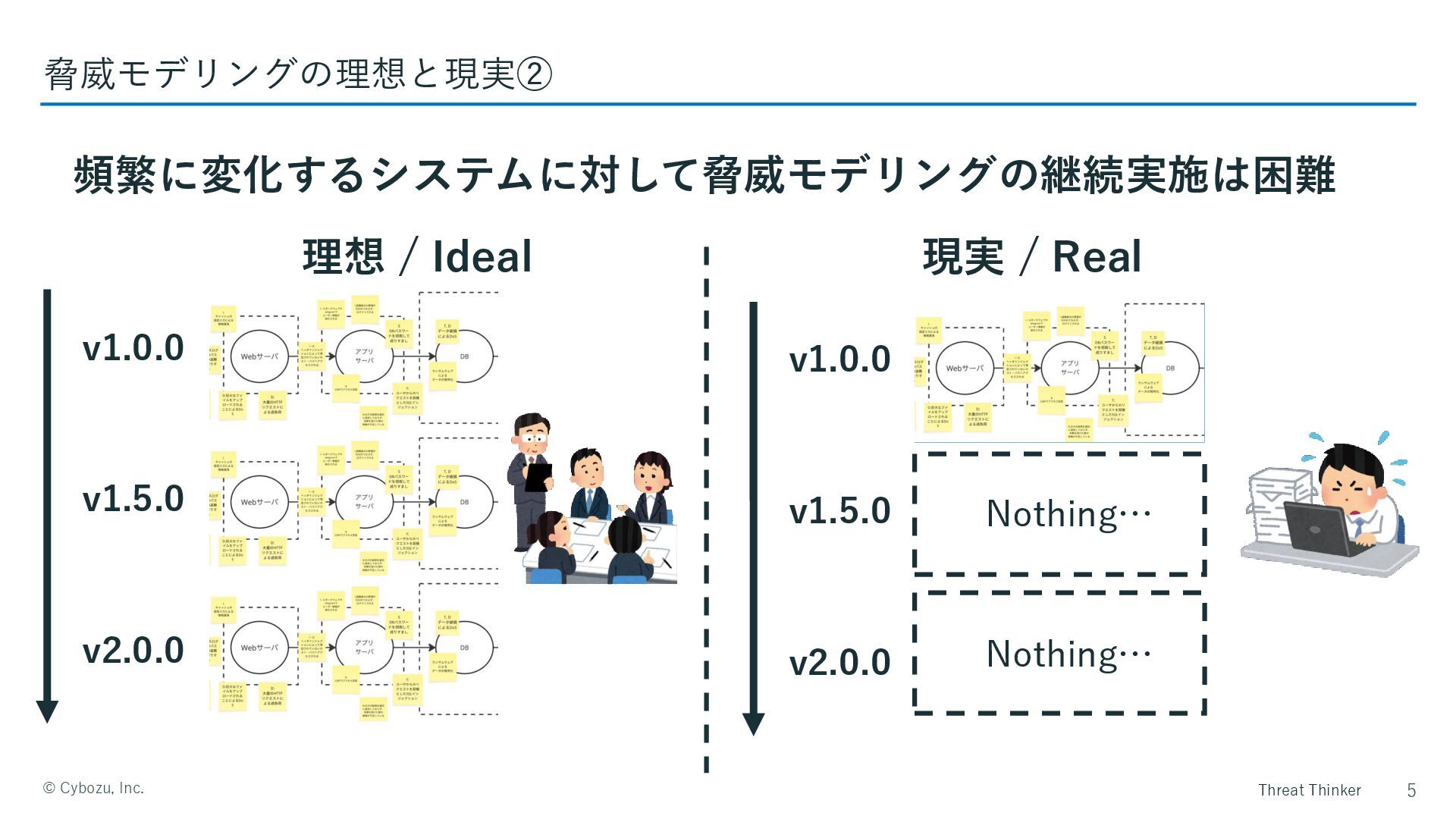 Threat Thinker ©️ Cybozu, Inc. 人的リソースの不足により、全てのシステムに対しては実施不可能 4 脅威モデリングの理想と現実① 理想 /