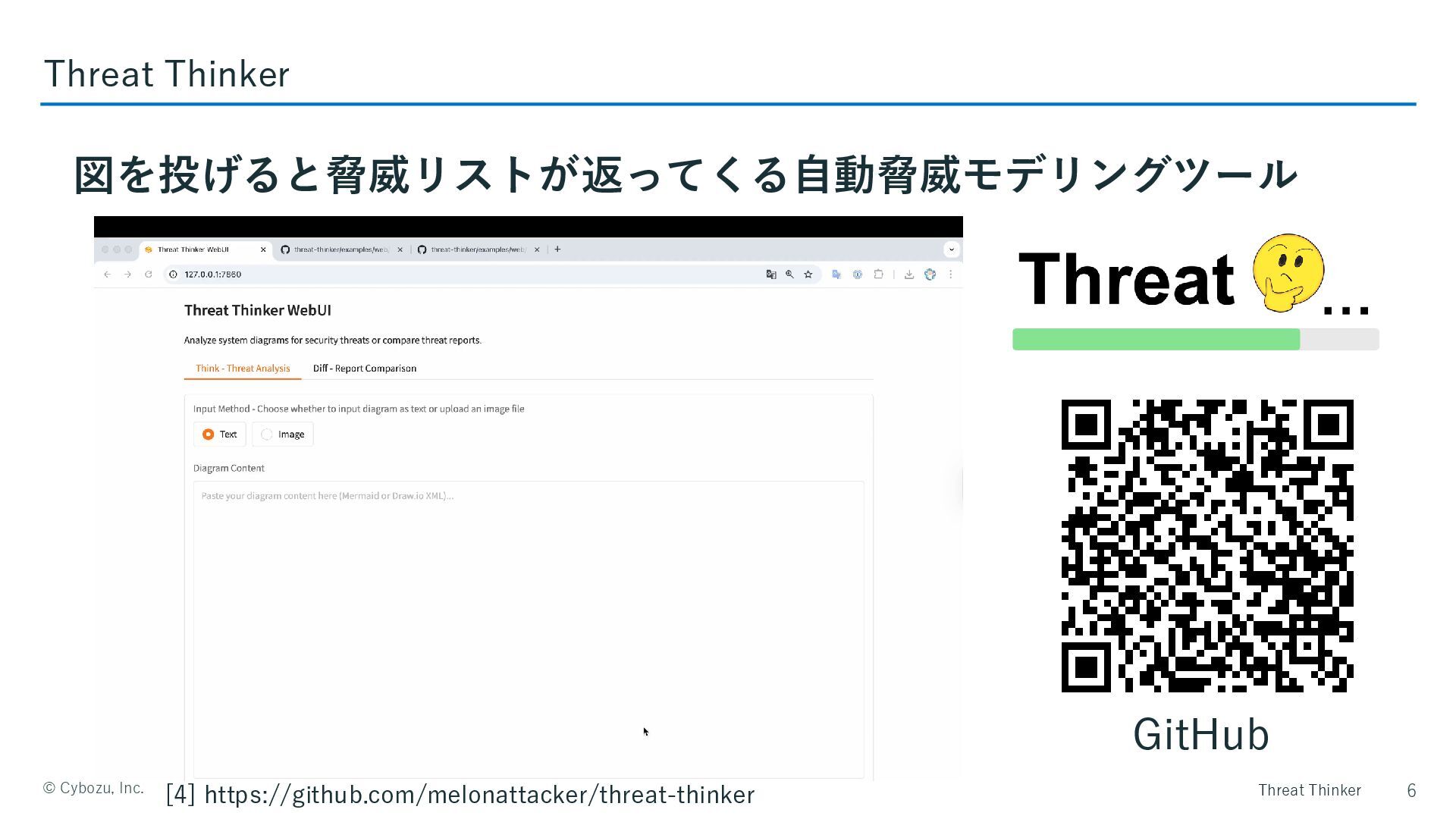 Threat Thinker ©️ Cybozu, Inc. 図を投げると脅威リストが返ってくる自動脅威モデリングツール 6 Threat Thinker GitHub