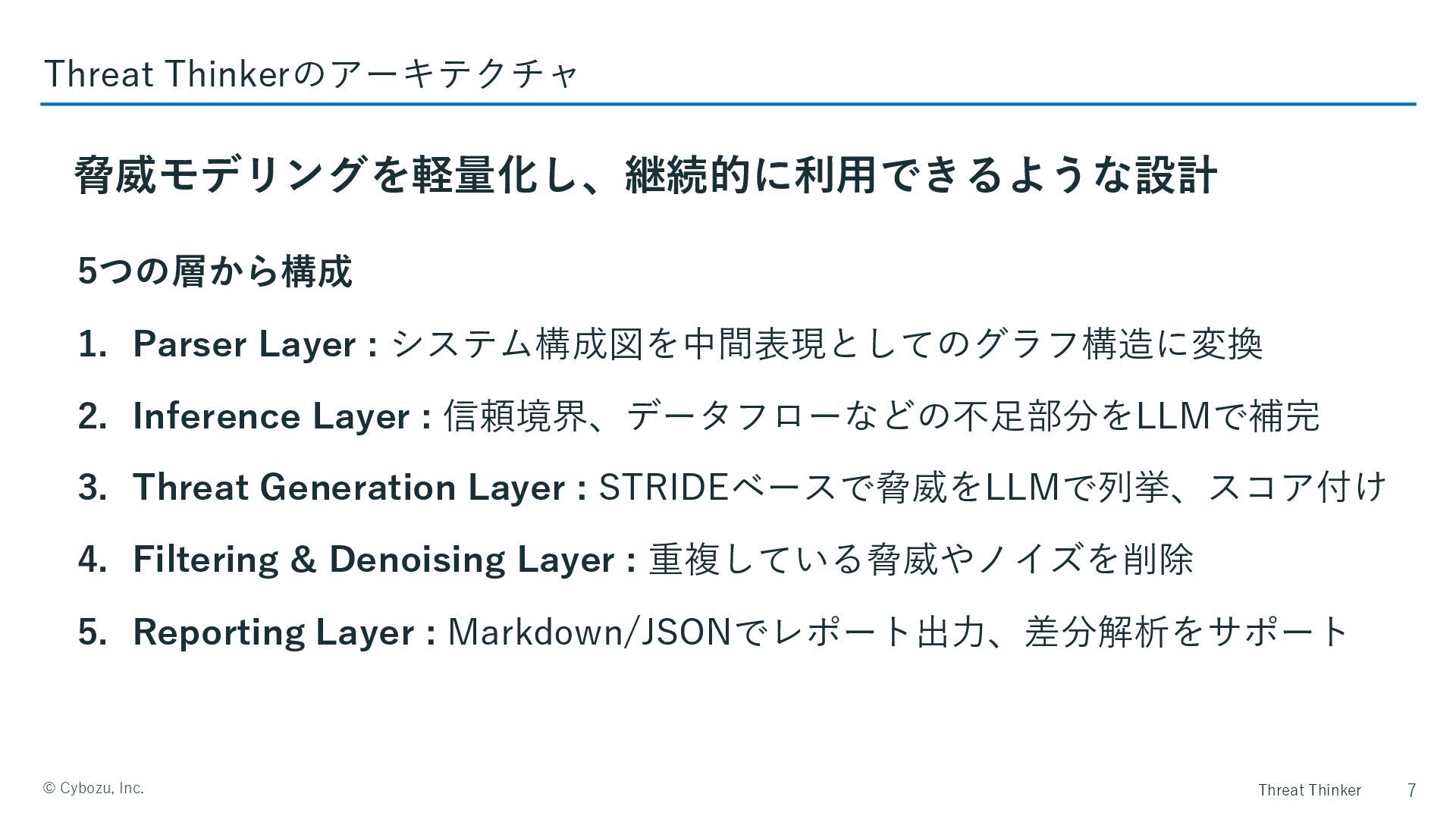 Threat Thinker ©️ Cybozu, Inc. 5つの層から構成 1. Parser Layer :