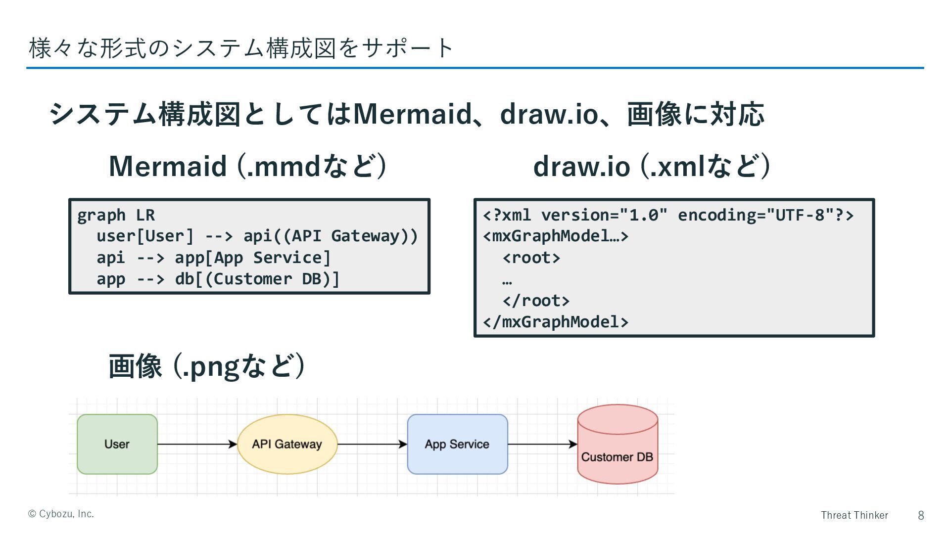 Threat Thinker ©️ Cybozu, Inc. システム構成図としてはMermaid、draw.io、画像に対応 8 様々な形式のシステム構成図をサポート graph LR
