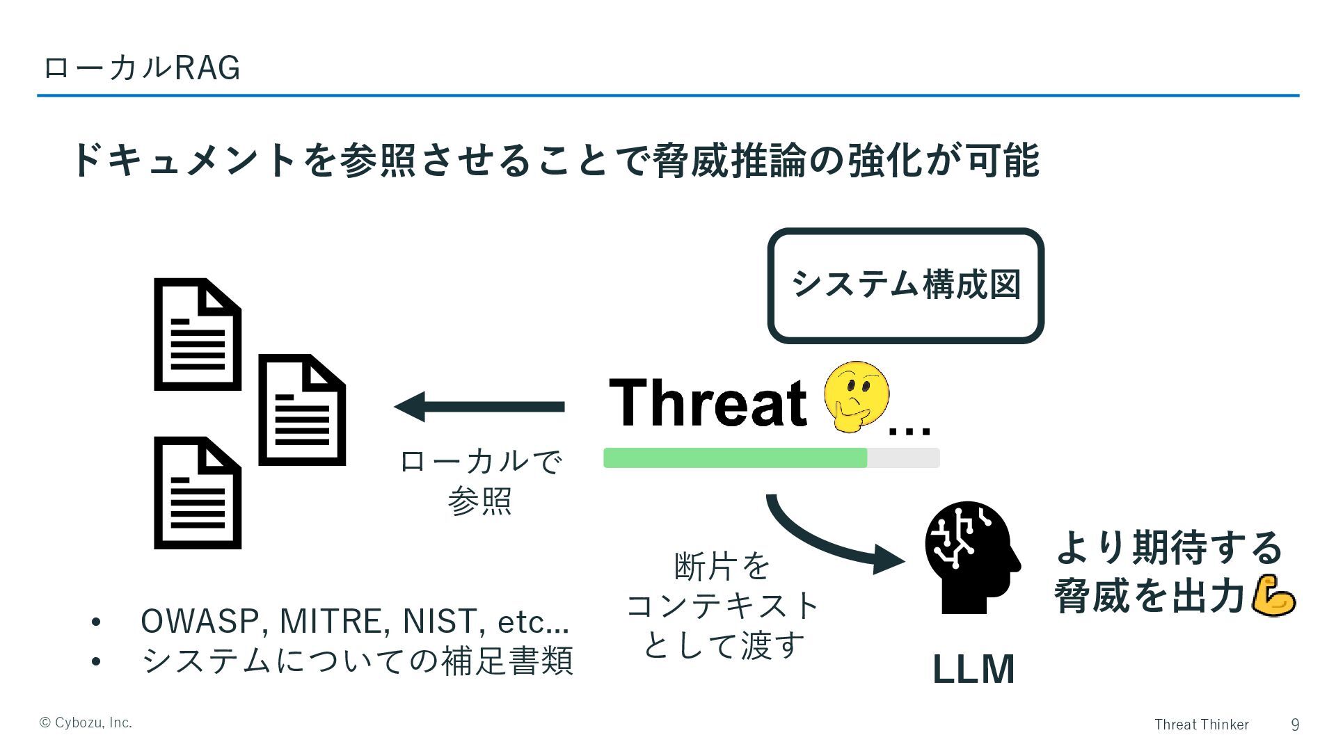 Threat Thinker ©️ Cybozu, Inc. ドキュメントを参照させることで脅威推論の強化が可能 9 ローカルRAG • OWASP,
