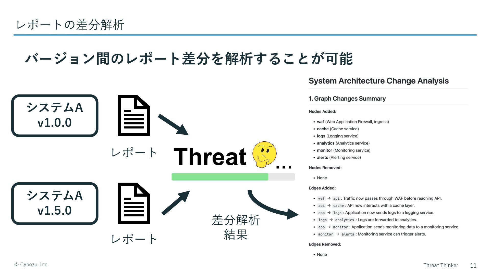 Threat Thinker ©️ Cybozu, Inc. バージョン間のレポート差分を解析することが可能 11 レポートの差分解析 システムA v1.0.0