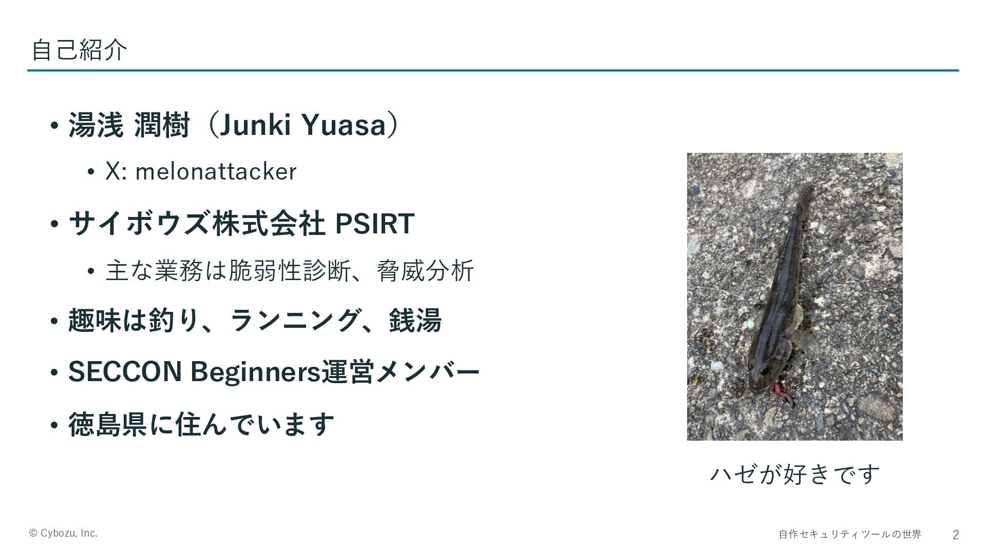 自作セキュリティツールの世界 ©️ Cybozu, Inc. 2 • 湯浅 潤樹(Junki Yuasa) •