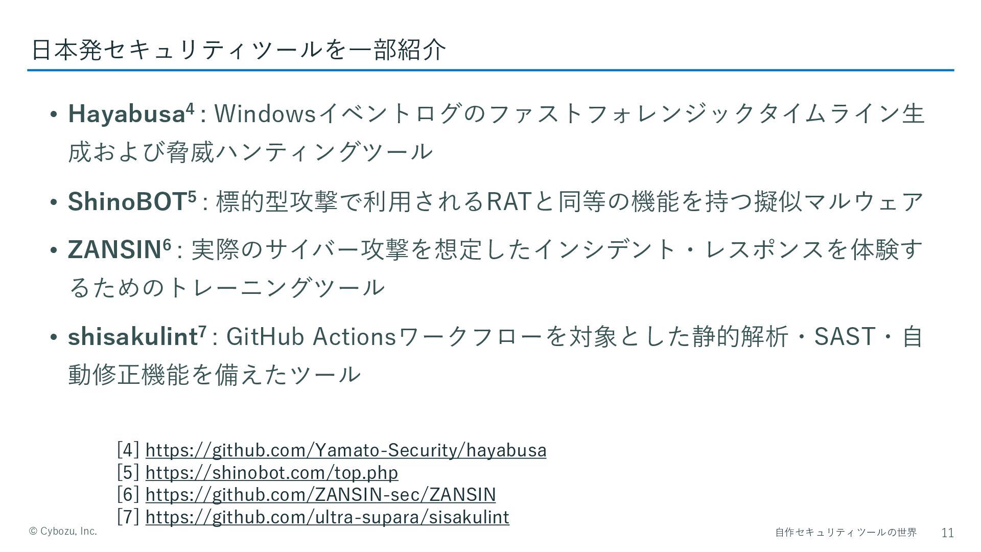 • ShinoBOT5 : 標的型攻撃で利用されるRATと同等の機能を持つ擬似マルウェア • ZANSIN6 : 実際のサイバー攻撃を想定したインシデント・レスポンスを体験す るためのトレーニングツール • shisakulint7 : GitHub Actionsワークフローを対象とした静的解析・SAST・自 動修正機能を備えたツール 日本発セキュリティツールを一部紹介 [4] https://github.com/Yamato-Security/hayabusa [5] https://shinobot.com/top.php [6] https://github.com/ZANSIN-sec/ZANSIN [7] https://github.com/ultra-supara/sisakulint