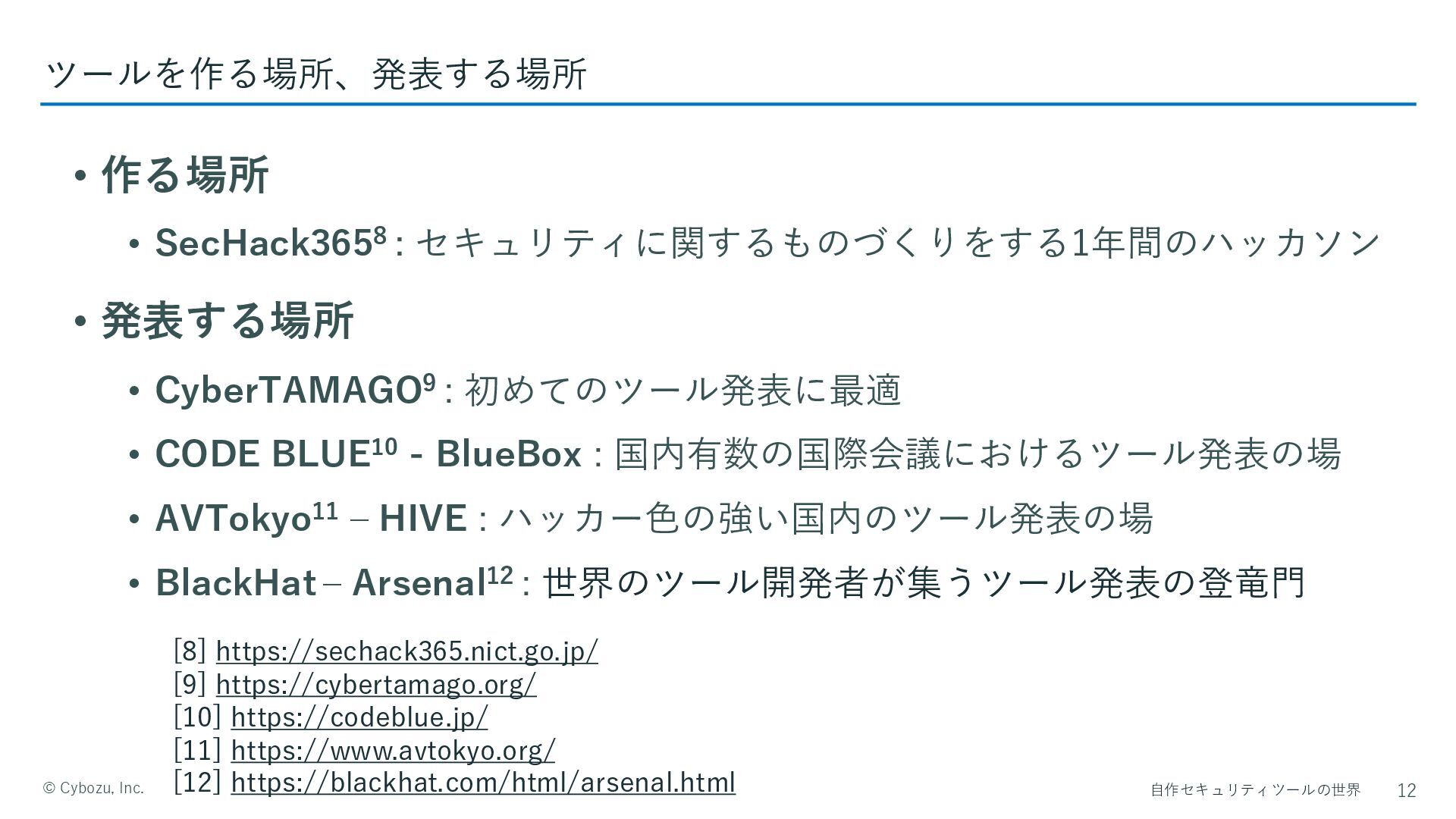 セキュリティに関するものづくりをする1年間のハッカソン • 発表する場所 • CyberTAMAGO9 : 初めてのツール発表に最適 • CODE BLUE10 - BlueBox : 国内有数の国際会議におけるツール発表の場 • AVTokyo11 – HIVE : ハッカー色の強い国内のツール発表の場 • BlackHat – Arsenal12 : 世界のツール開発者が集うツール発表の登竜門 ツールを作る場所、発表する場所 [8] https://sechack365.nict.go.jp/ [9] https://cybertamago.org/ [10] https://codeblue.jp/ [11] https://www.avtokyo.org/ [12] https://blackhat.com/html/arsenal.html
