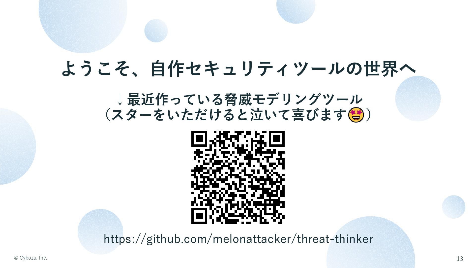 ©️ Cybozu, Inc. ようこそ、自作セキュリティツールの世界へ 13 https://github.com/melonattacker/threat-thinker ↓最近作っている脅威モデリングツール (スターをいただけると泣いて喜びます )