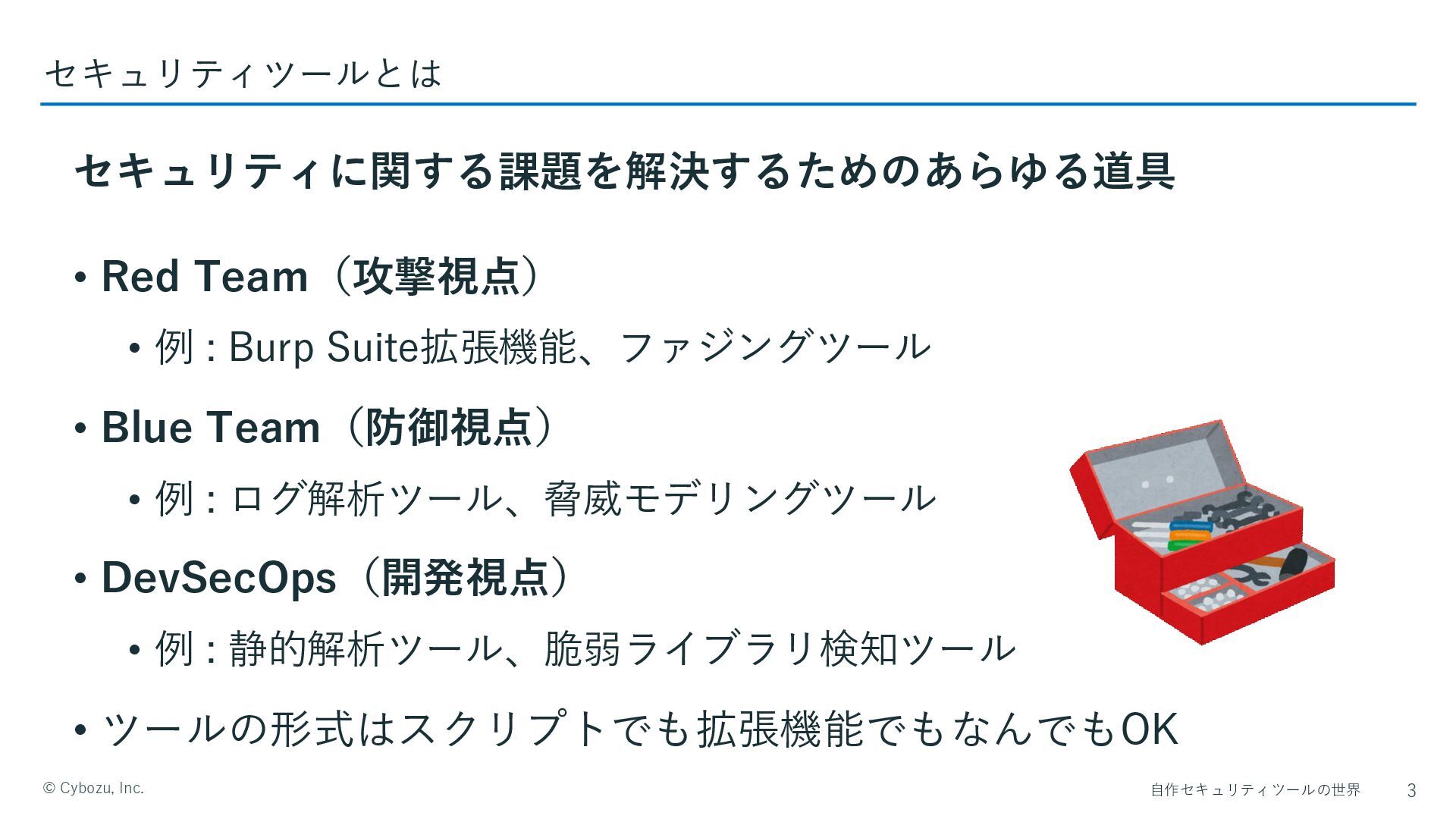 : Burp Suite拡張機能、ファジングツール • Blue Team(防御視点) • 例 : ログ解析ツール、脅威モデリングツール • DevSecOps(開発視点) • 例 : 静的解析ツール、脆弱ライブラリ検知ツール • ツールの形式はスクリプトでも拡張機能でもなんでもOK セキュリティツールとは セキュリティに関する課題を解決するためのあらゆる道具