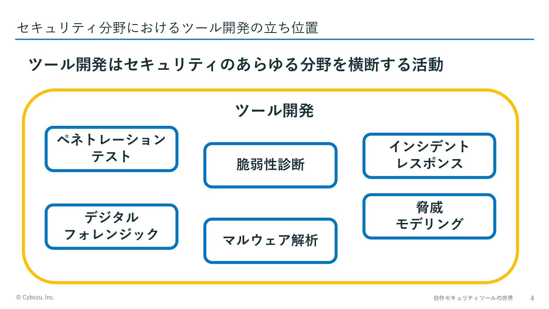 自作セキュリティツールの世界 ©️ Cybozu, Inc. 4 セキュリティ分野におけるツール開発の立ち位置 ツール開発はセキュリティのあらゆる分野を横断する活動 ペネトレーション テスト インシデント