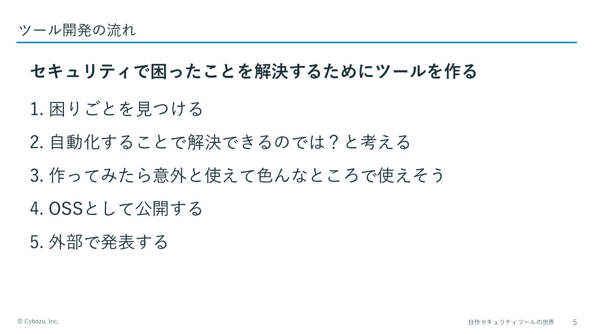 作ってみたら意外と使えて色んなところで使えそう 4. OSSとして公開する 5. 外部で発表する ツール開発の流れ セキュリティで困ったことを解決するためにツールを作る