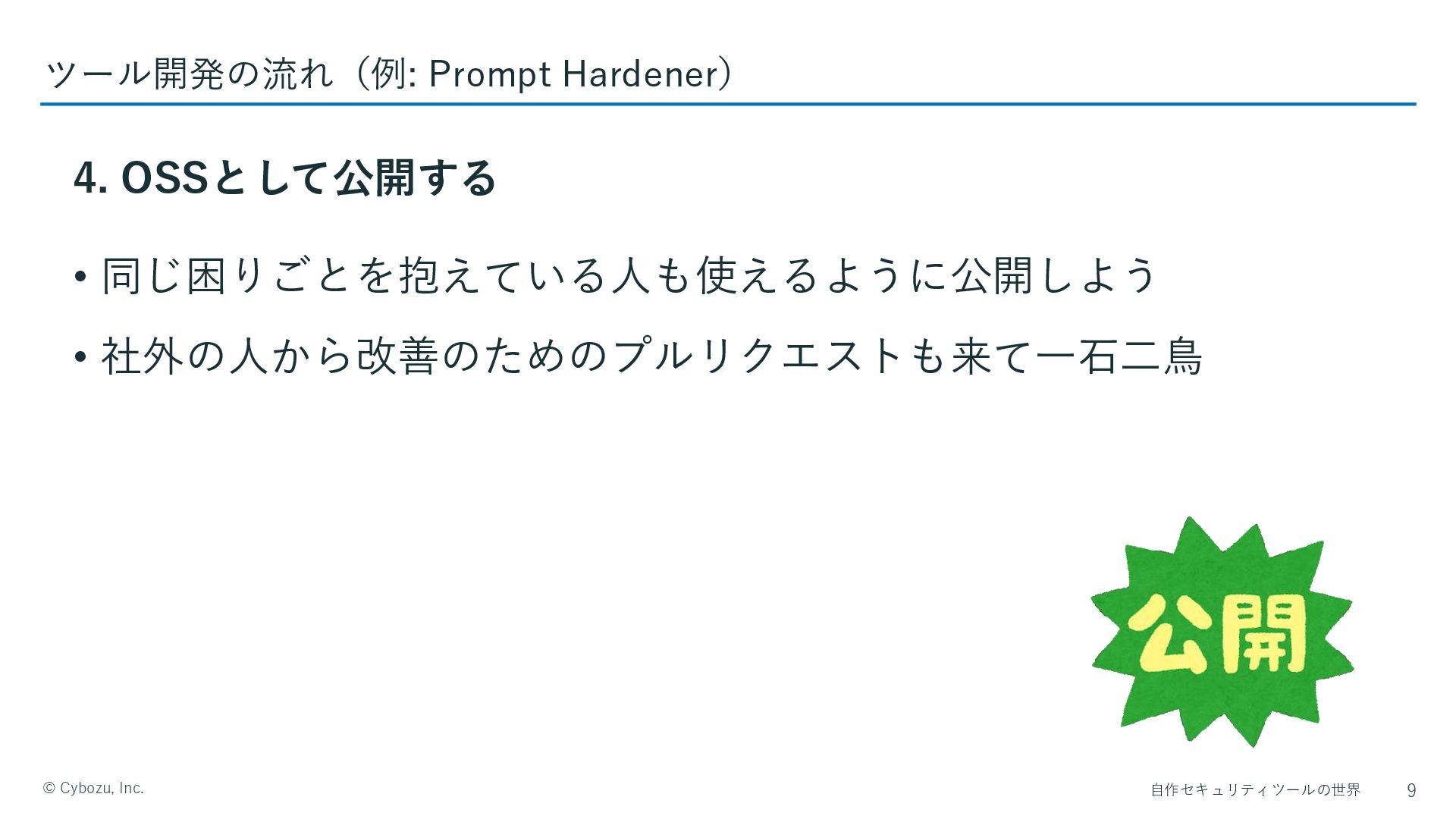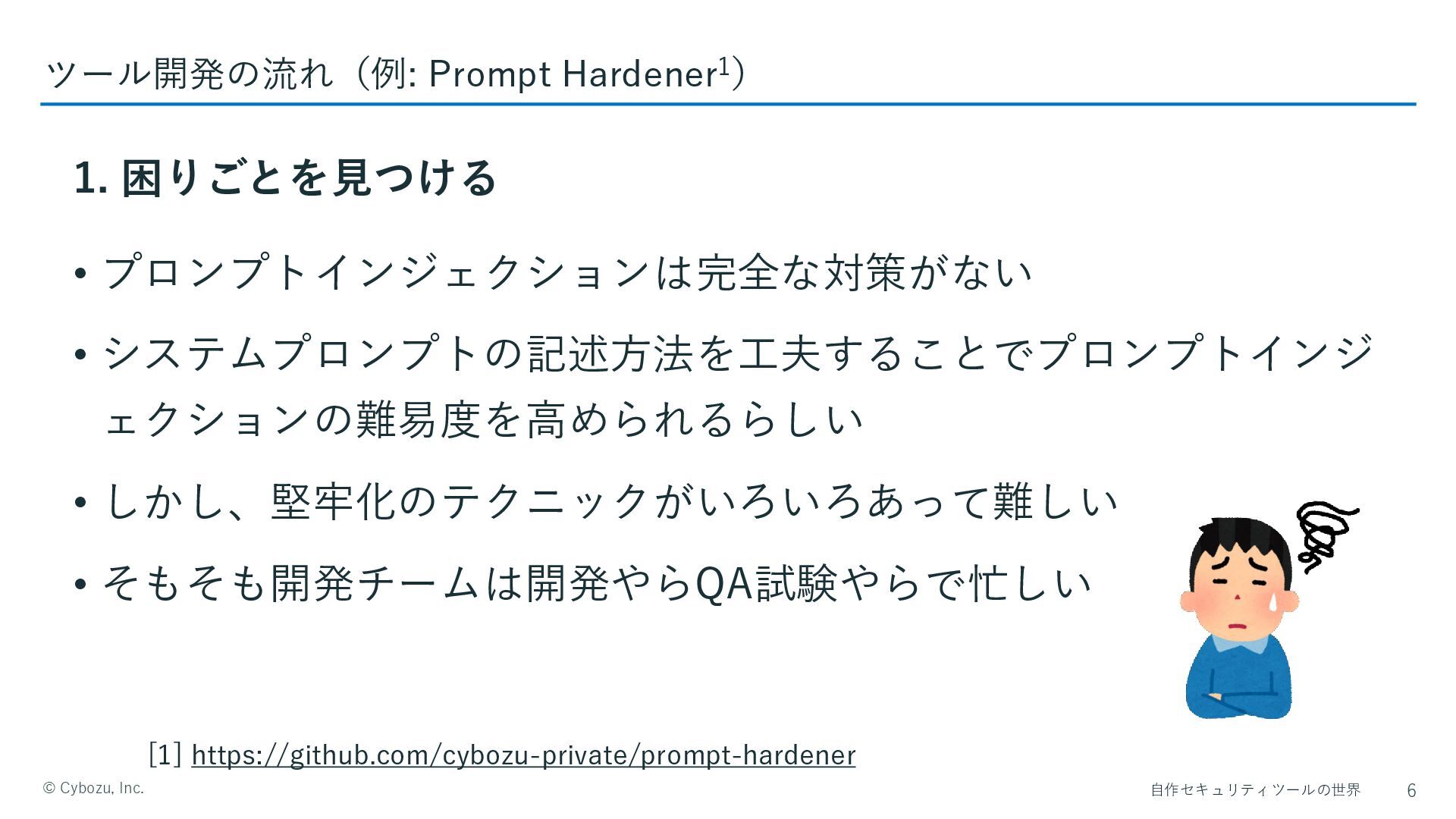 • しかし、堅牢化のテクニックがいろいろあって難しい • そもそも開発チームは開発やらQA試験やらで忙しい ツール開発の流れ(例: Prompt Hardener1) [1] https://github.com/cybozu-private/prompt-hardener 1. 困りごとを見つける