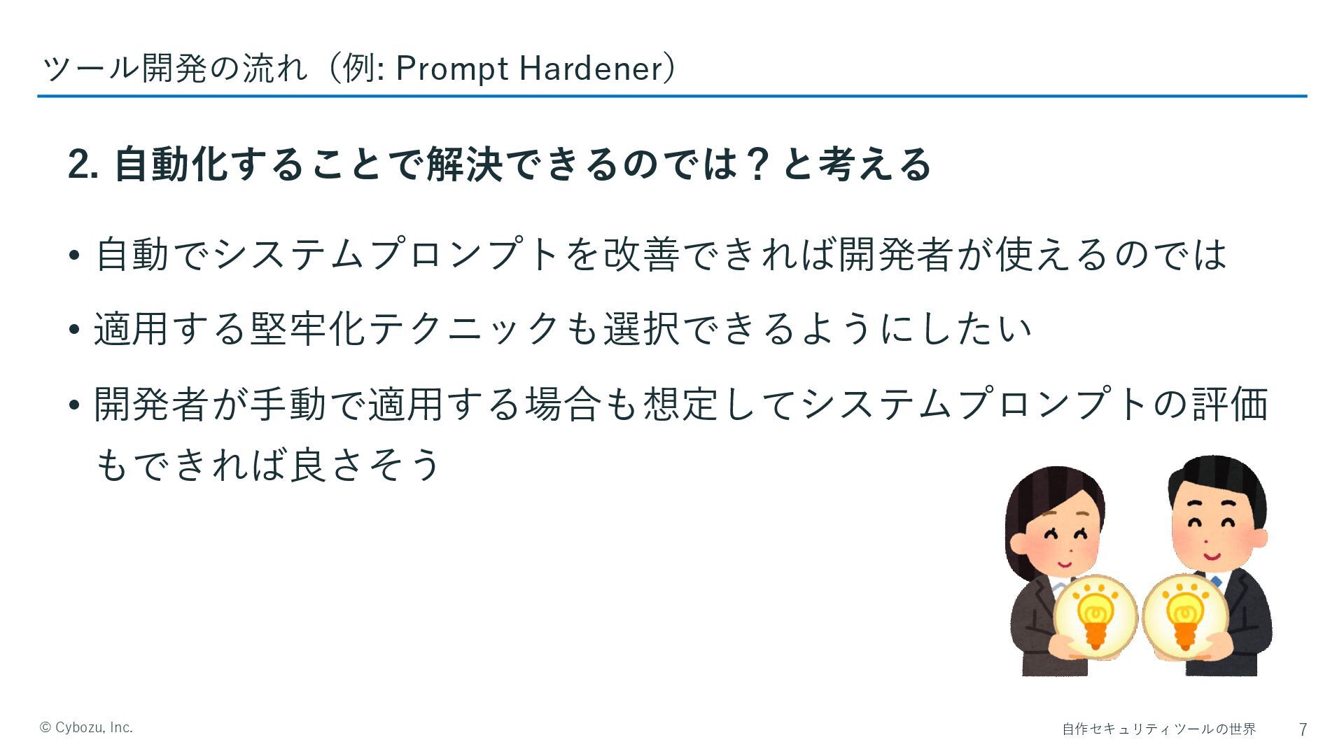 開発者が手動で適用する場合も想定してシステムプロンプトの評価 もできれば良さそう ツール開発の流れ(例: Prompt Hardener) 2. 自動化することで解決できるのでは?と考える