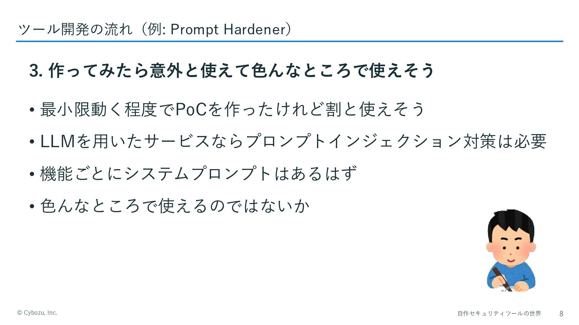 機能ごとにシステムプロンプトはあるはず • 色んなところで使えるのではないか ツール開発の流れ(例: Prompt Hardener) 3. 作ってみたら意外と使えて色んなところで使えそう