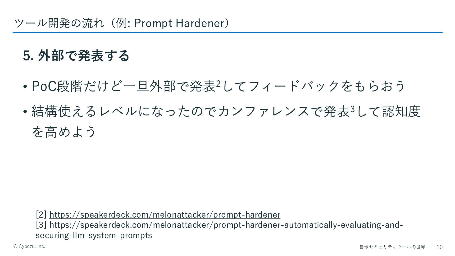 ツール開発の流れ(例: Prompt Hardener) 5. 外部で発表する [2] https://speakerdeck.com/melonattacker/prompt-hardener [3] https://speakerdeck.com/melonattacker/prompt-hardener-automatically-evaluating-and- securing-llm-system-prompts