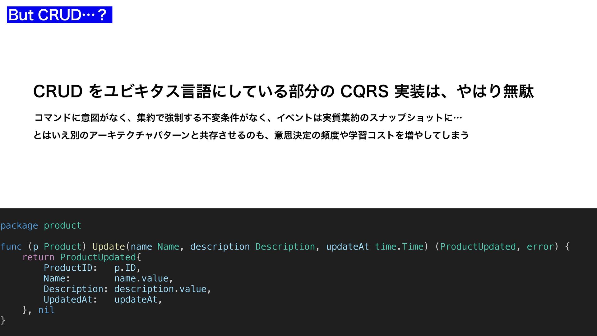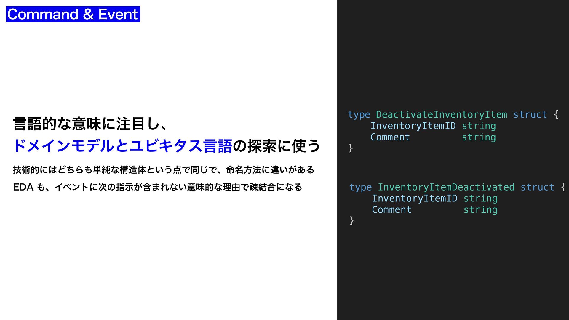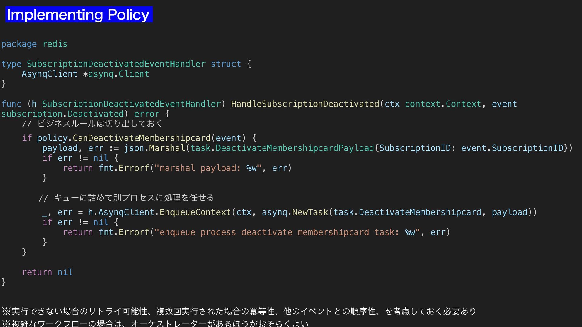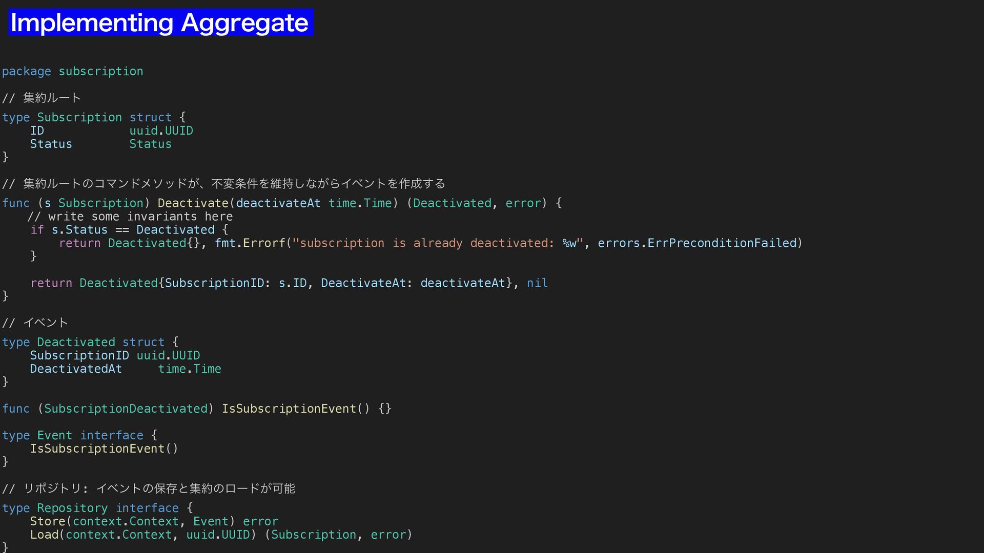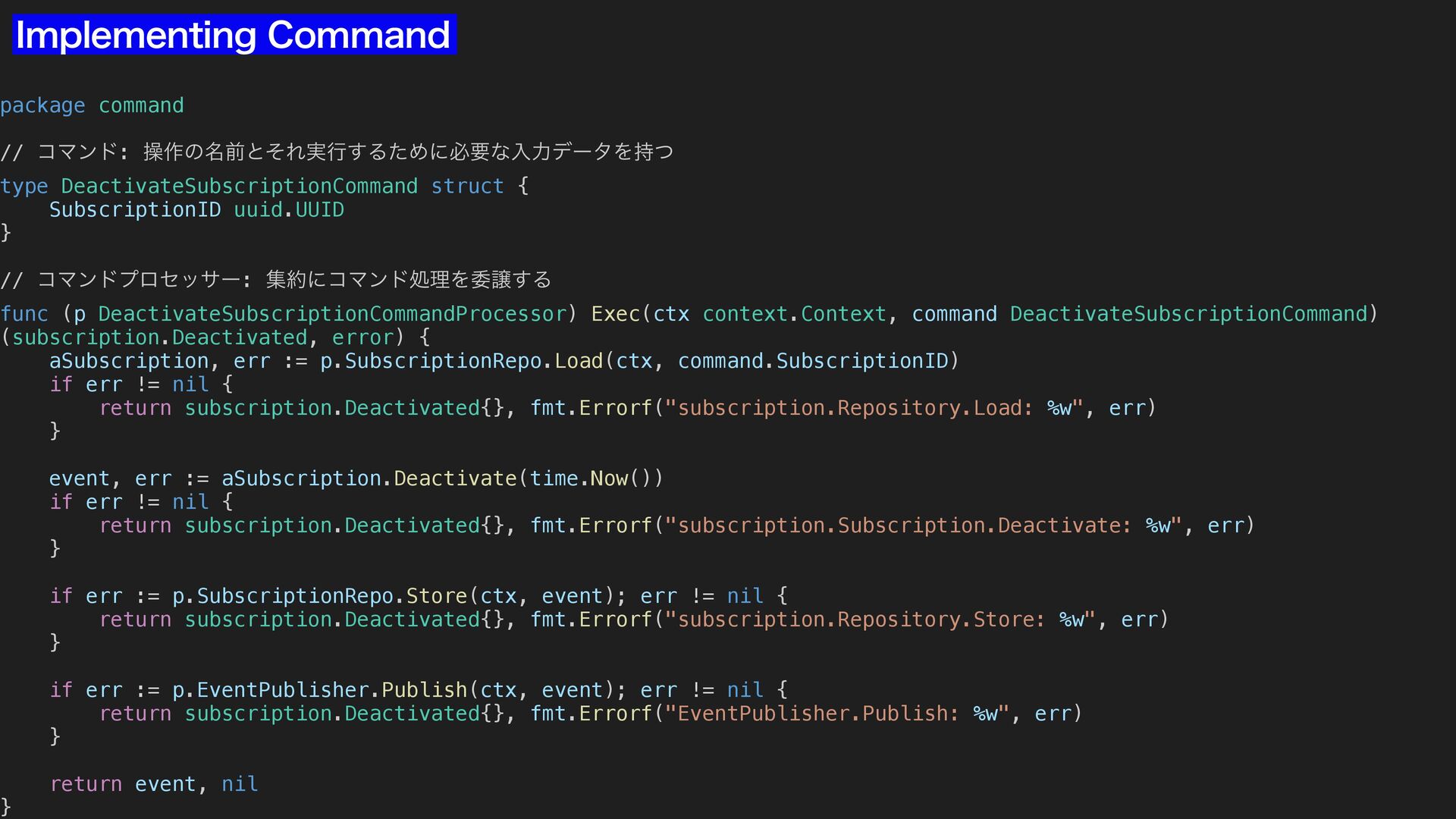 uuid.UUID } // ίϚϯυϓϩηοαʔ: ूʹίϚϯυॲཧΛҕৡ͢Δ func (p DeactivateSubscriptionCommandProcessor) Exec(ctx context.Context, command DeactivateSubscriptionCommand) (subscription.Deactivated, error) { aSubscription, err := p.SubscriptionRepo.Load(ctx, command.SubscriptionID) if err != nil { return subscription.Deactivated{}, fmt.Errorf("subscription.Repository.Load: %w", err) } event, err := aSubscription.Deactivate(time.Now()) if err != nil { return subscription.Deactivated{}, fmt.Errorf("subscription.Subscription.Deactivate: %w", err) } if err := p.SubscriptionRepo.Store(ctx, event); err != nil { return subscription.Deactivated{}, fmt.Errorf("subscription.Repository.Store: %w", err) } if err := p.EventPublisher.Publish(ctx, event); err != nil { return subscription.Deactivated{}, fmt.Errorf("EventPublisher.Publish: %w", err) } return event, nil } *NQMFNFOUJOH$PNNBOE
