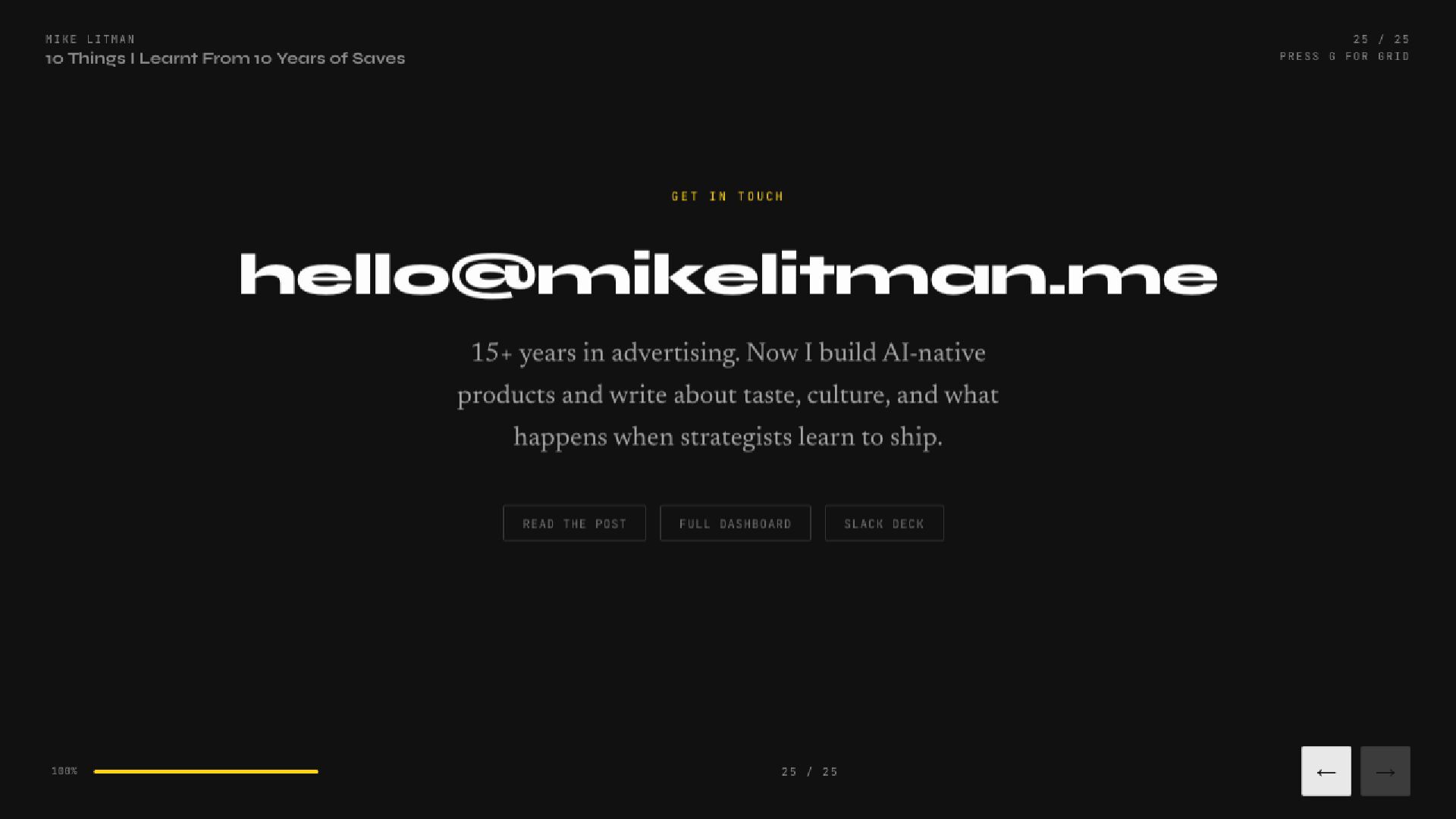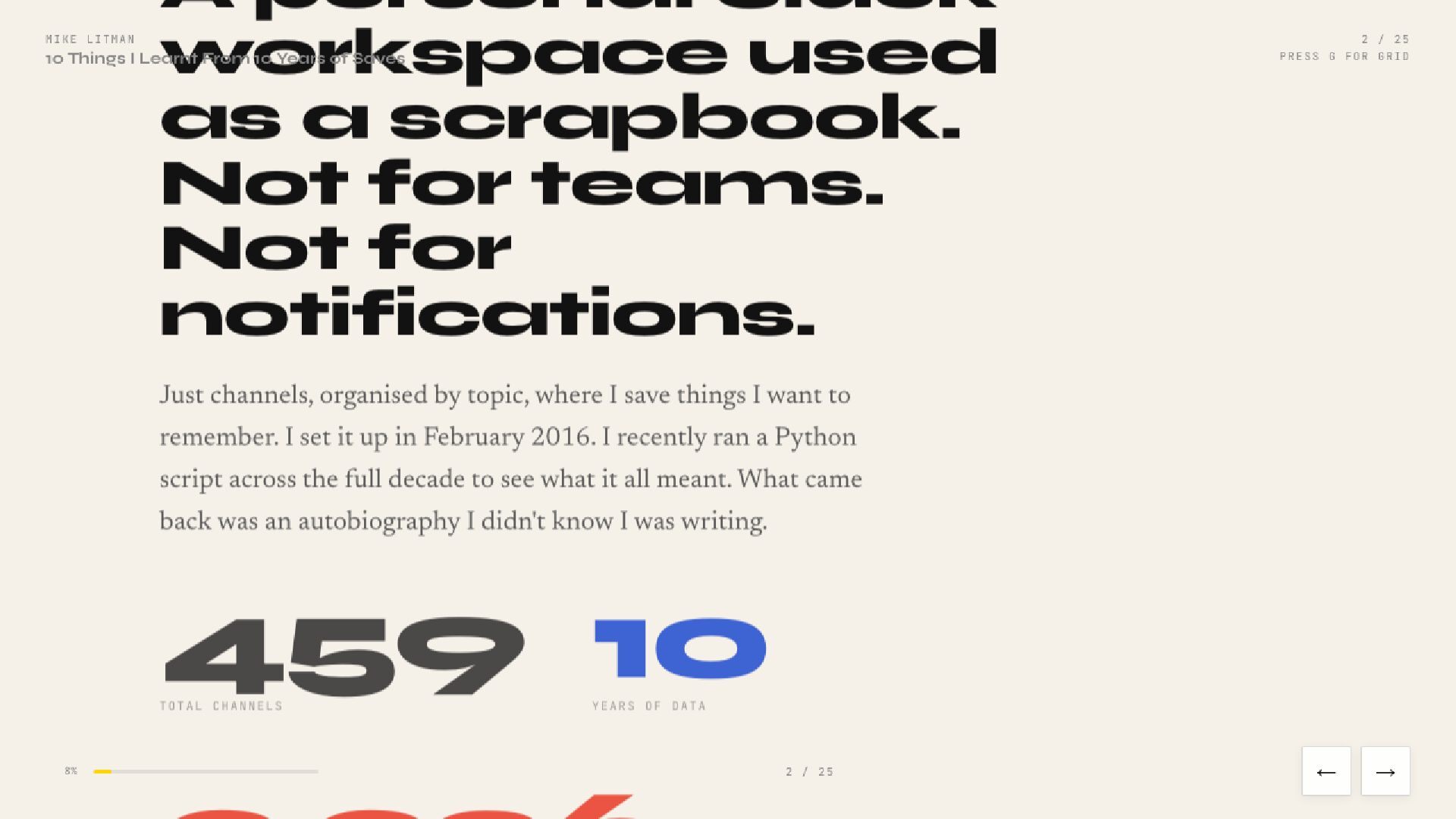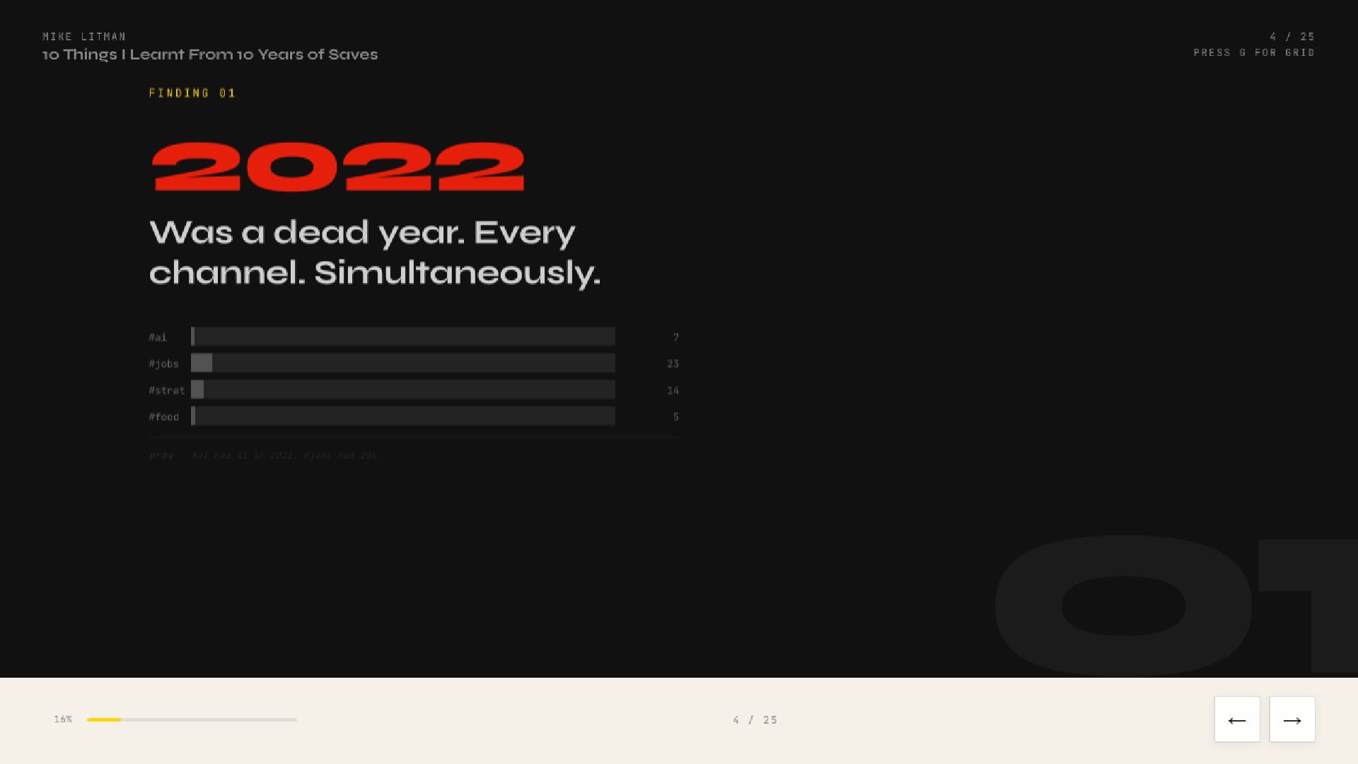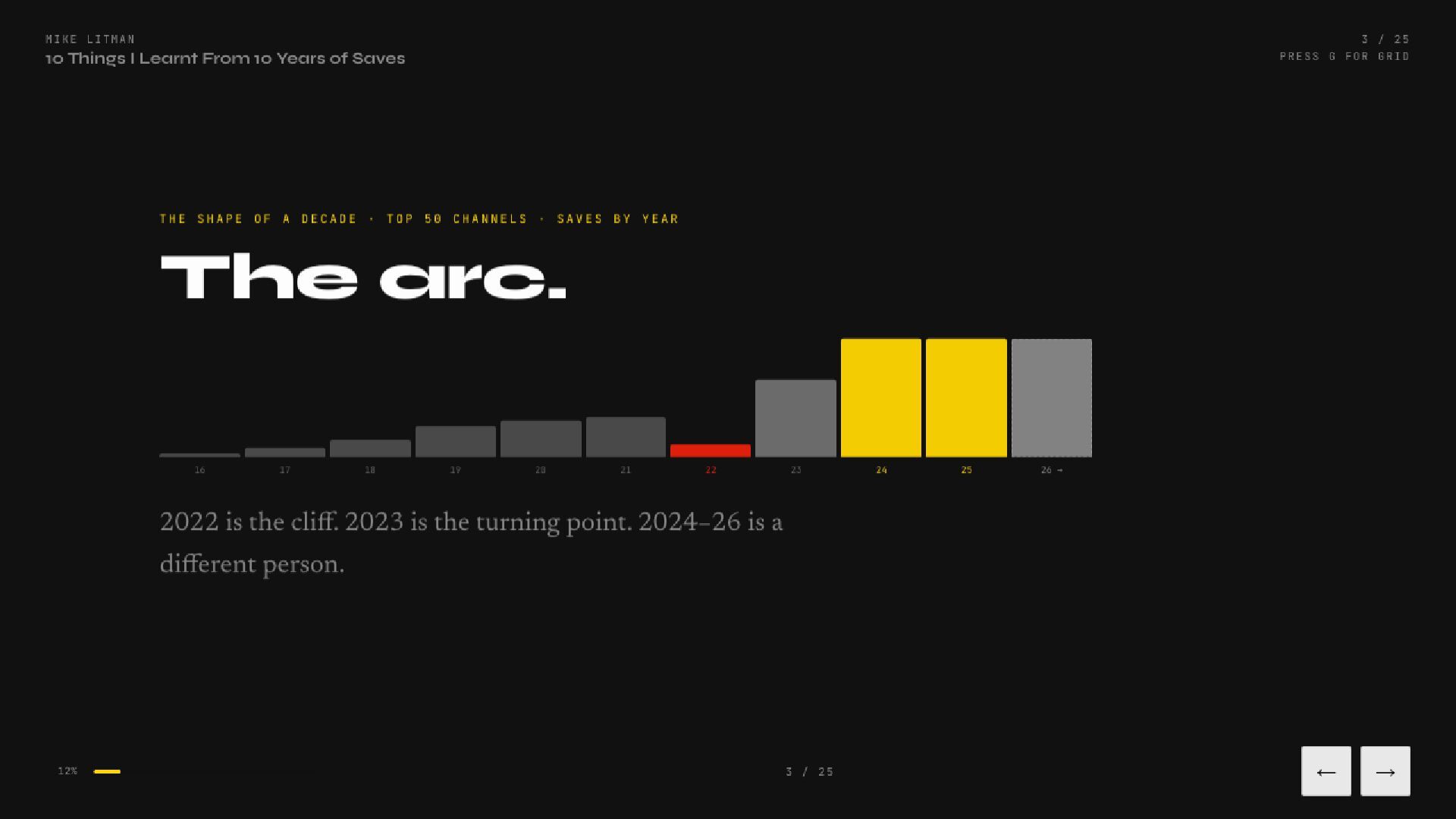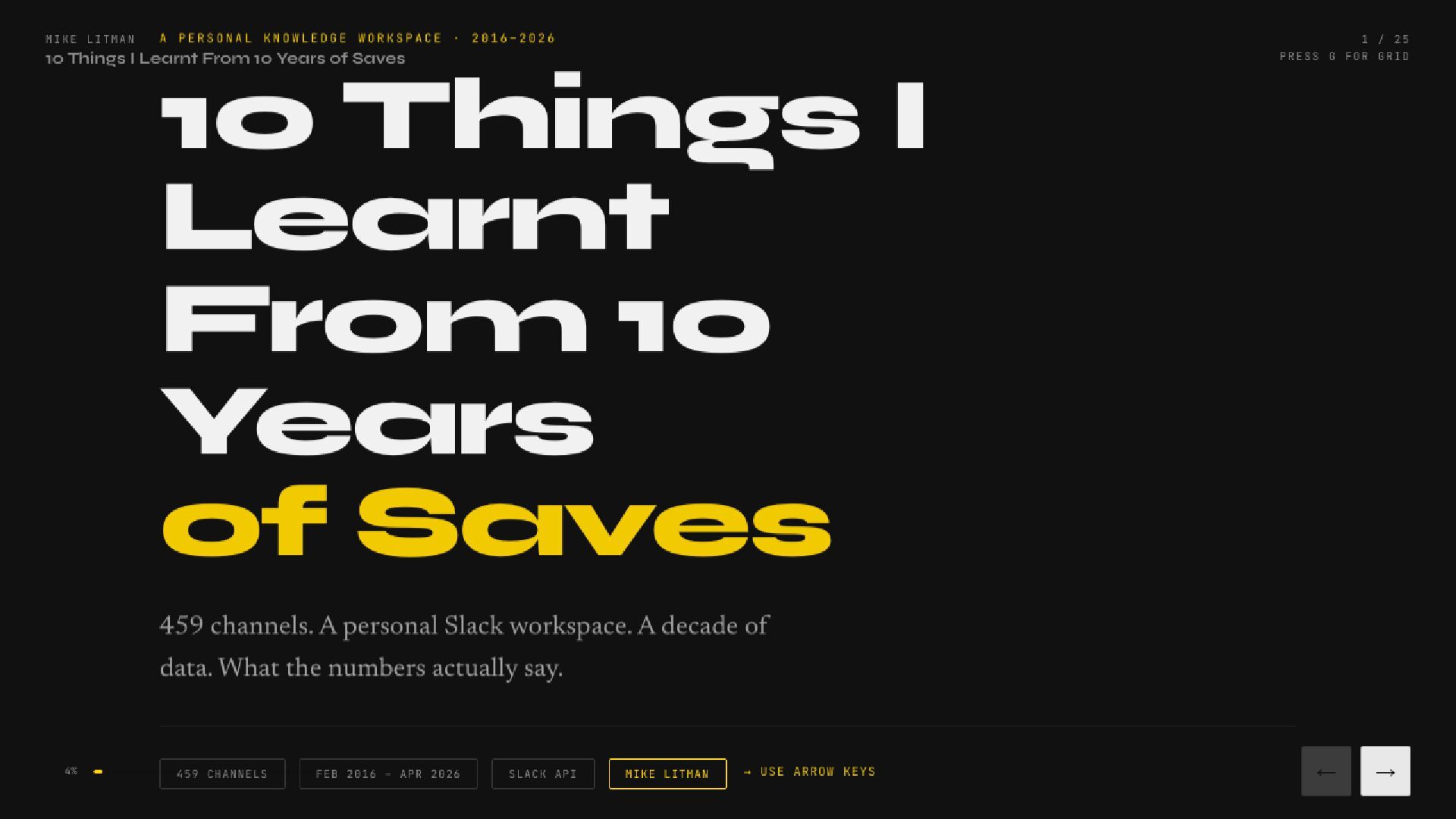 459 channels. 10 years. One dataset. From 2022's dead year to ChatGPT's 83x spike, from #strategy's peak to #cultural-interface's overnight dominance — the data shows the exact moment a strategist became a maker.