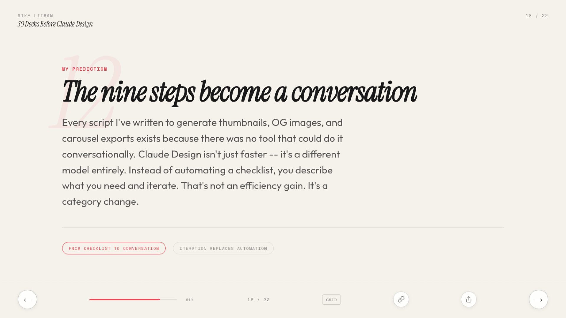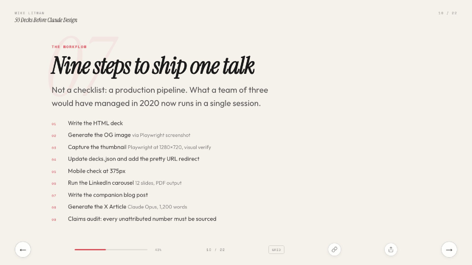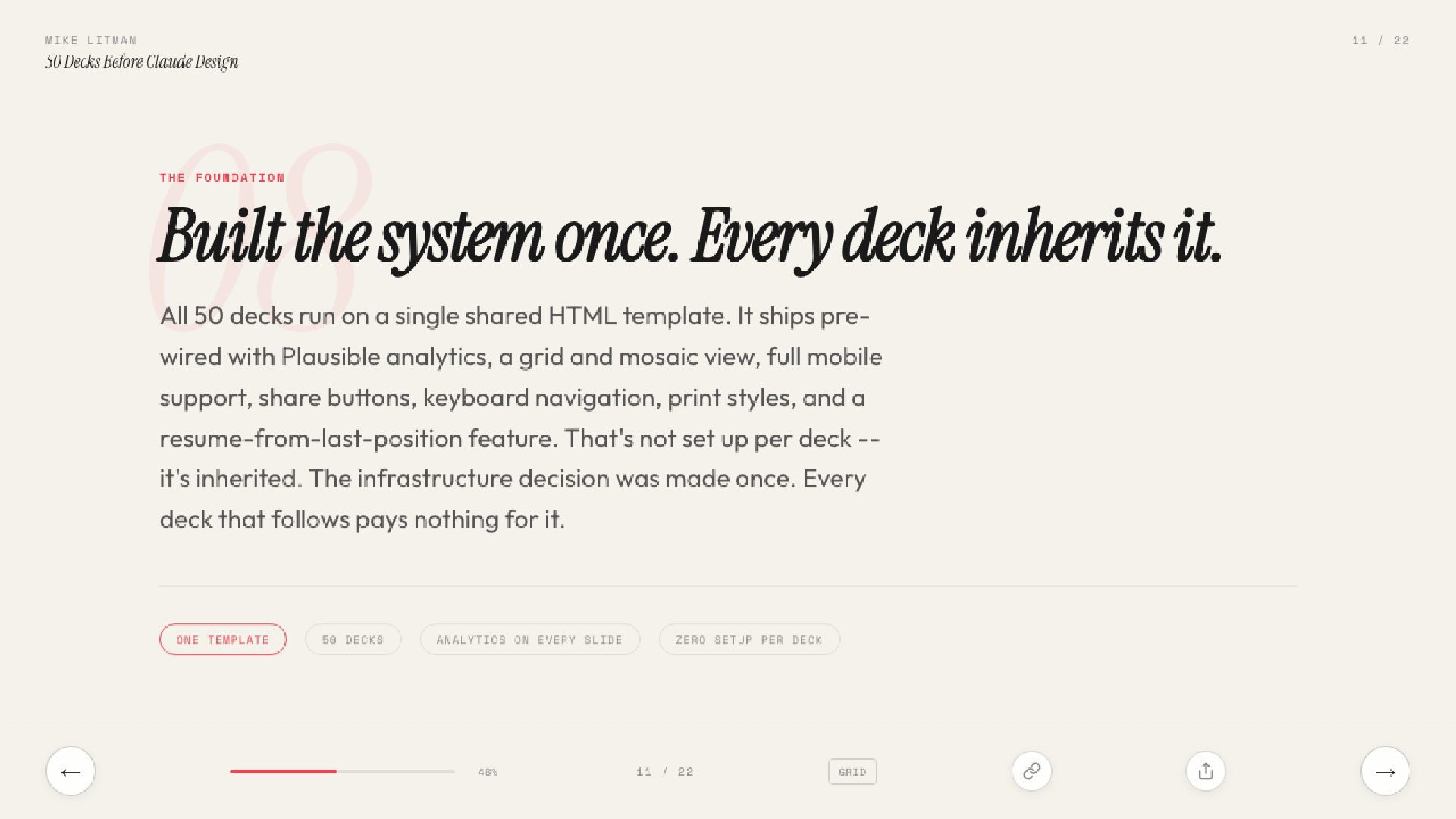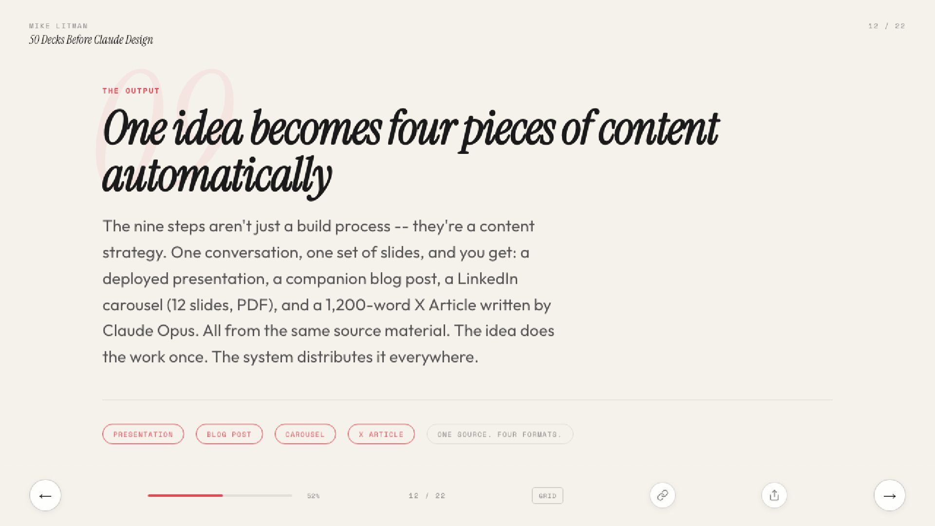 22 slides on building 50 presentations before Claude Design existed: the curation system, the nine-step production pipeline, the shared template infrastructure, the content engine that turns one deck into four formats, and the time collapse from two weeks to hours. Plus first-hand reactions from two Anthropic insiders on launch day.