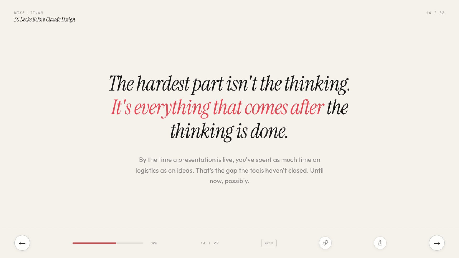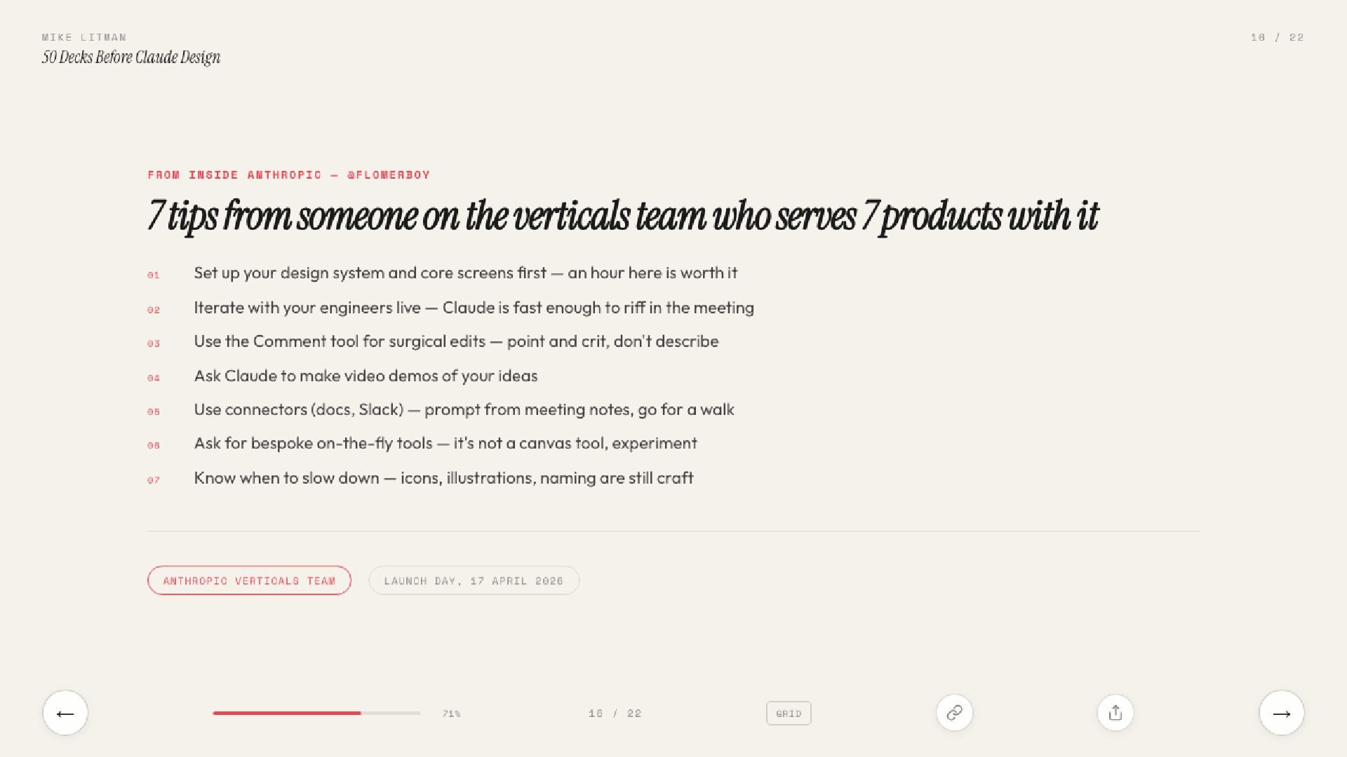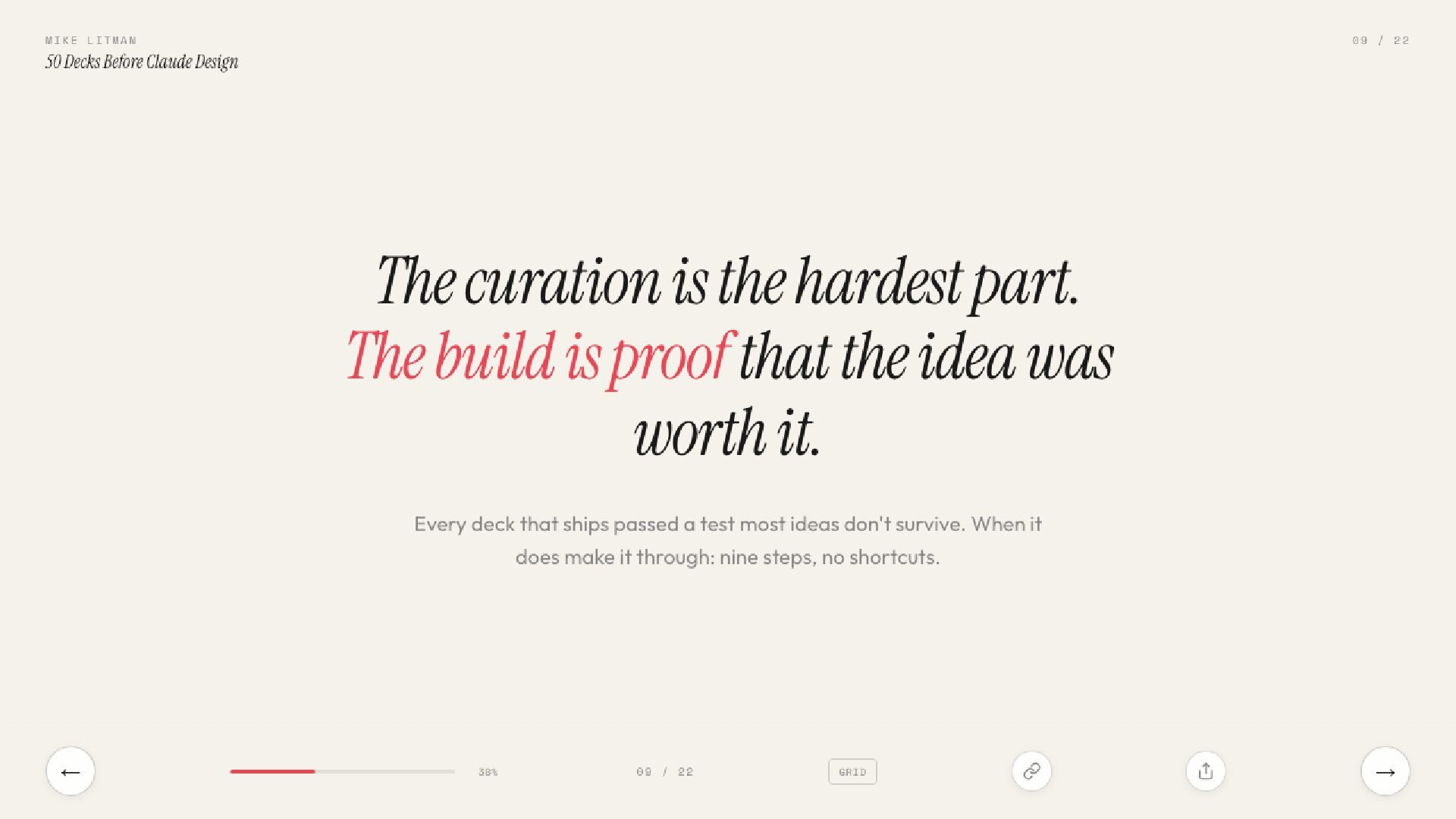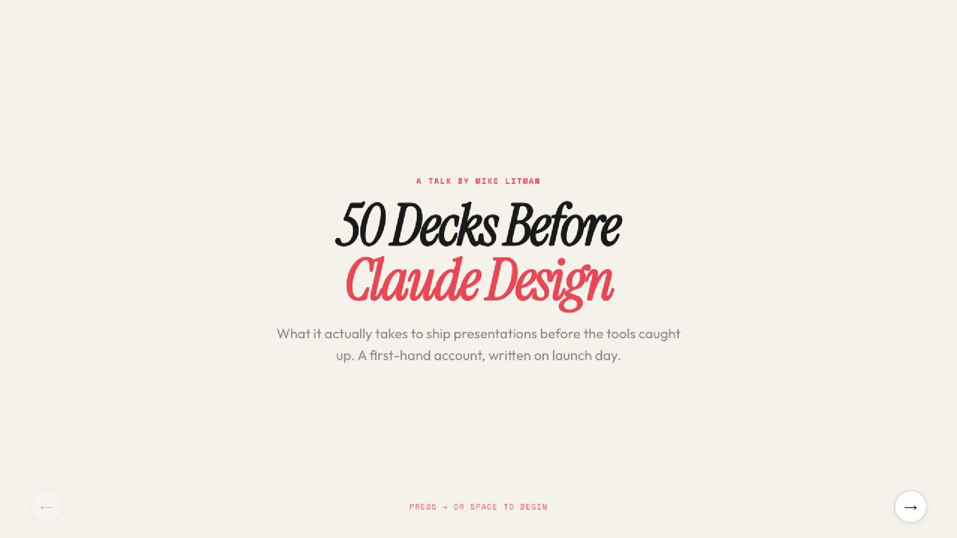 22 slides on building 50 presentations before Claude Design existed: the curation system, the nine-step production pipeline, the shared template infrastructure, the content engine that turns one deck into four formats, and the time collapse from two weeks to hours. Plus first-hand reactions from two Anthropic insiders on launch day.