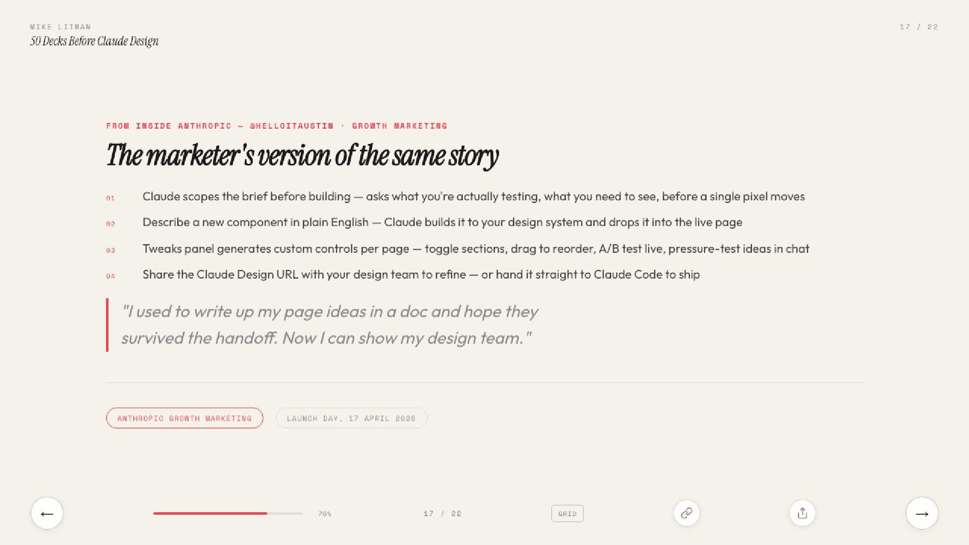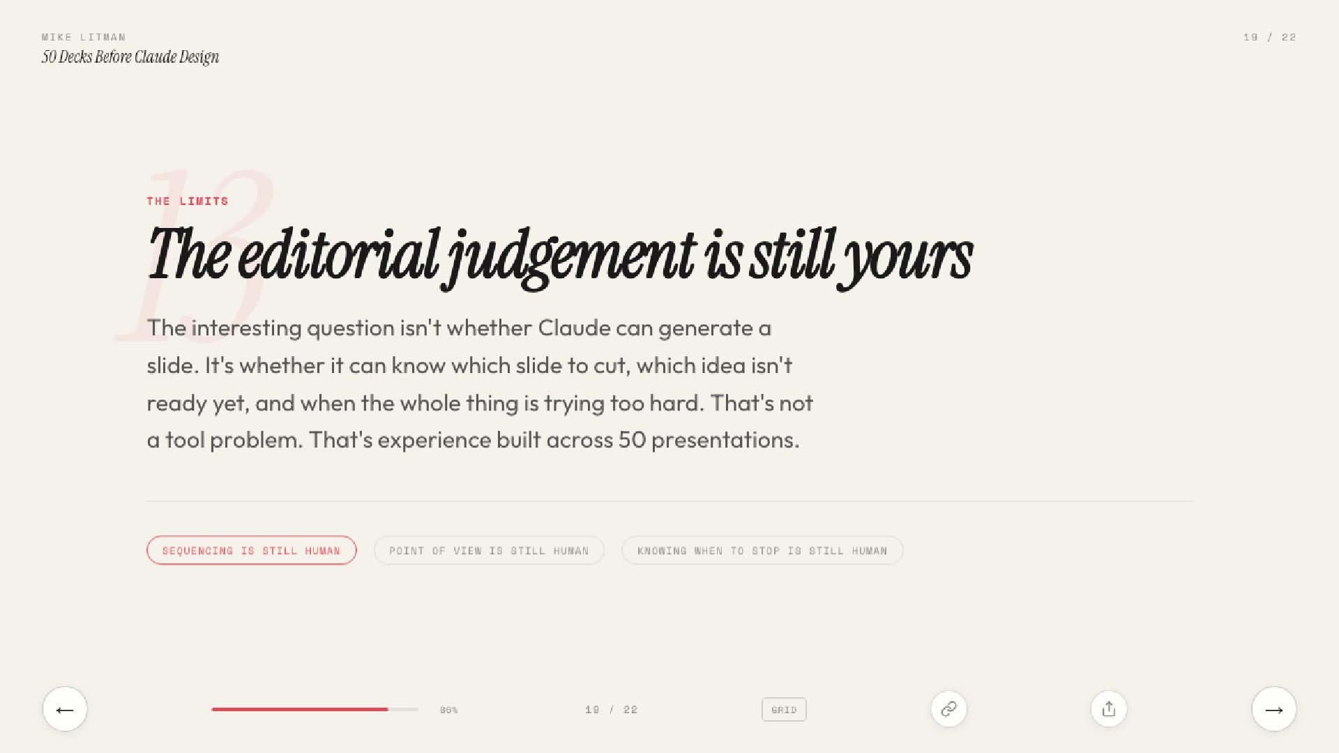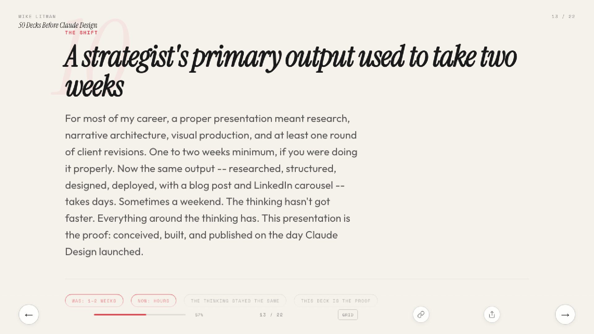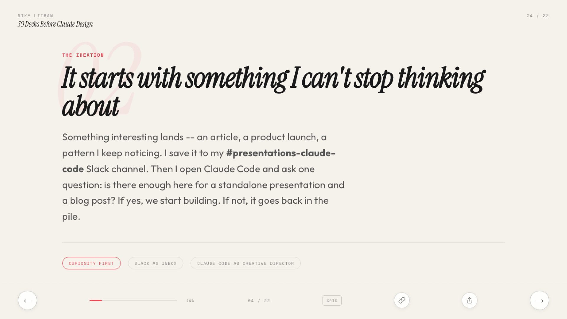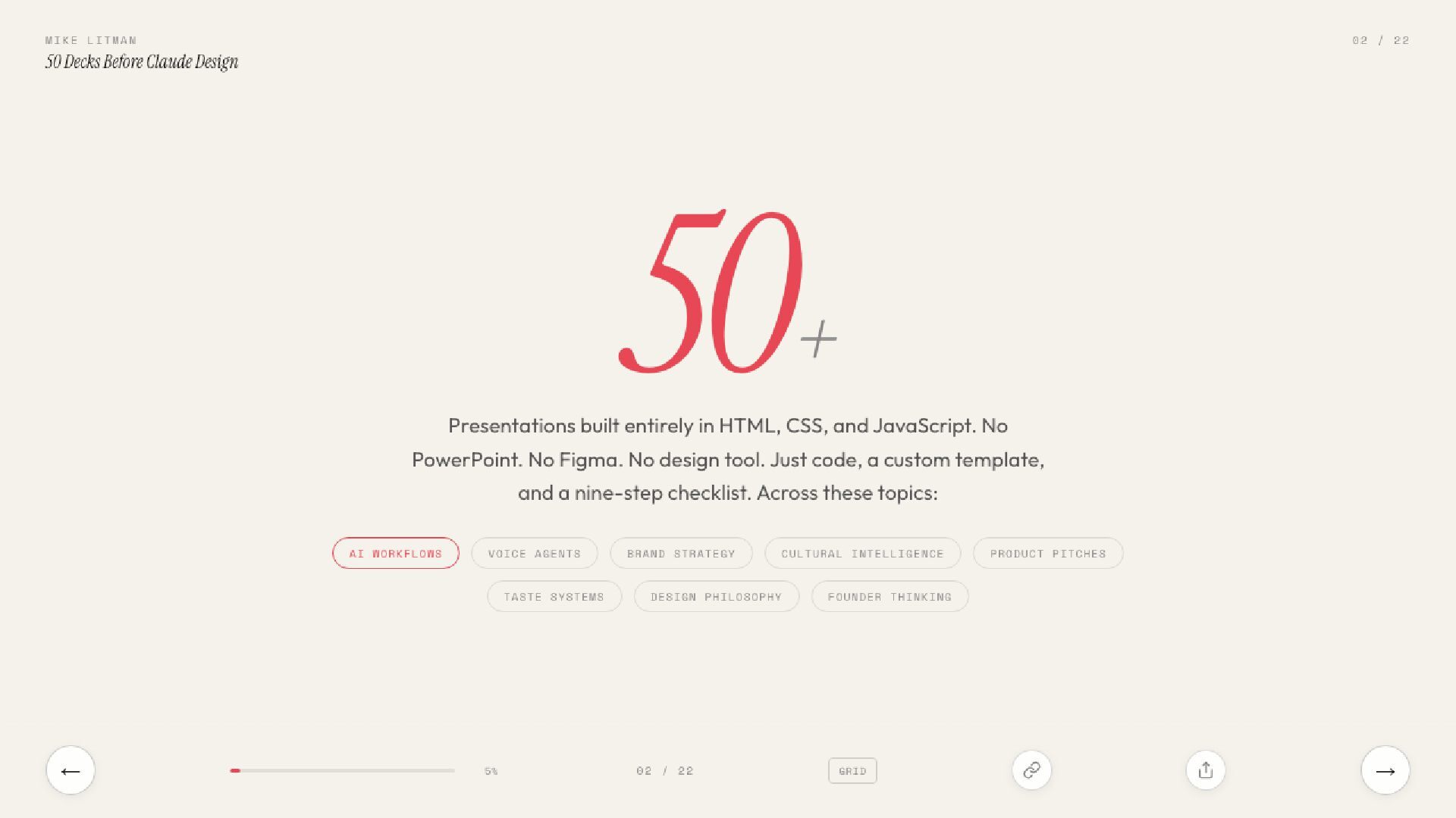 22 slides on building 50 presentations before Claude Design existed: the curation system, the nine-step production pipeline, the shared template infrastructure, the content engine that turns one deck into four formats, and the time collapse from two weeks to hours. Plus first-hand reactions from two Anthropic insiders on launch day.