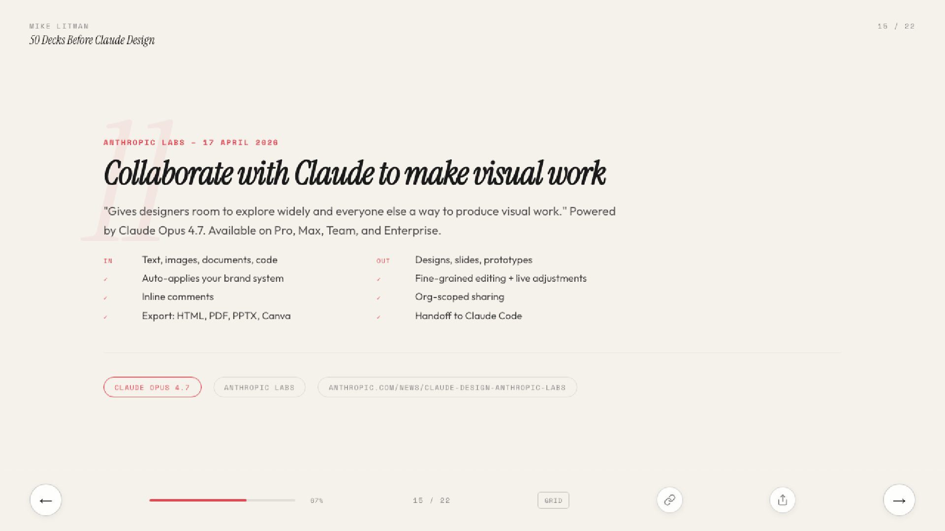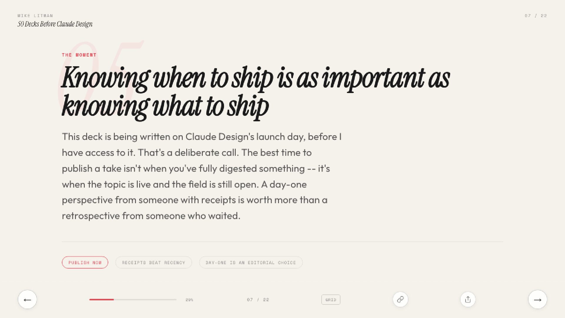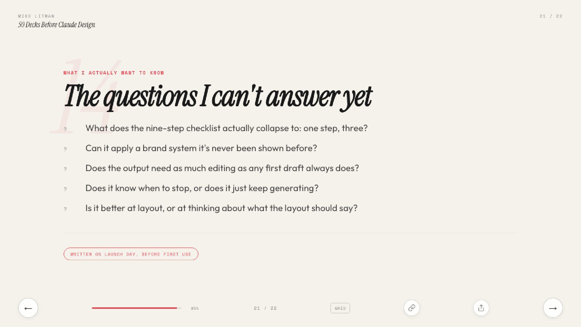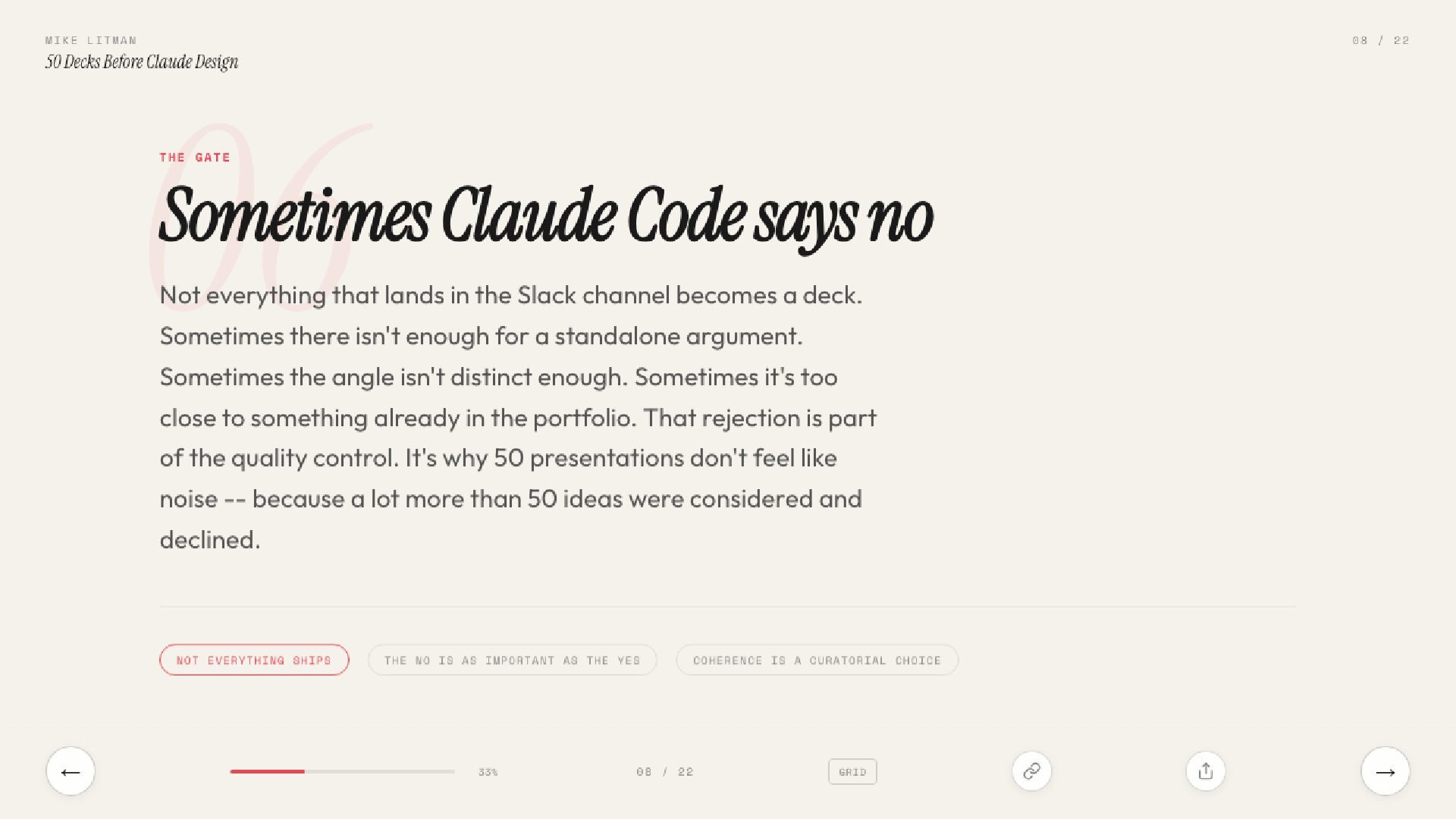22 slides on building 50 presentations before Claude Design existed: the curation system, the nine-step production pipeline, the shared template infrastructure, the content engine that turns one deck into four formats, and the time collapse from two weeks to hours. Plus first-hand reactions from two Anthropic insiders on launch day.
