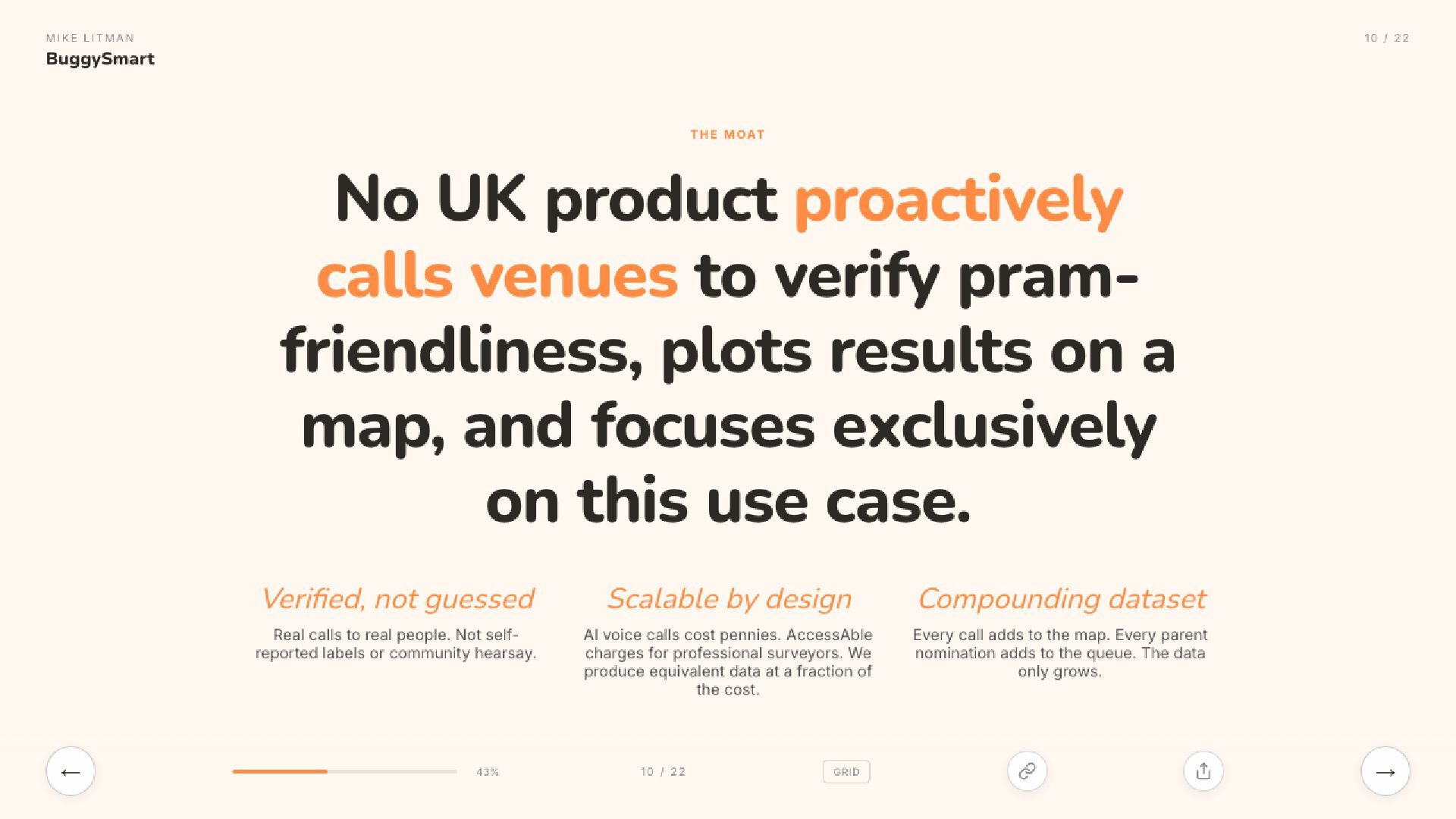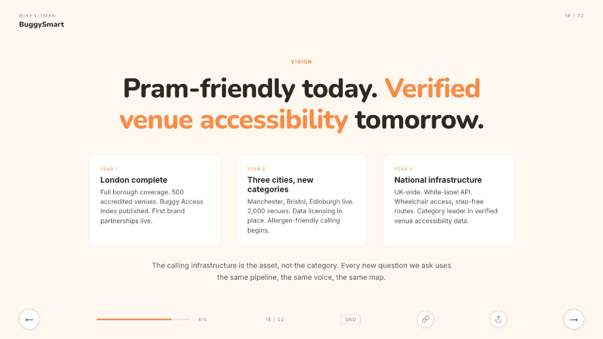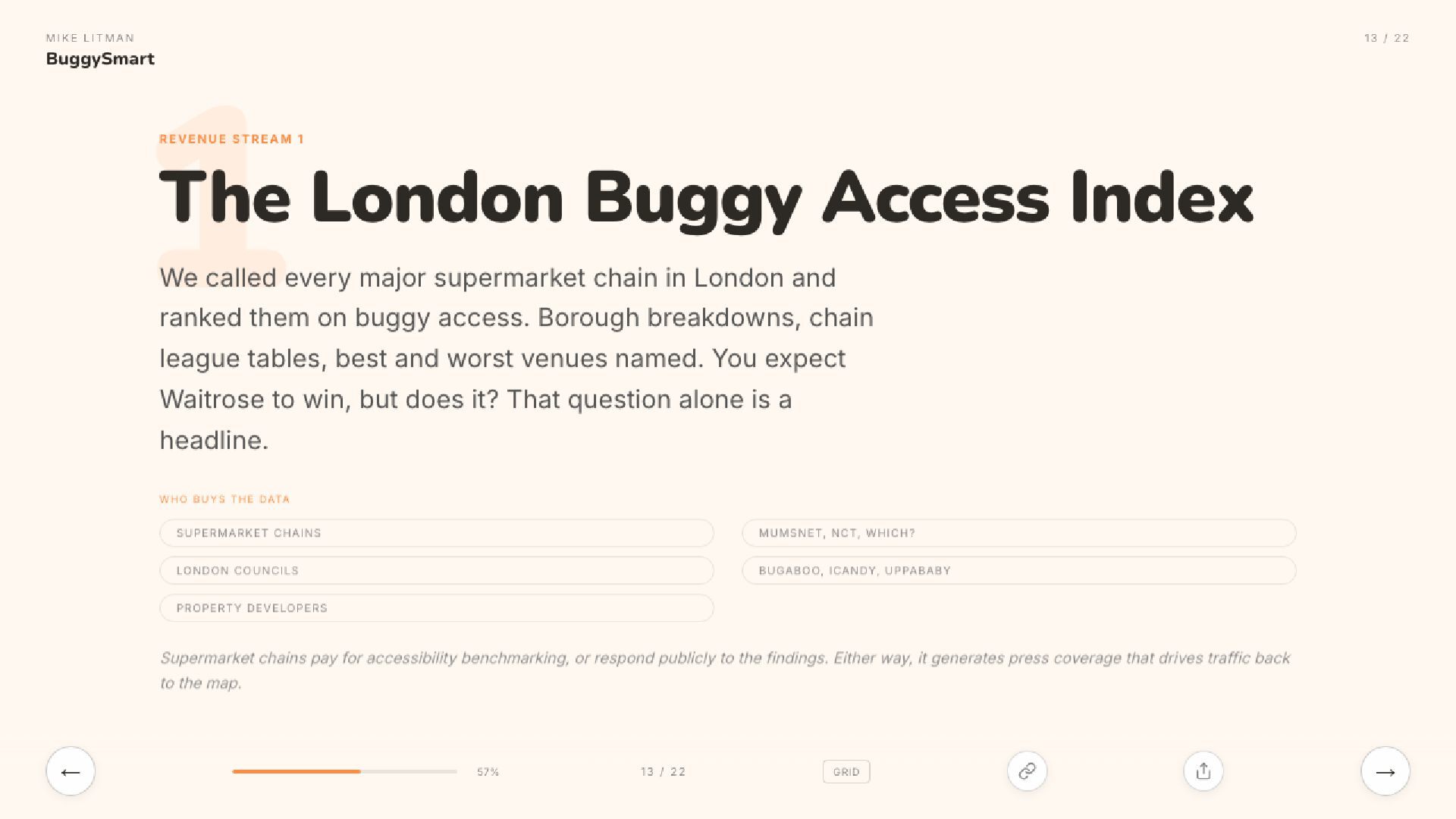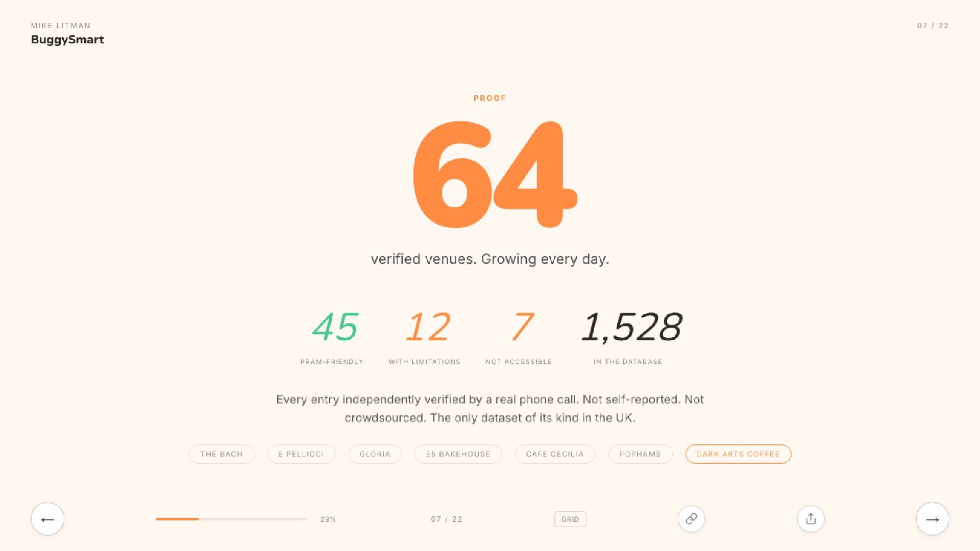 BuggySmart verifies pram-friendly venues in London via AI phone calls. 64 venues mapped. Three revenue streams: The London Buggy Access Index, Buggy Smart Verified accreditation, and data licensing to parenting apps and Google Maps.