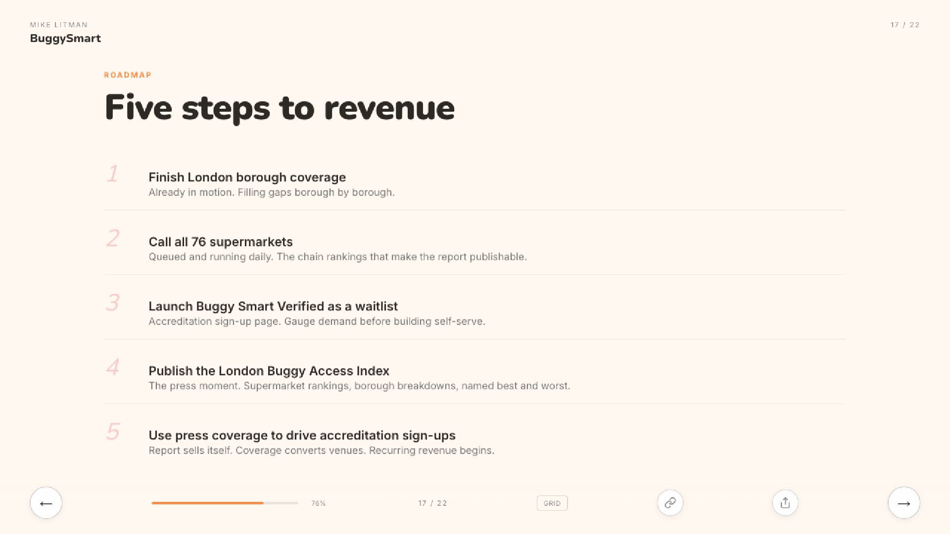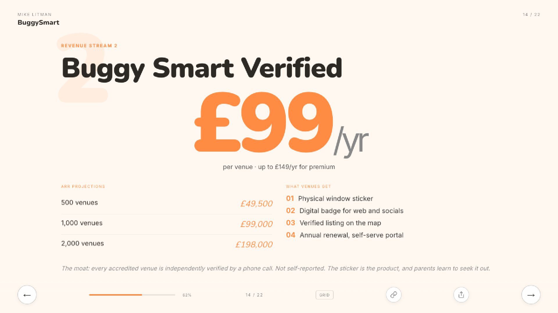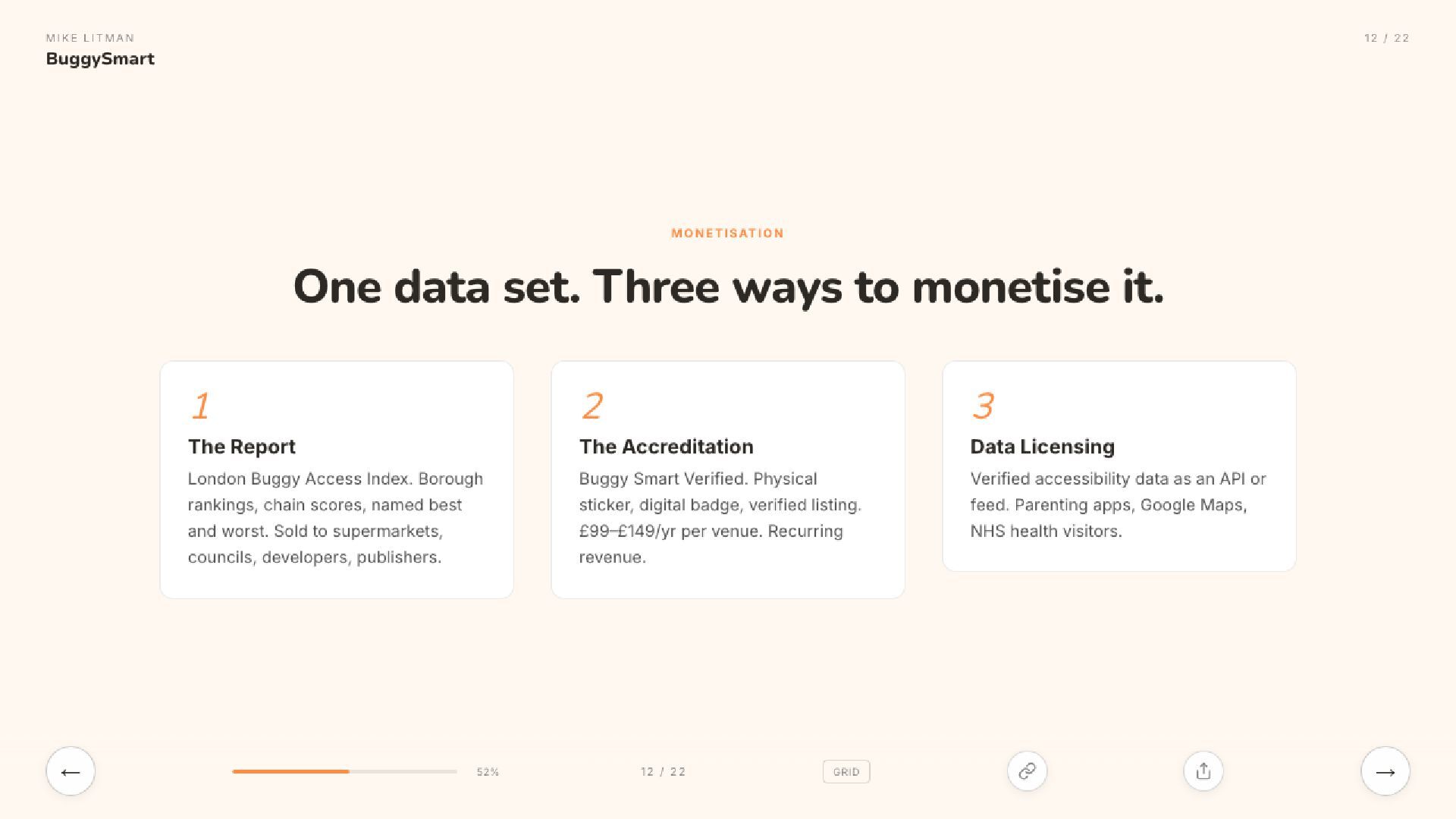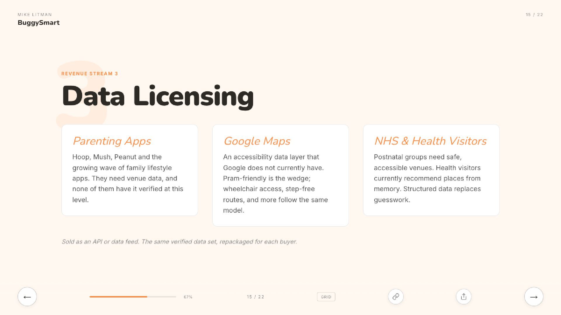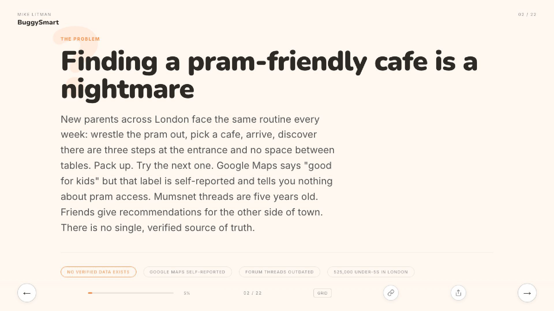 BuggySmart verifies pram-friendly venues in London via AI phone calls. 64 venues mapped. Three revenue streams: The London Buggy Access Index, Buggy Smart Verified accreditation, and data licensing to parenting apps and Google Maps.