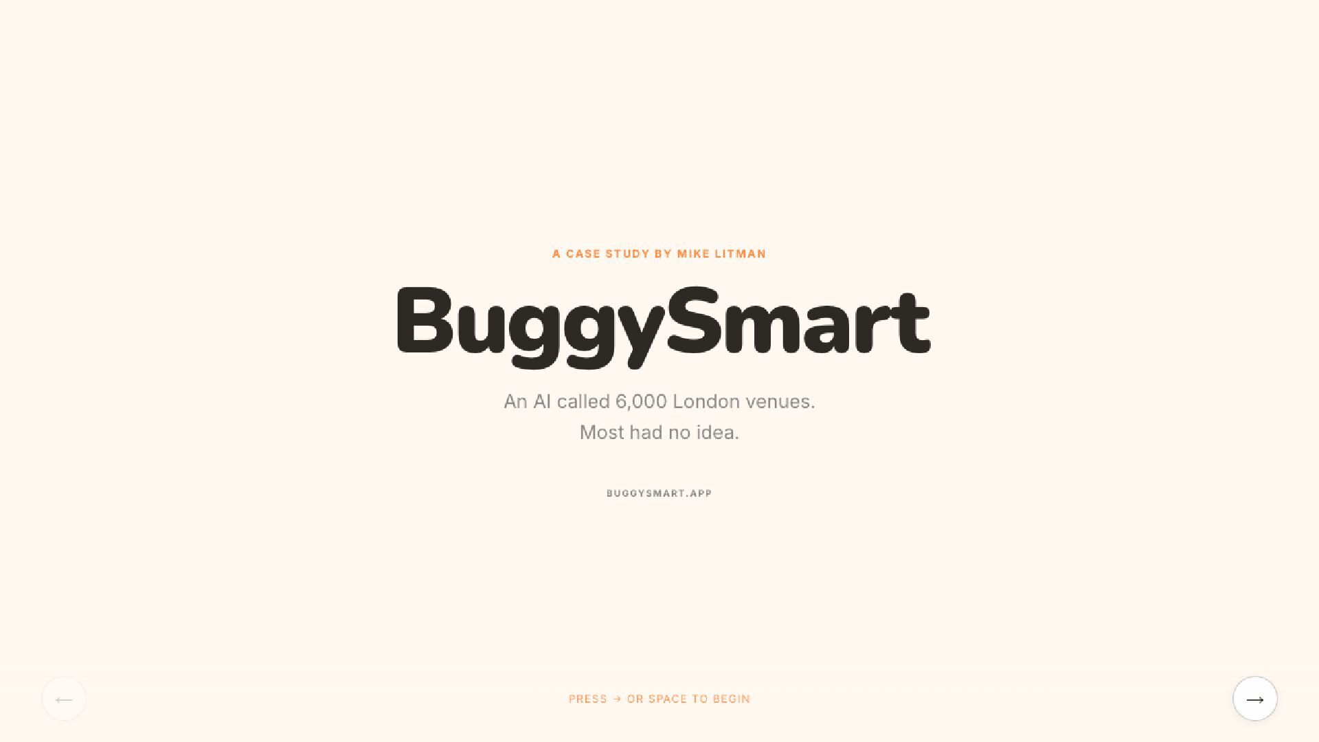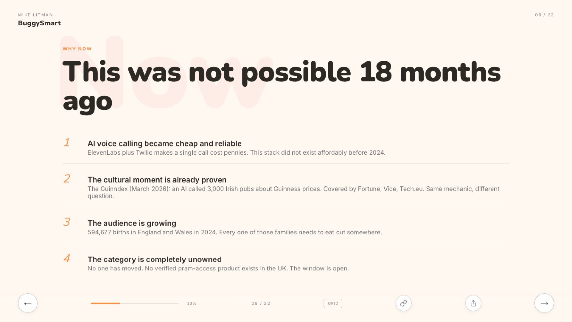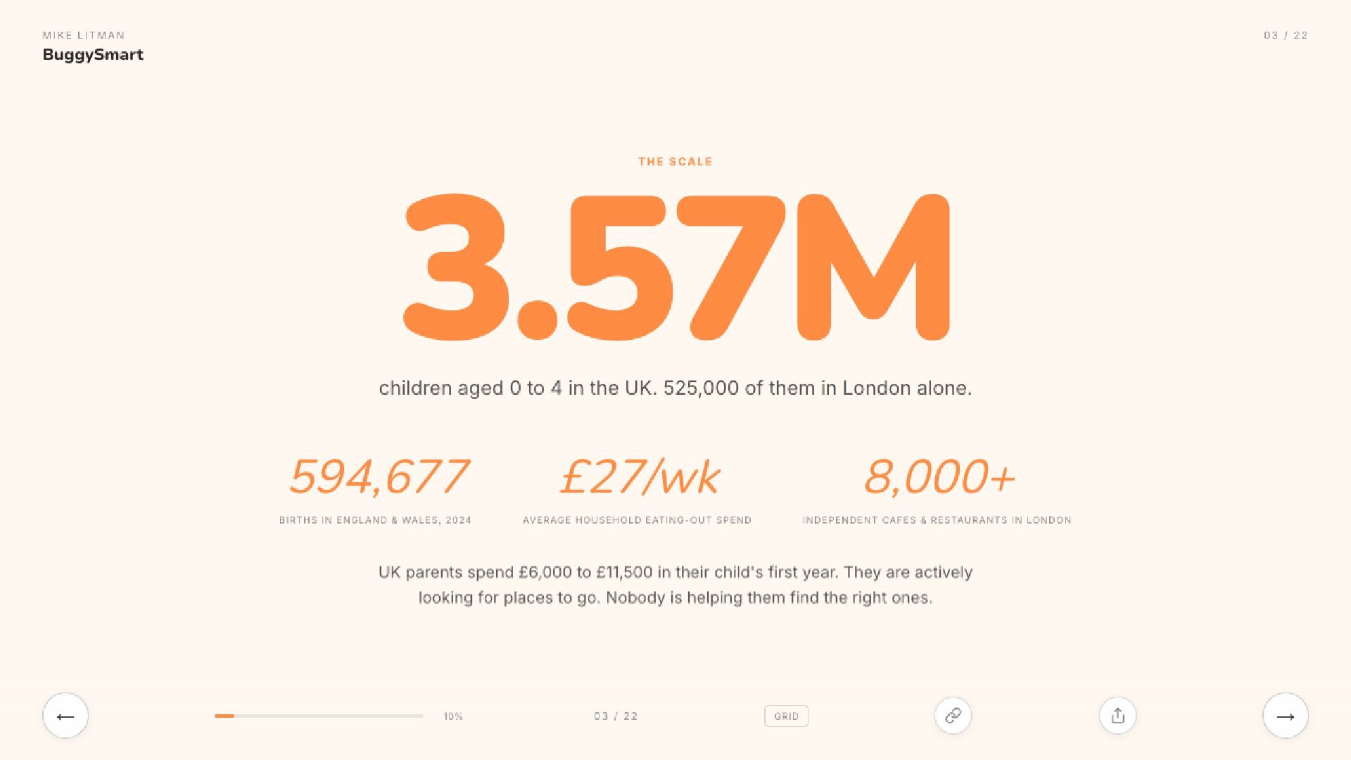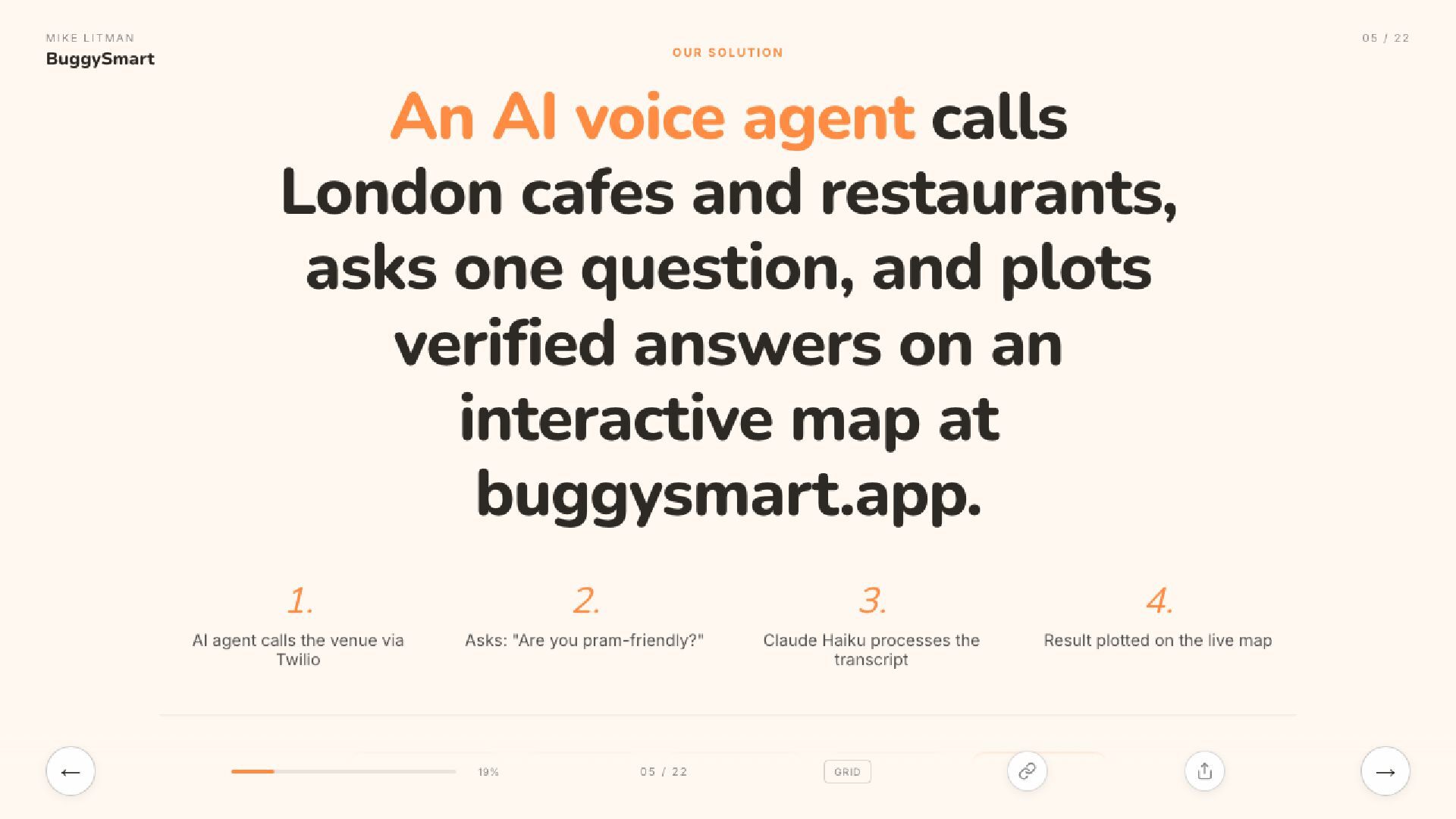 BuggySmart verifies pram-friendly venues in London via AI phone calls. 64 venues mapped. Three revenue streams: The London Buggy Access Index, Buggy Smart Verified accreditation, and data licensing to parenting apps and Google Maps.