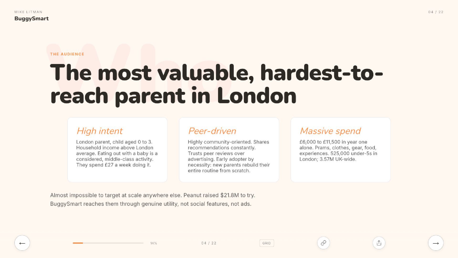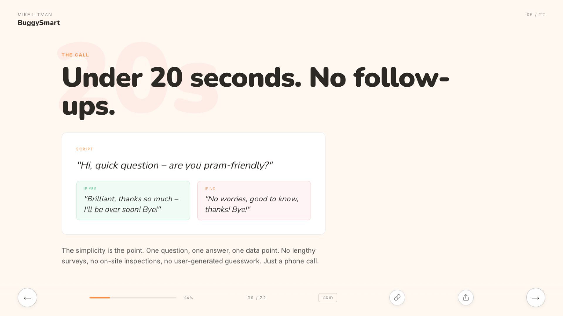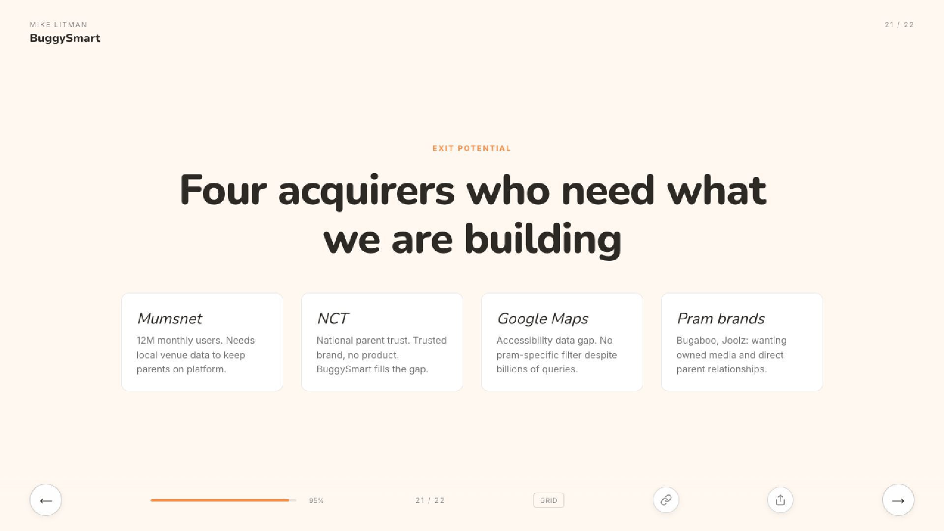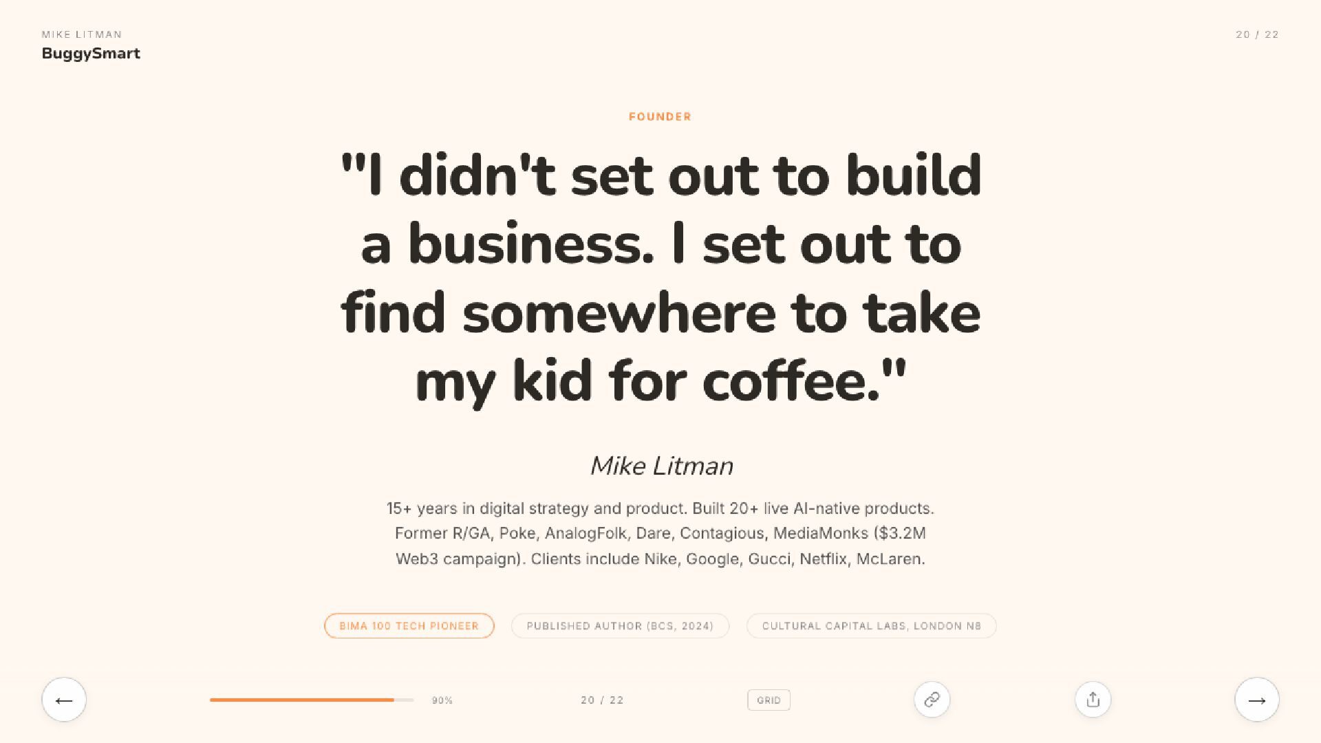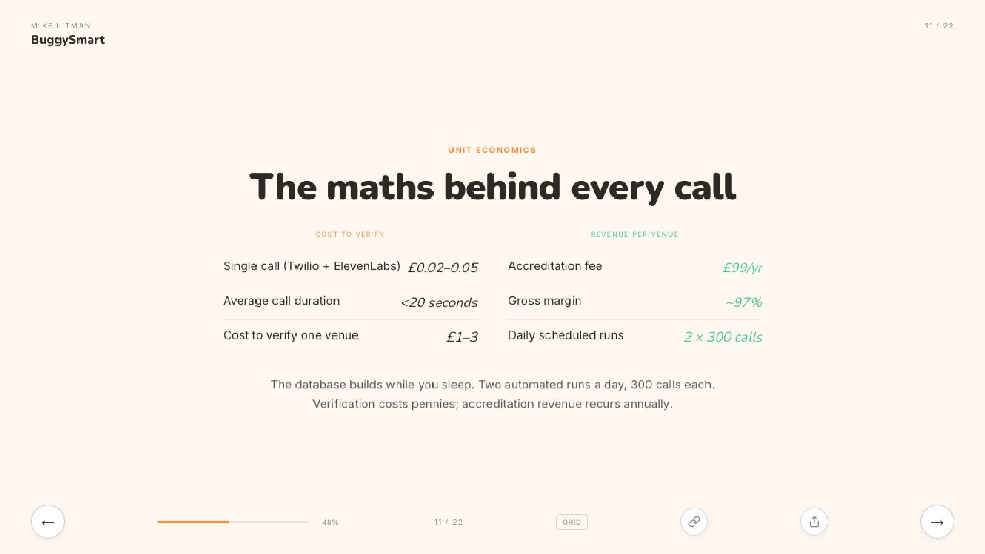 BuggySmart verifies pram-friendly venues in London via AI phone calls. 64 venues mapped. Three revenue streams: The London Buggy Access Index, Buggy Smart Verified accreditation, and data licensing to parenting apps and Google Maps.