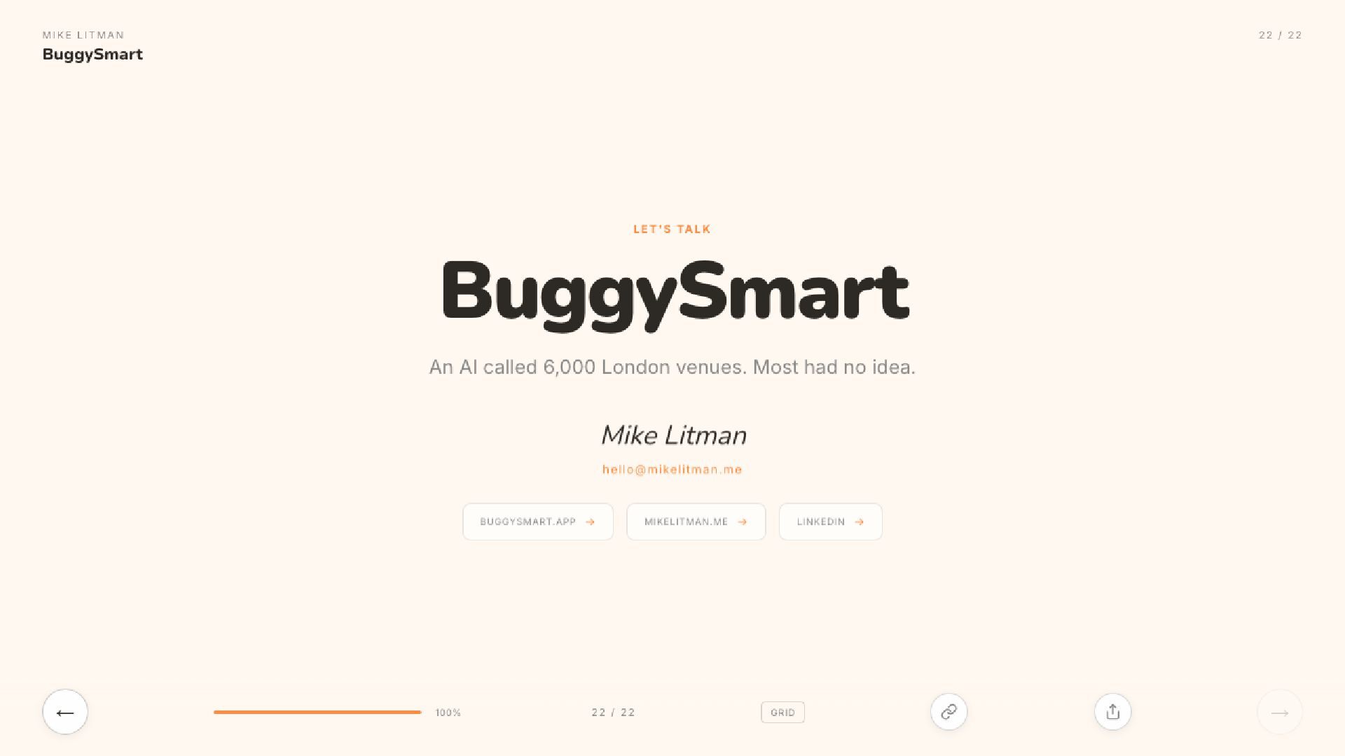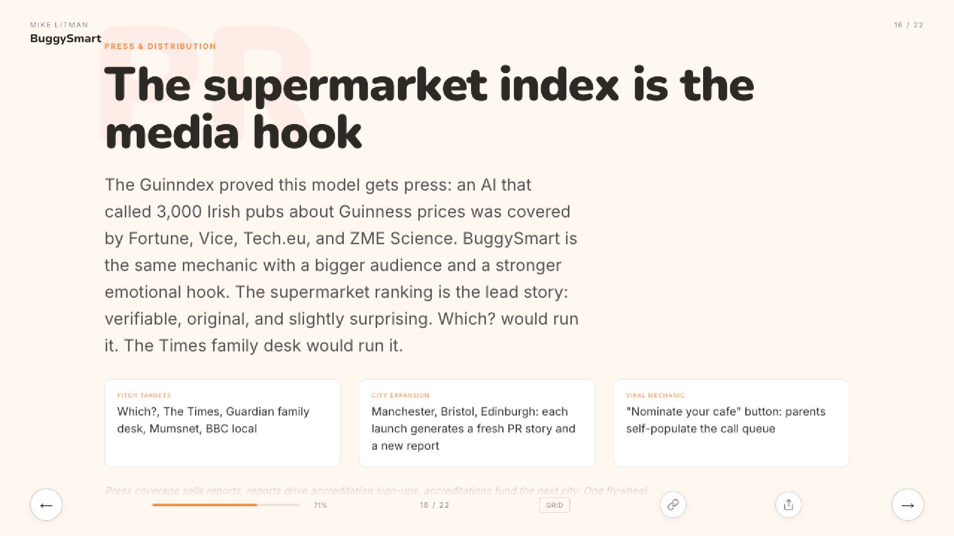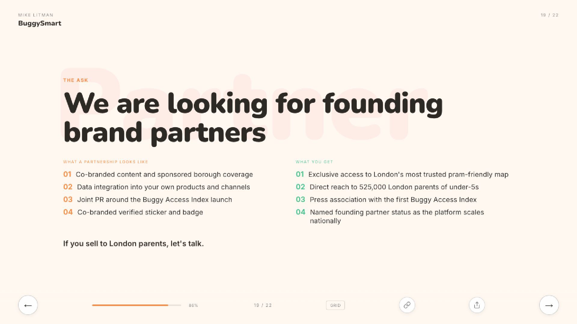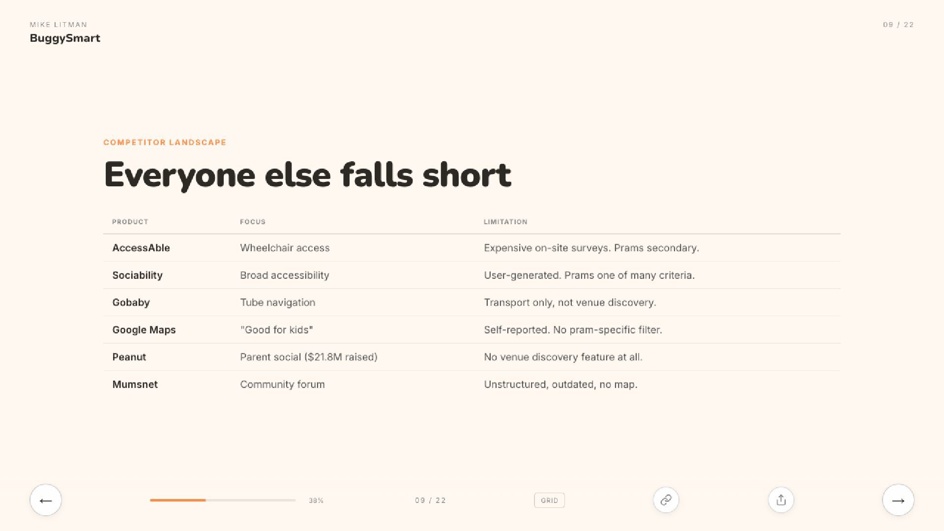 BuggySmart verifies pram-friendly venues in London via AI phone calls. 64 venues mapped. Three revenue streams: The London Buggy Access Index, Buggy Smart Verified accreditation, and data licensing to parenting apps and Google Maps.