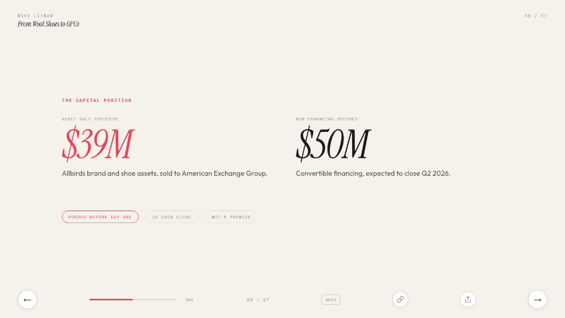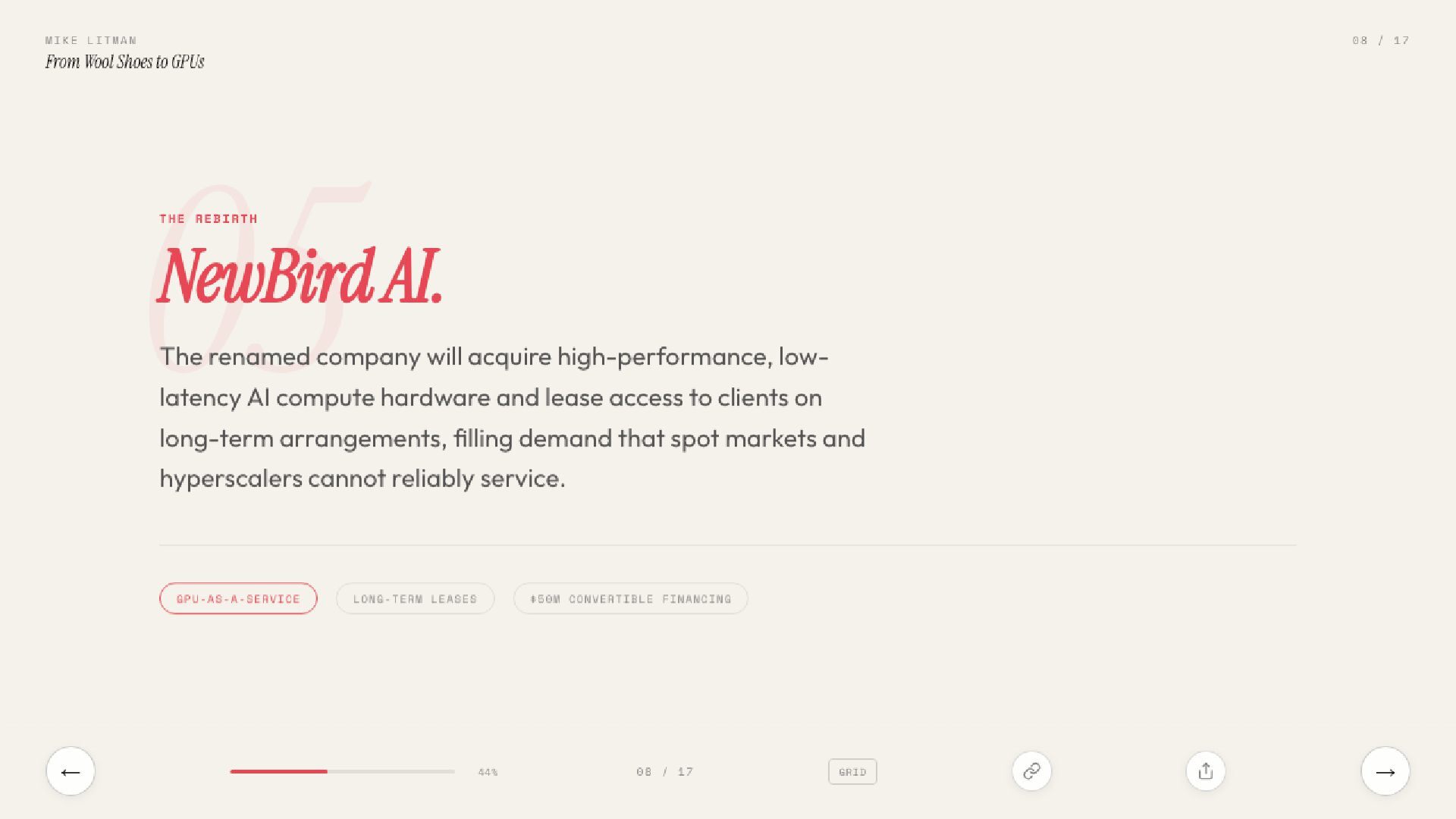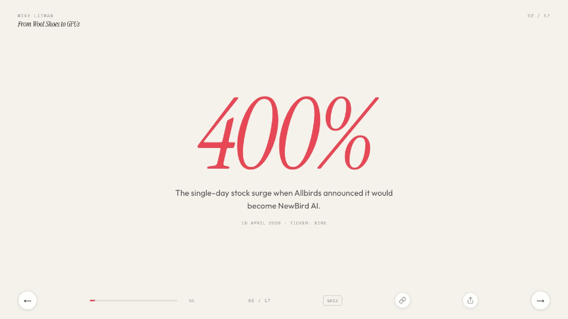 On 15 April 2026, Allbirds announced it would sell its brand and shoe assets to become NewBird AI, a GPU-as-a-Service provider. The stock spiked 400%. With $39M from the asset sale and $50M in new convertible financing, this is either the greatest reinvention in recent memory or the next Long Blockchain Corp.