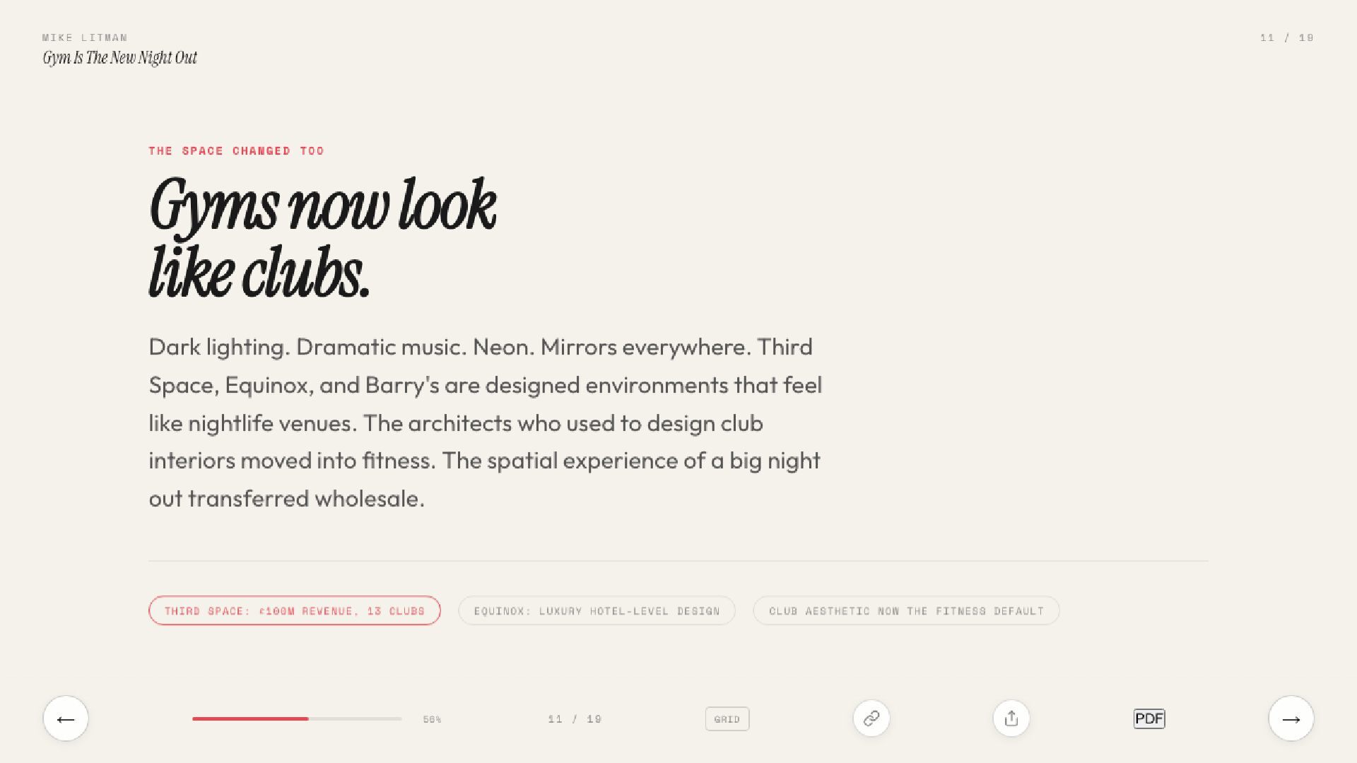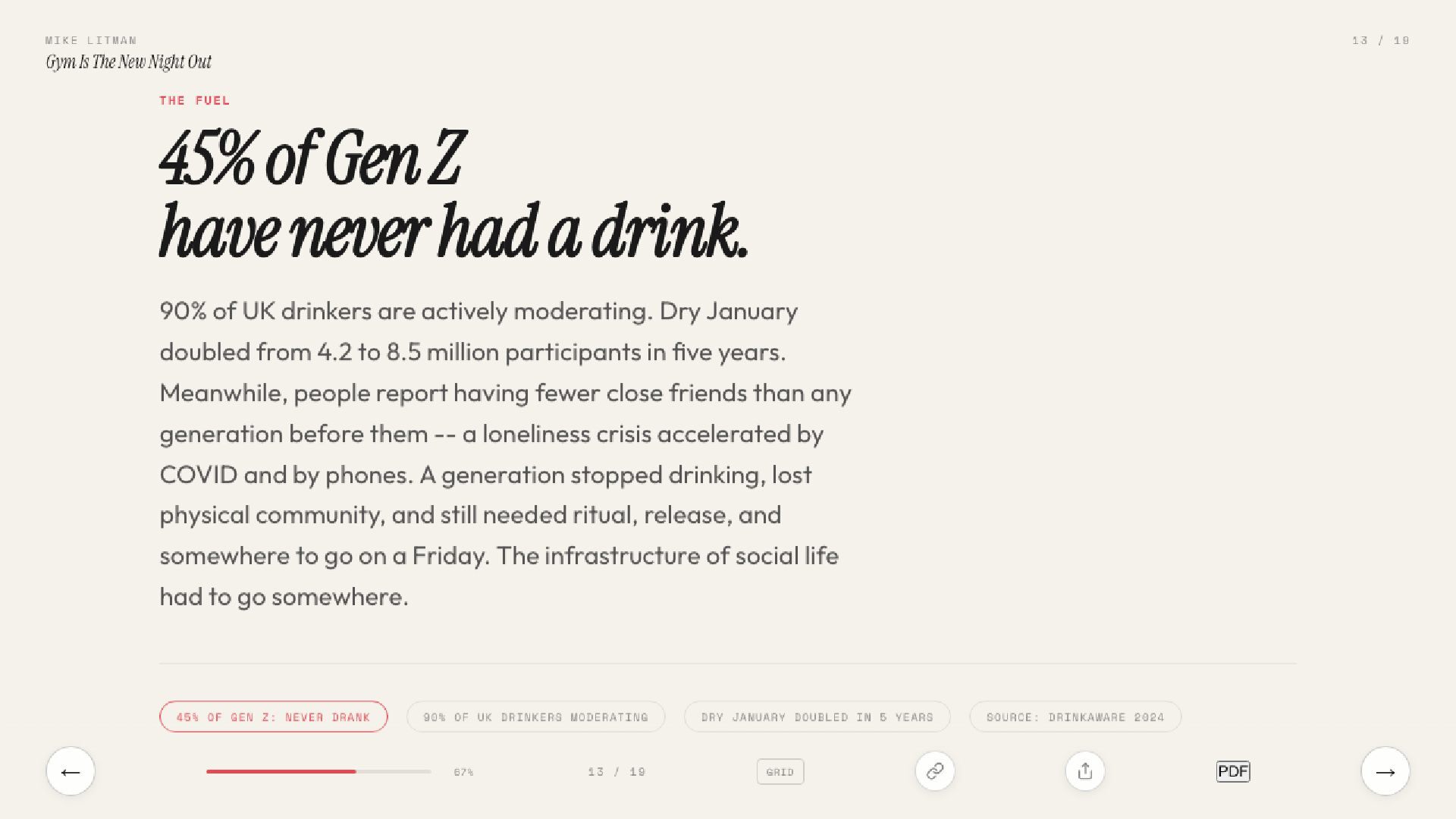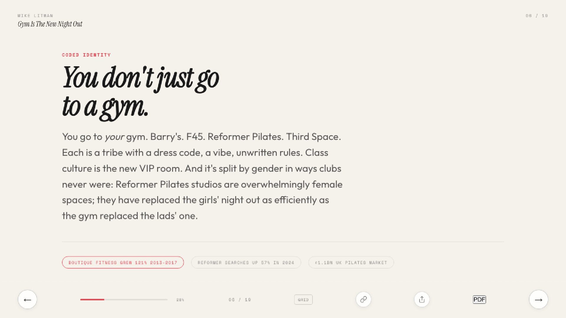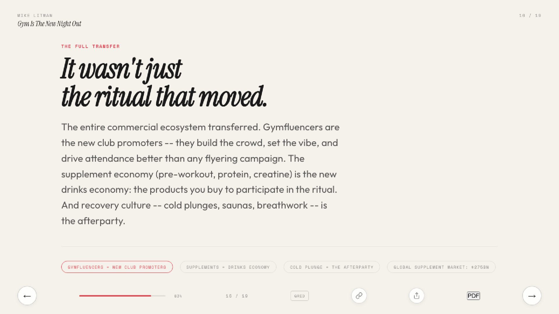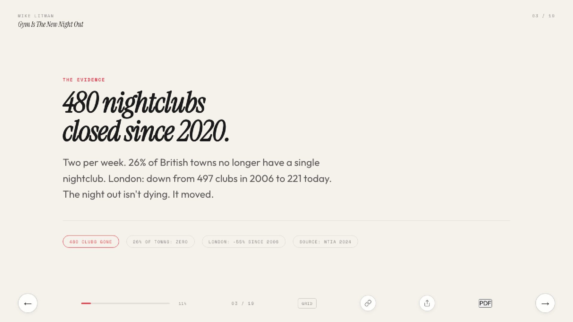480 UK nightclubs closed since 2020. Two per week. Meanwhile boutique fitness grew 121%, Gen Z are 4x more likely to meet people at the gym than a bar, and Barry's has a DJ booth. The night out didn't die. It just got up earlier.