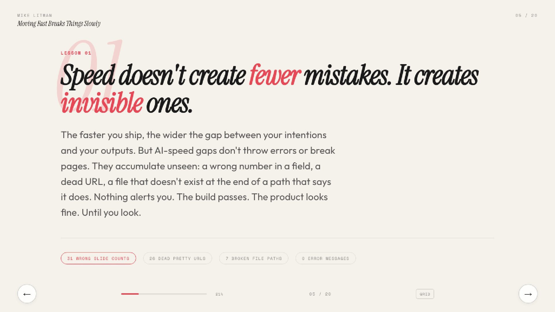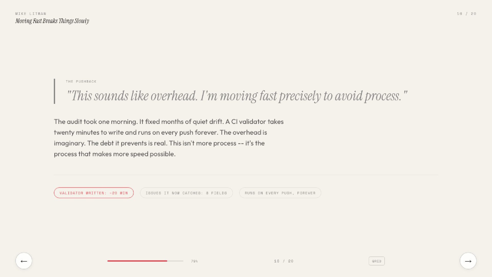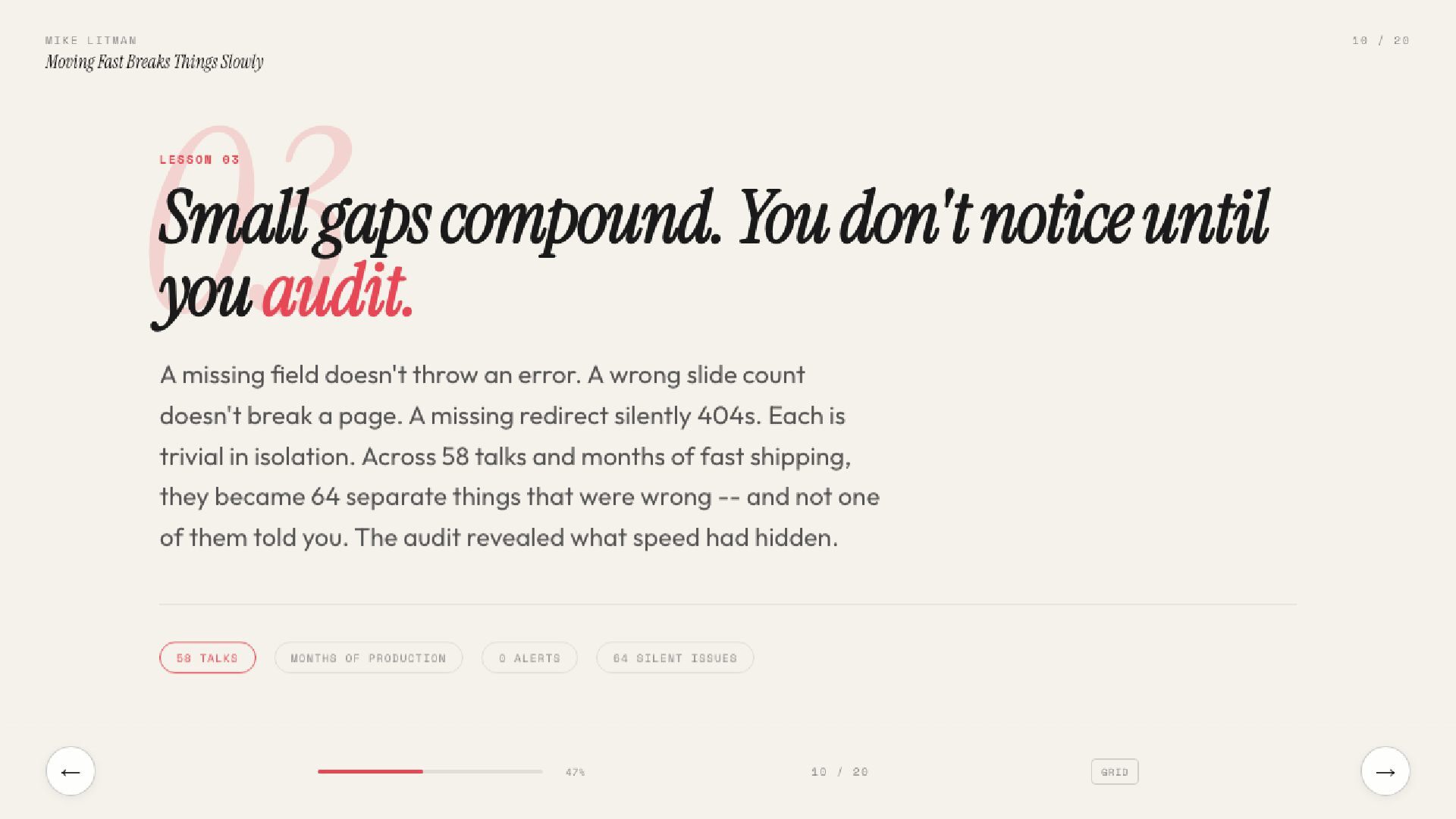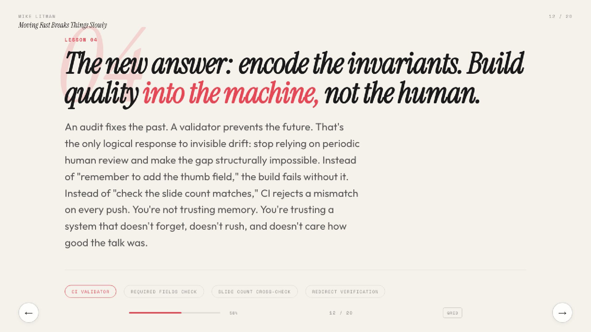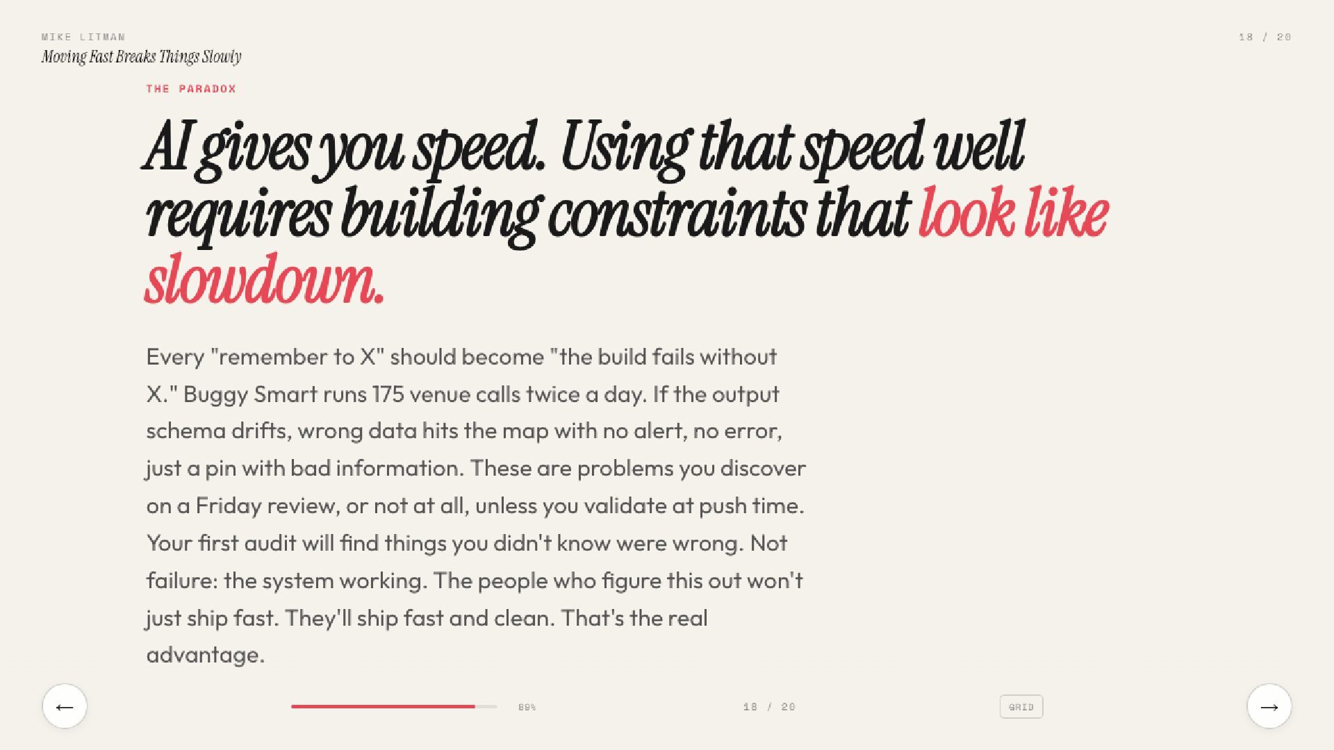20 slides on why moving fast with AI creates a new category of failure: errors that don't crash, don't alert, and accumulate across months of production. The morning audit that found 64 silent issues, the case for encoding quality into CI instead of human memory, and what 'done' actually means when the build is the check.