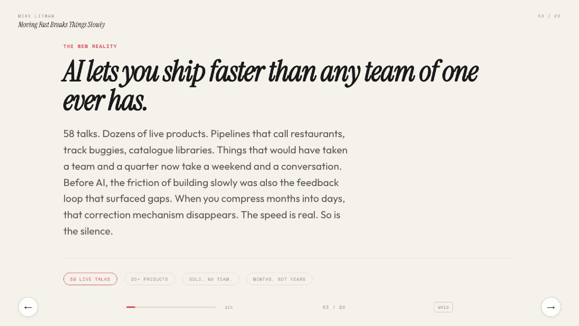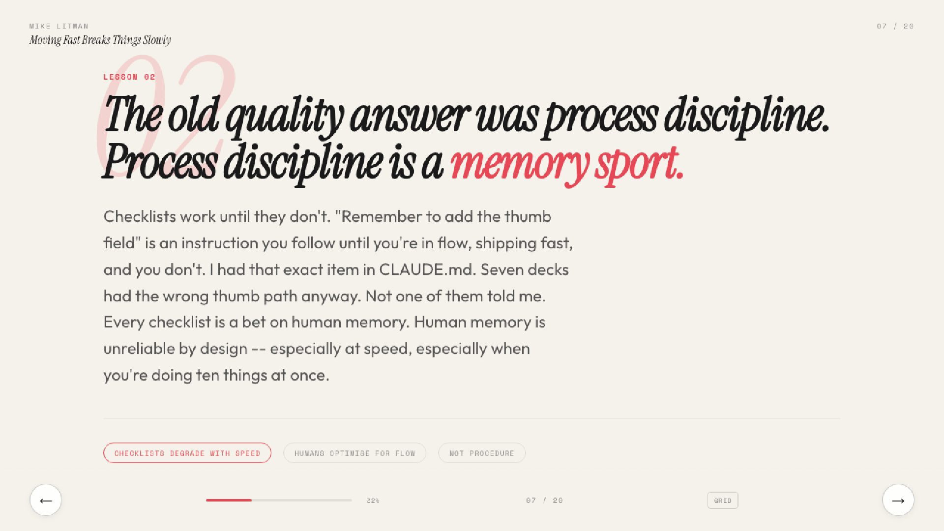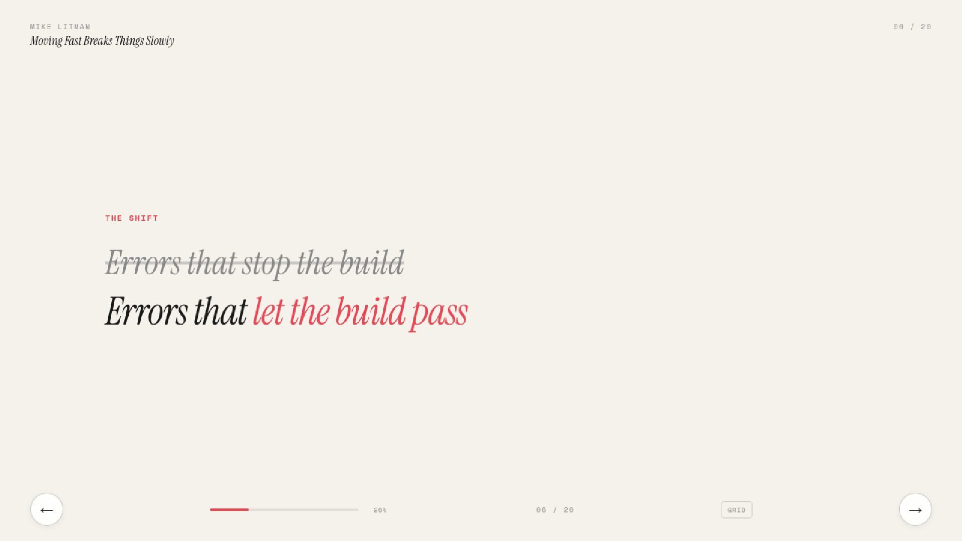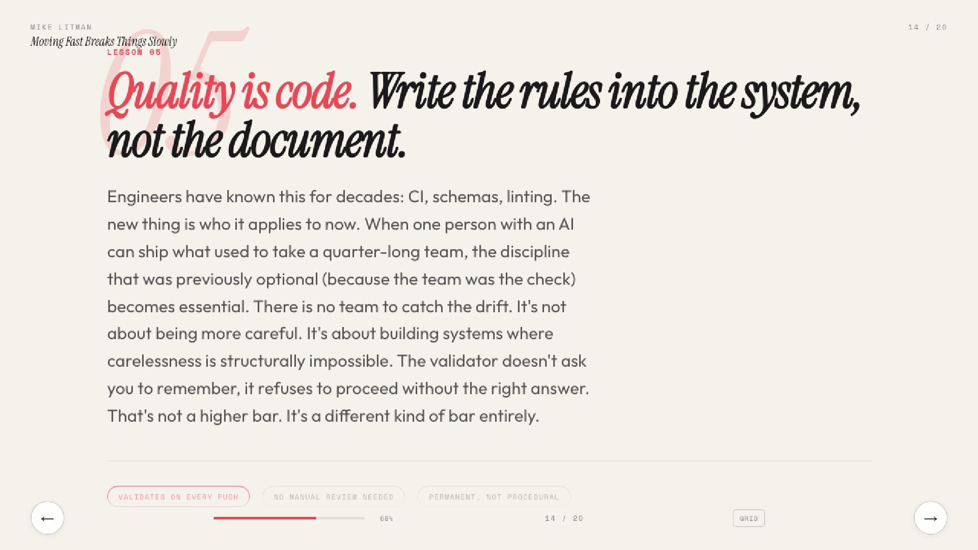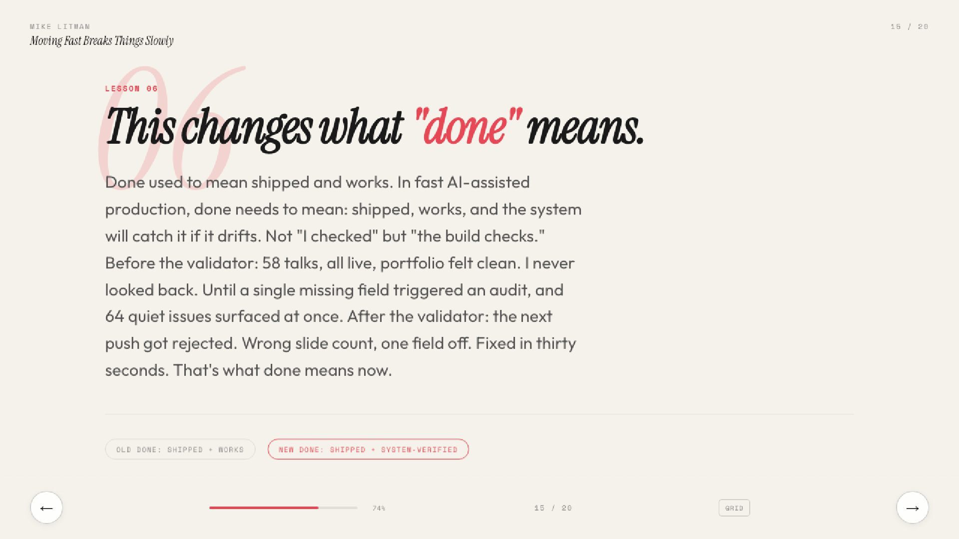 20 slides on why moving fast with AI creates a new category of failure: errors that don't crash, don't alert, and accumulate across months of production. The morning audit that found 64 silent issues, the case for encoding quality into CI instead of human memory, and what 'done' actually means when the build is the check.
