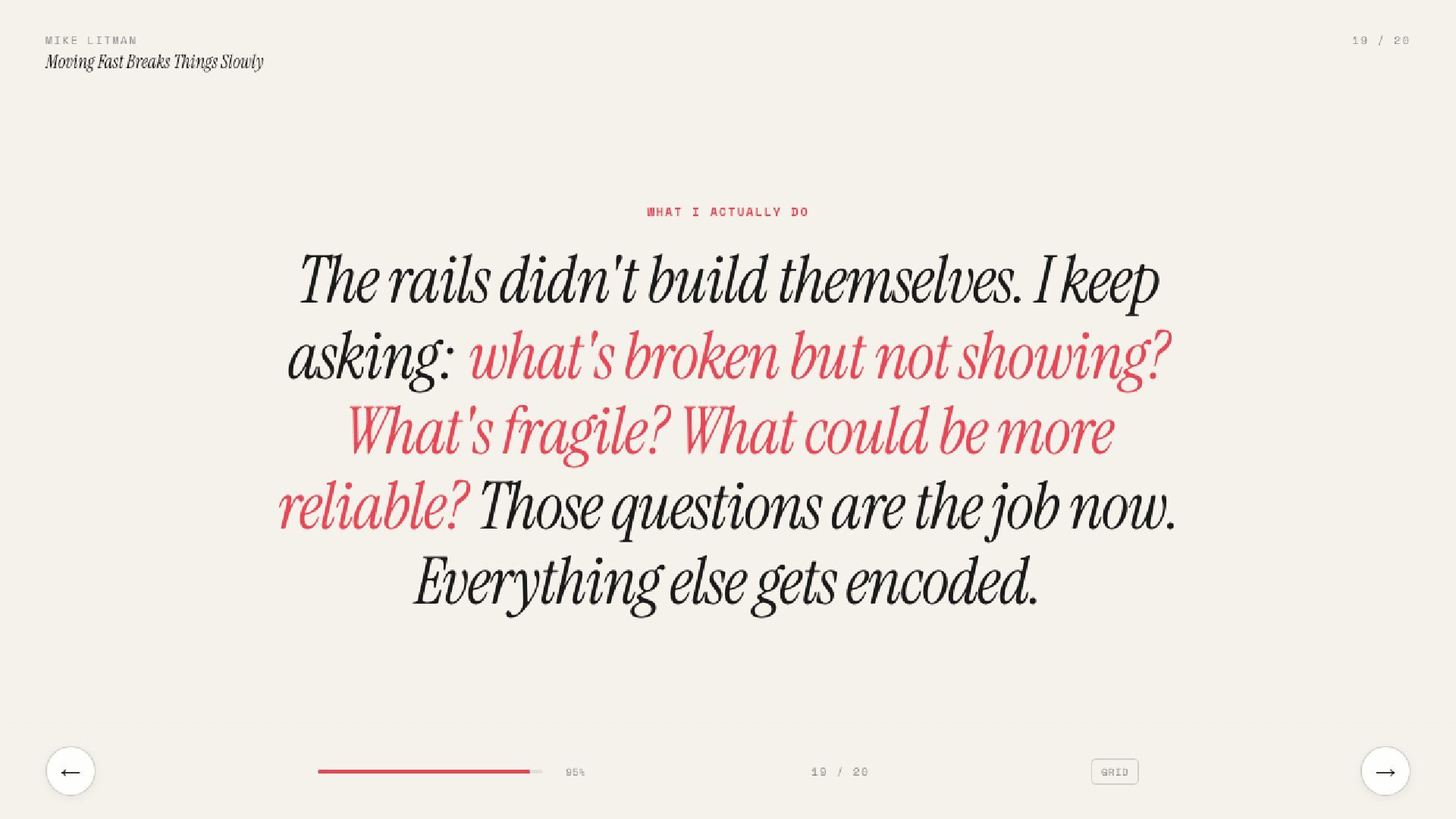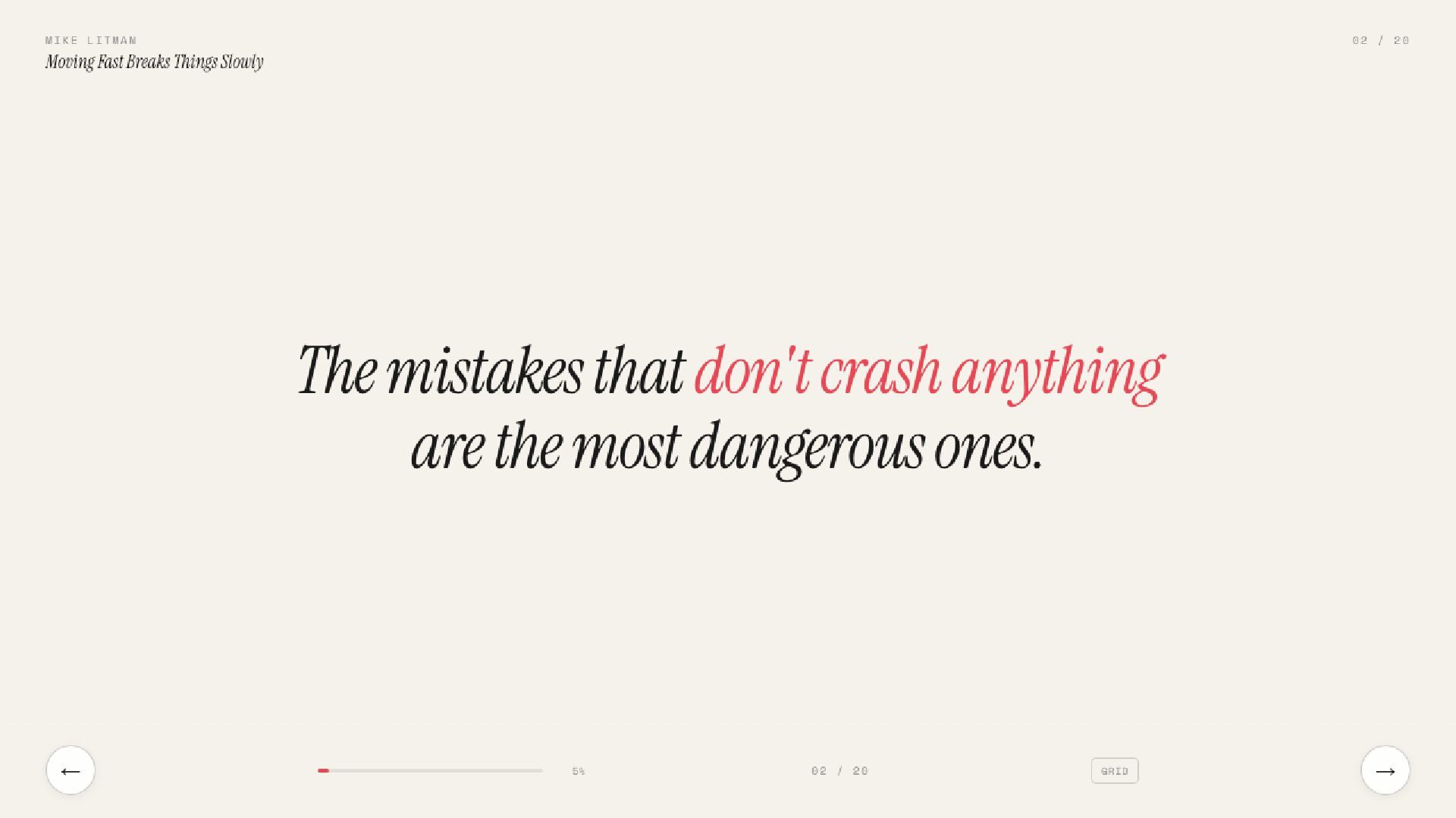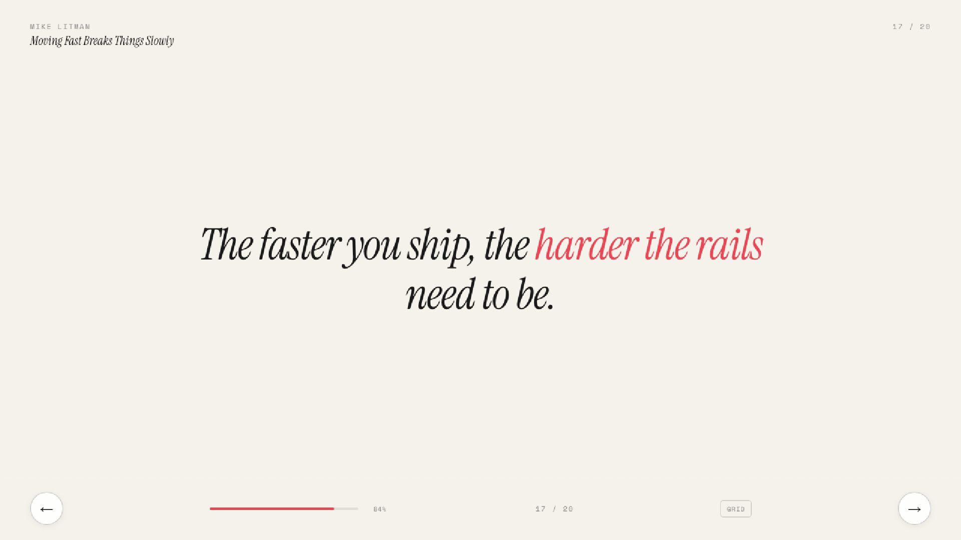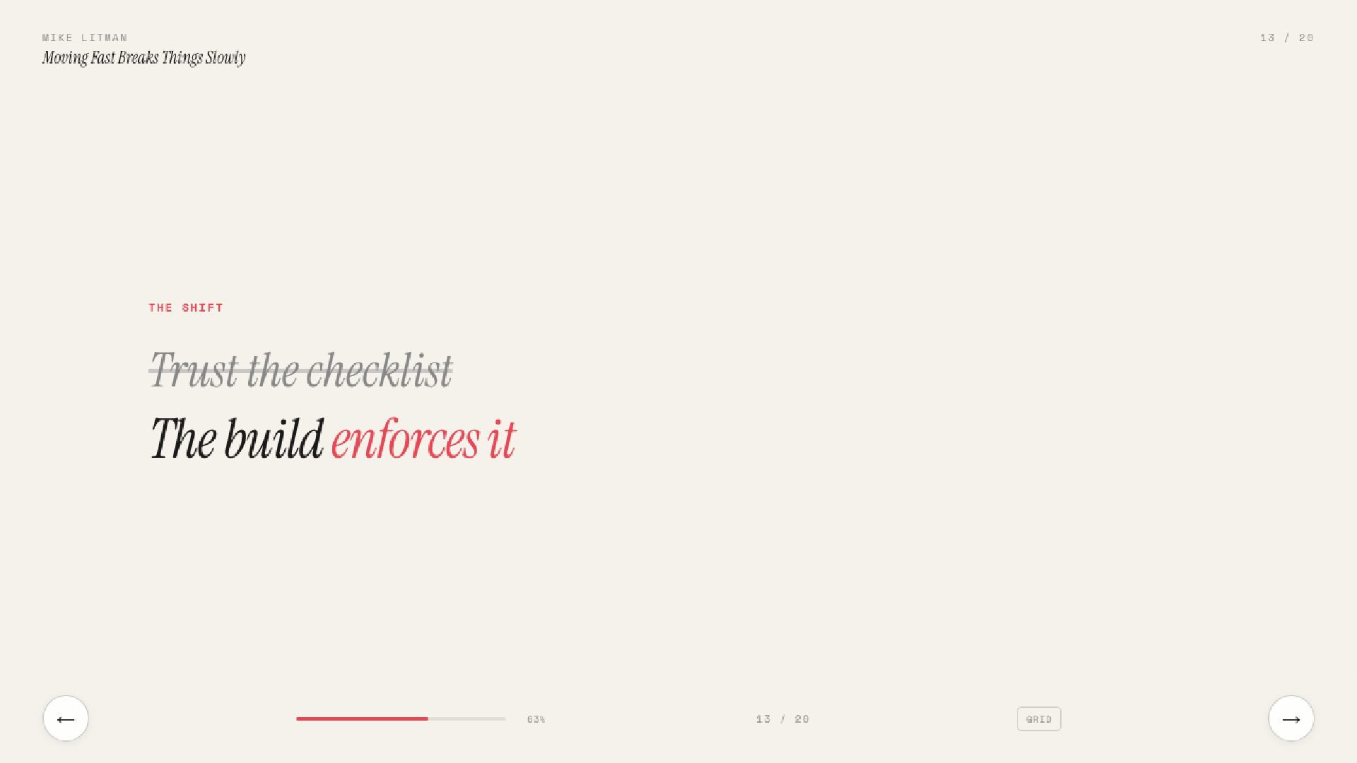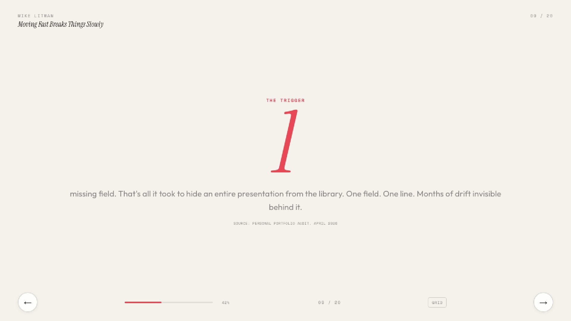 20 slides on why moving fast with AI creates a new category of failure: errors that don't crash, don't alert, and accumulate across months of production. The morning audit that found 64 silent issues, the case for encoding quality into CI instead of human memory, and what 'done' actually means when the build is the check.