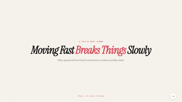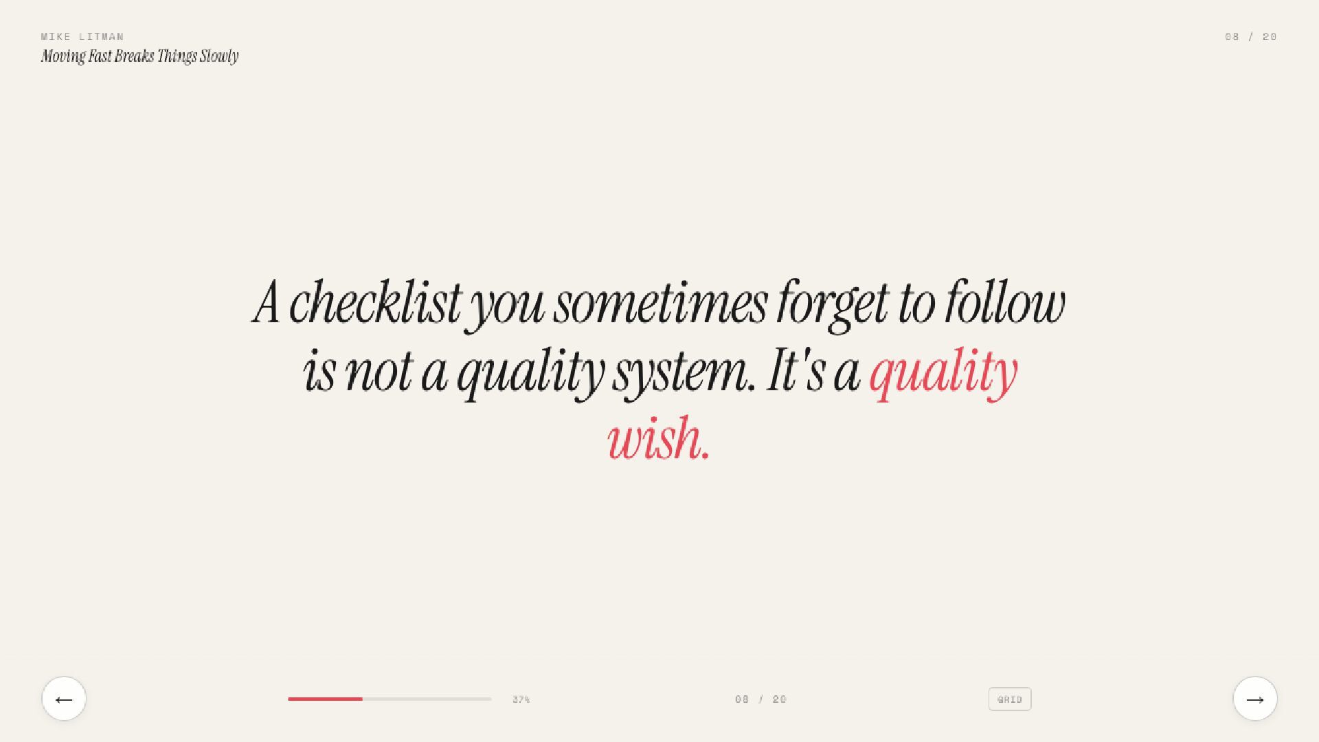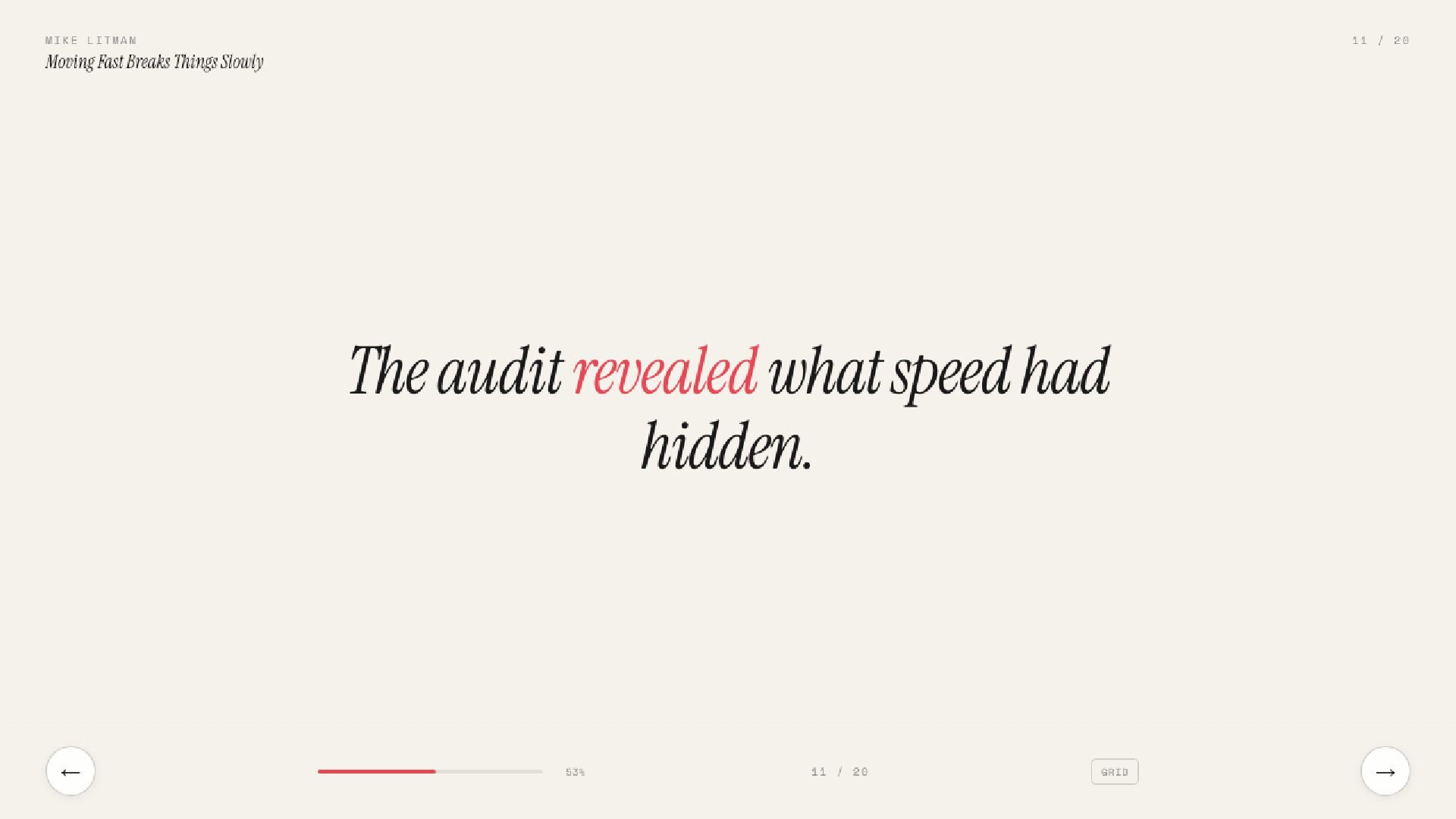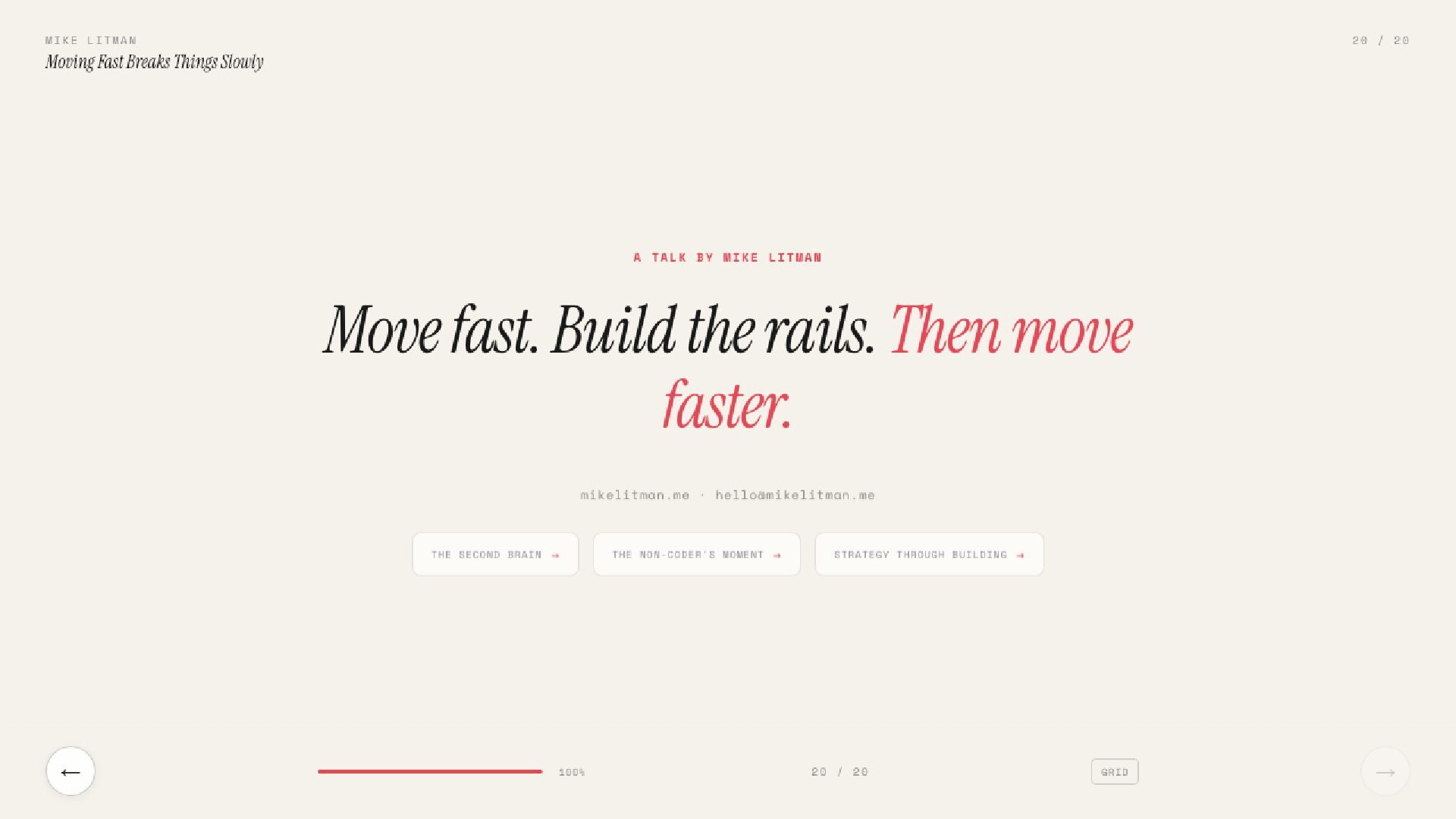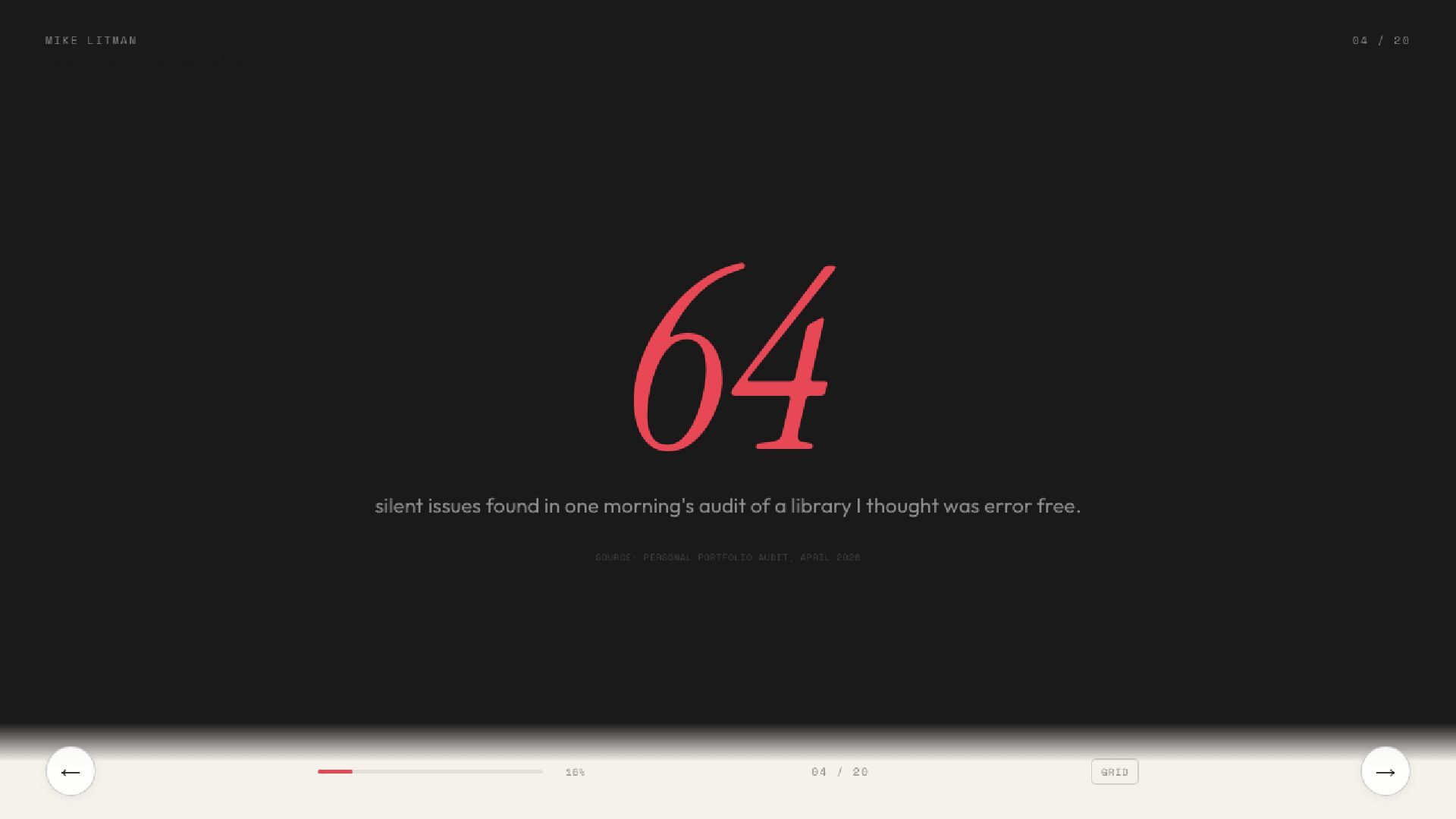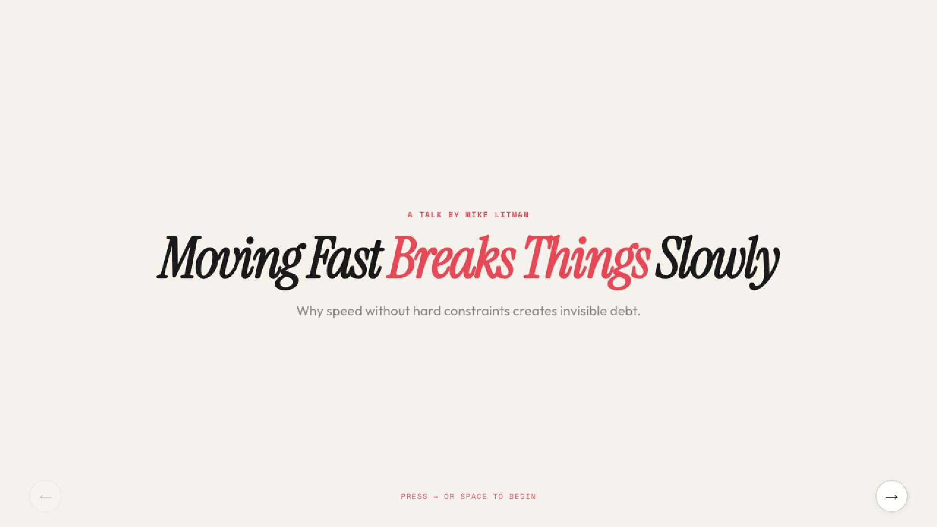 20 slides on why moving fast with AI creates a new category of failure: errors that don't crash, don't alert, and accumulate across months of production. The morning audit that found 64 silent issues, the case for encoding quality into CI instead of human memory, and what 'done' actually means when the build is the check.