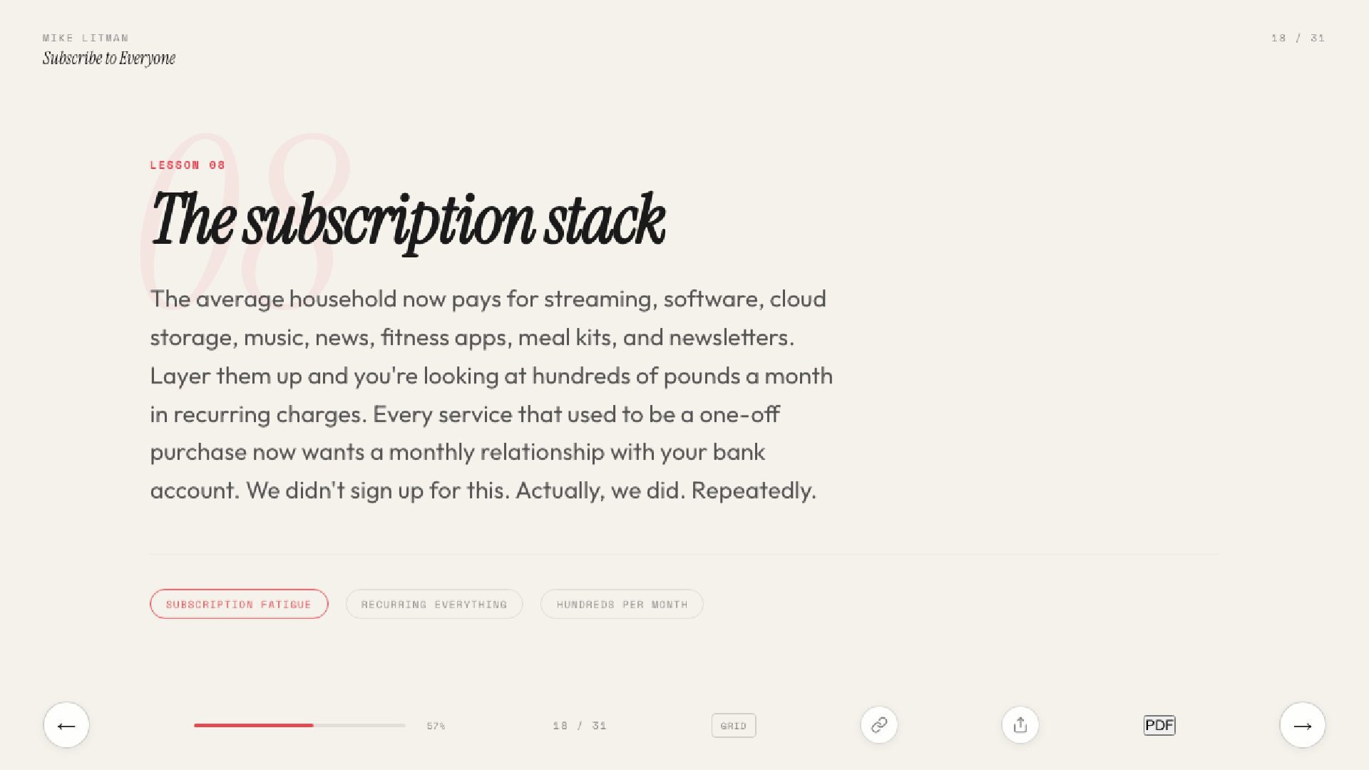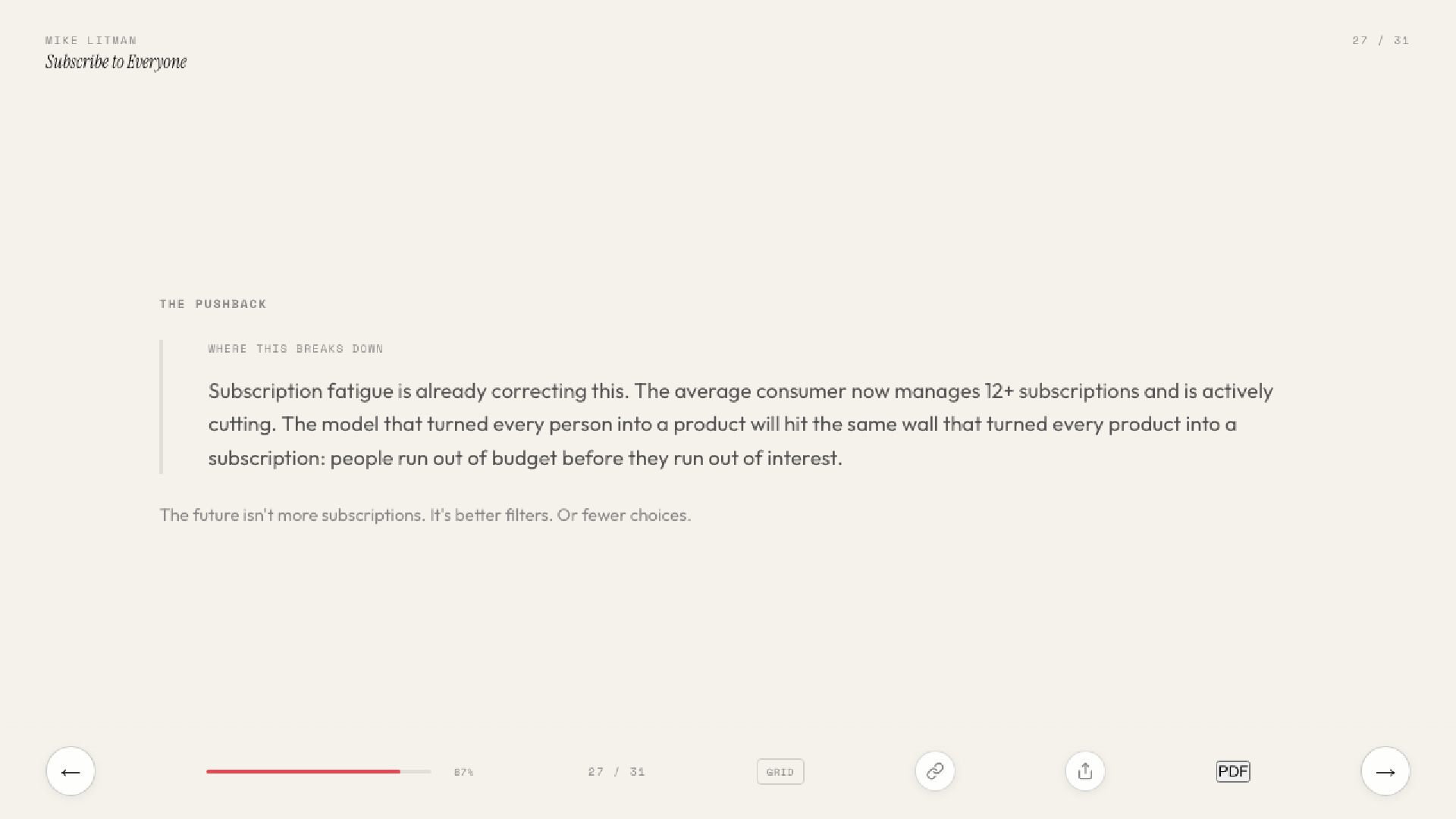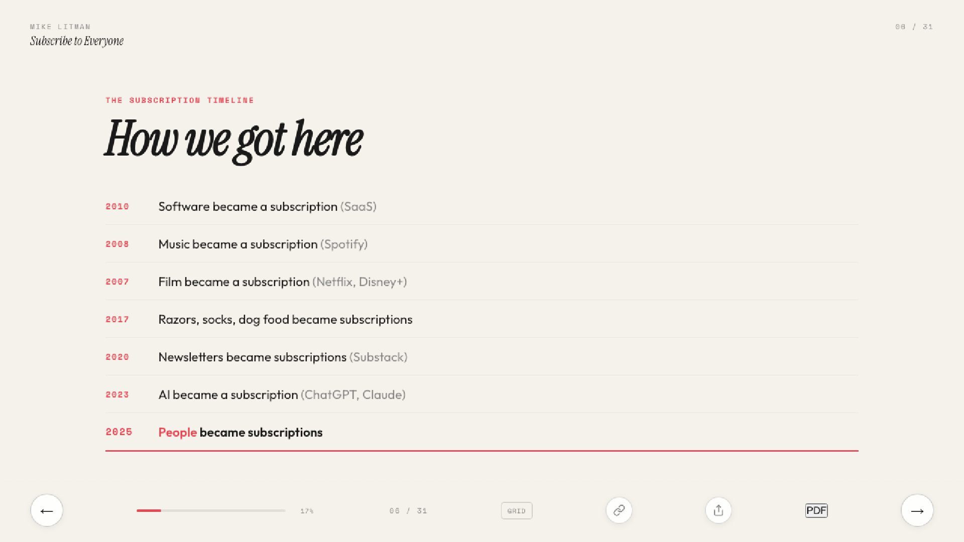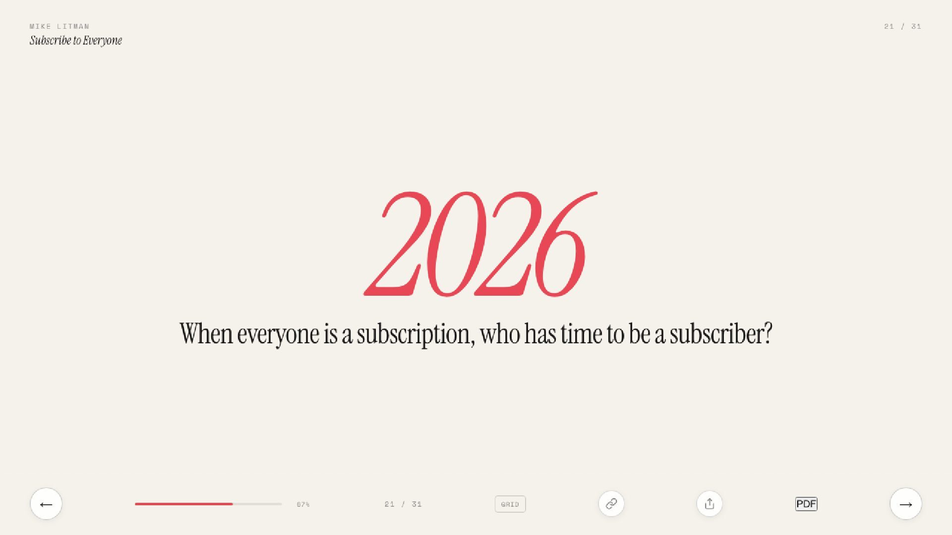 Is everything a subscription now? Is everyone? 29 slides on how we got here, why the discount wall is the new cable bundle, and where the subscription-to-people economy goes next.