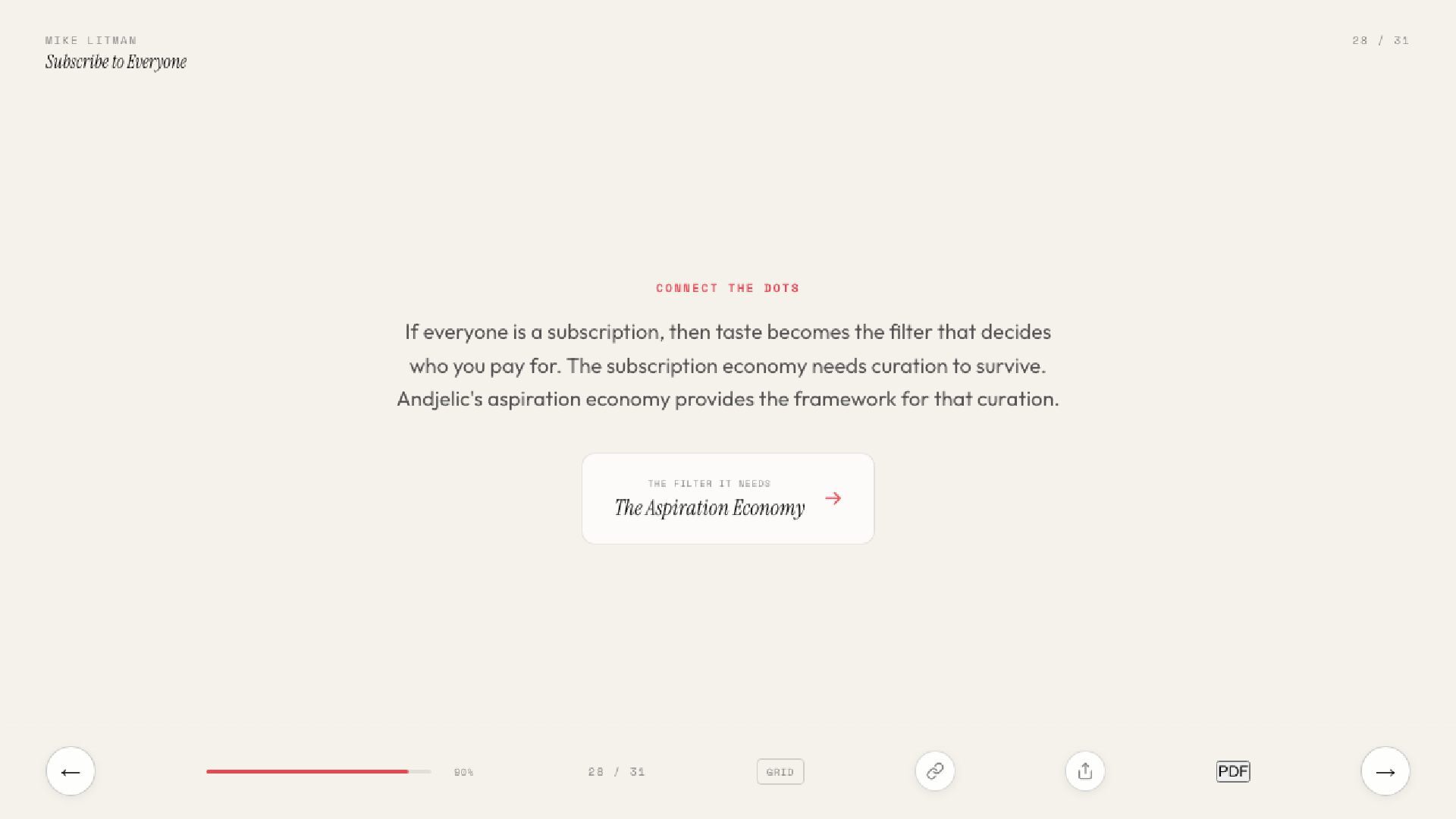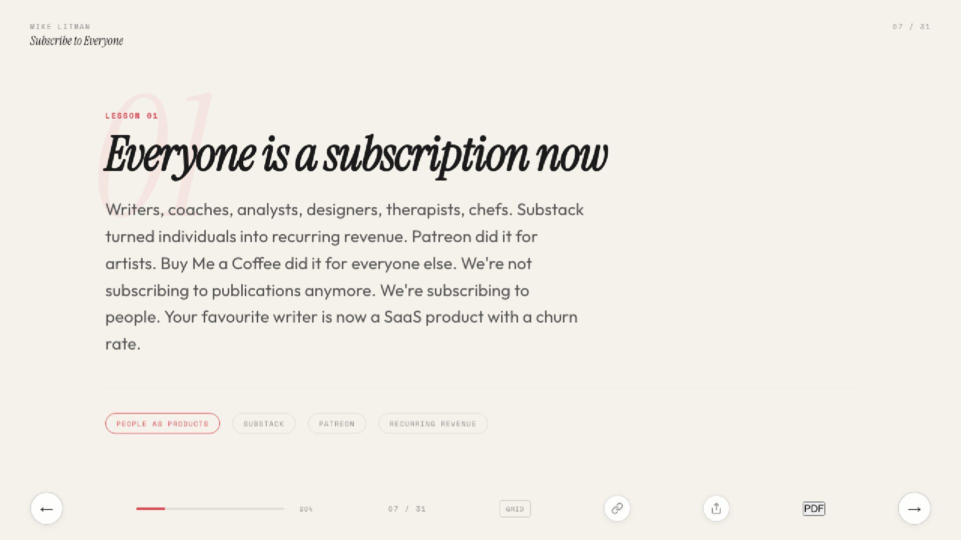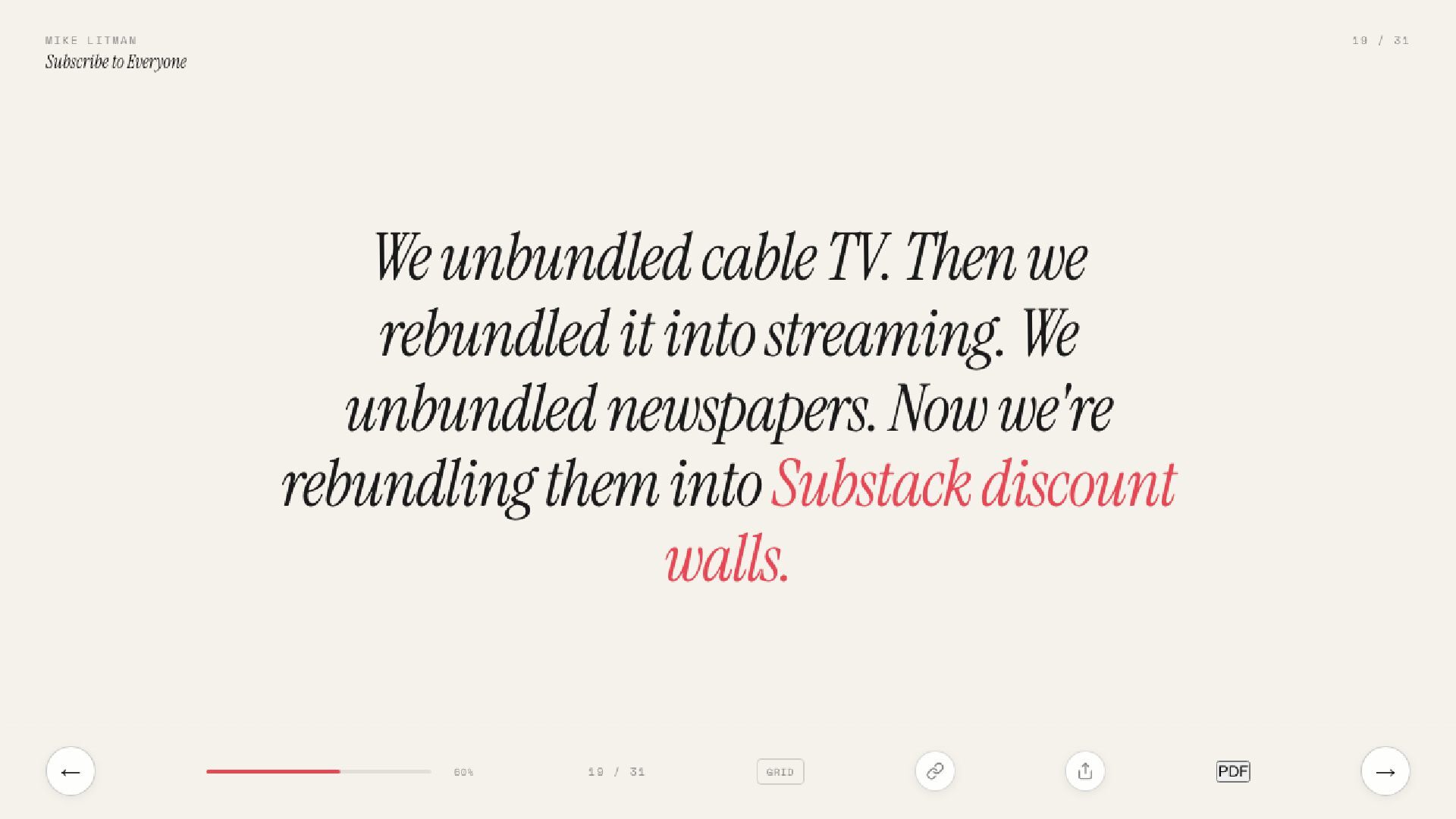 Is everything a subscription now? Is everyone? 29 slides on how we got here, why the discount wall is the new cable bundle, and where the subscription-to-people economy goes next.